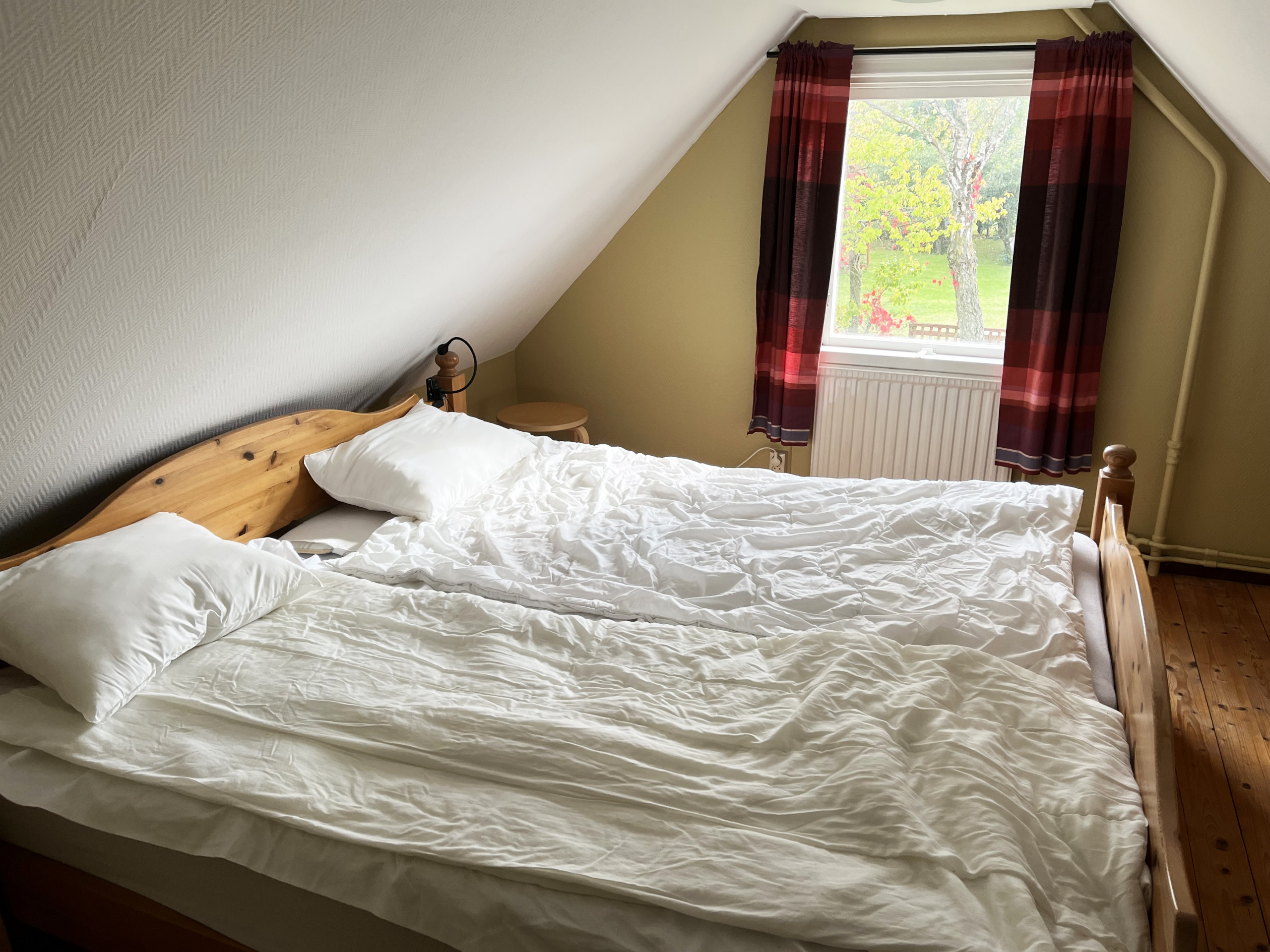 In diesem gemütlichen Haus finden Sie ein schönes Gefühl der Ruhe. Im Wohnzimmer gibt es eine bequeme Sofagruppe und einen Esstisch und daneben befindet sich die schöne Glasveranda, auf der Sie abends sitzen können. Die Küche ist mit einem Herd, einem Kühl-/Gefrierschrank und einem funktionierenden Holzofen ausgestattet, den Sie bei Bedarf zum Anzünden eines Feuers nutzen können. Das Badezimmer wurde kürzlich renoviert und ist in gutem Zustand. Im Erdgeschoss finden Sie ein Schlafzimmer mit einem Etagenbett. Es gibt auch ein zusätzliches Zimmer mit einem Einzelbett, falls jemand in der Gruppe etwas getrennter schlafen möchte. Im Obergeschoss befinden sich die beiden anderen Schlafzimmer. Eines verfügt über ein Doppelbett und das andere über zwei Einzelbetten. Hier ist die Deckenhöhe niedriger als normal.