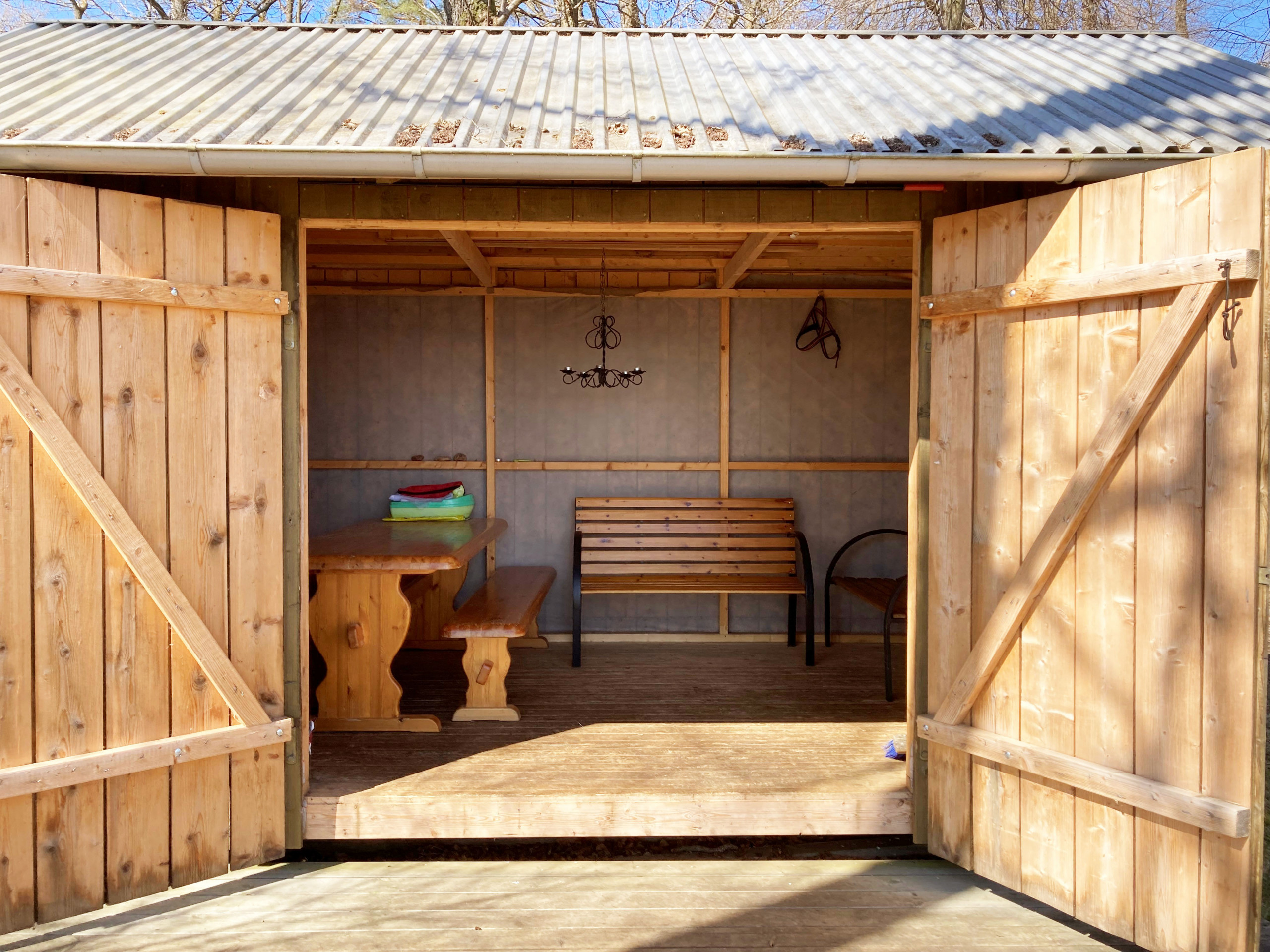Unten am See befindet sich ein kleiner möblierter Abstellraum, in dem Sie Ihre Angelausrüstung aufbewahren und bei Regen unter einem Dach sitzen können.