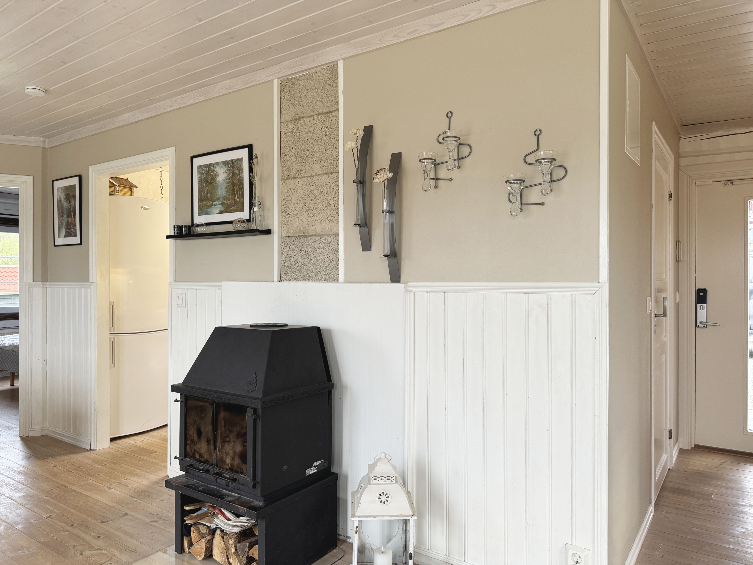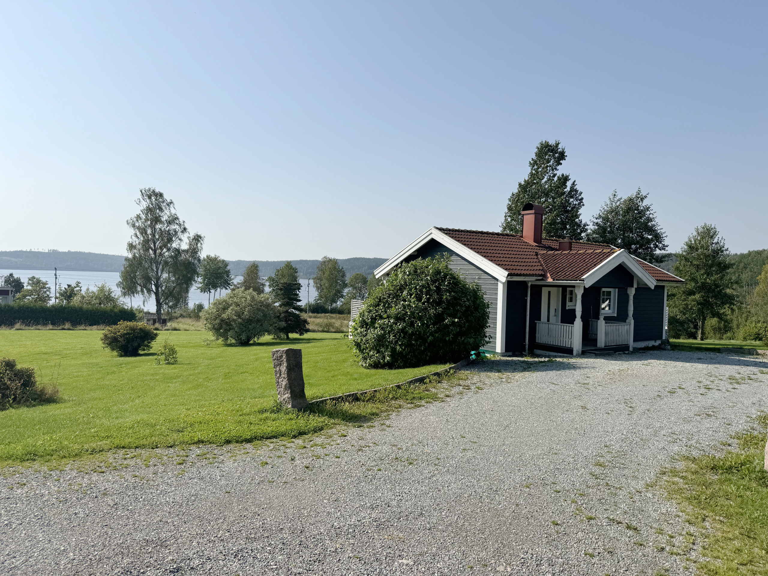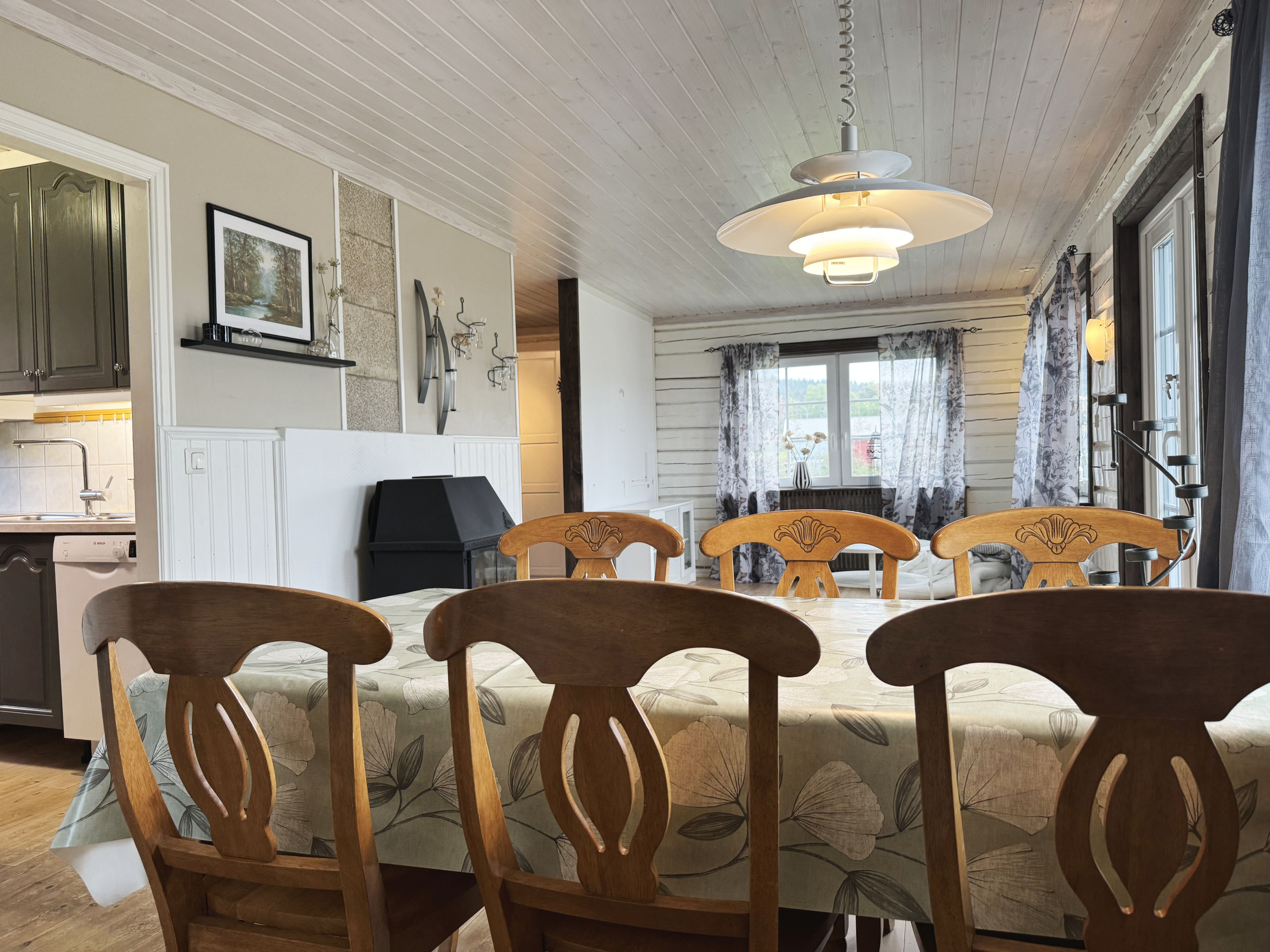 Innen ist es offen gehalten und Sie kommen vom Eingang über die Küche ins Wohnzimmer und haben aus allen diesen Räumen einen herrlichen Blick auf den See und die Sauna. Zum See Teåkersjön sind es nur 75m und hier gibt es viel Fisch.