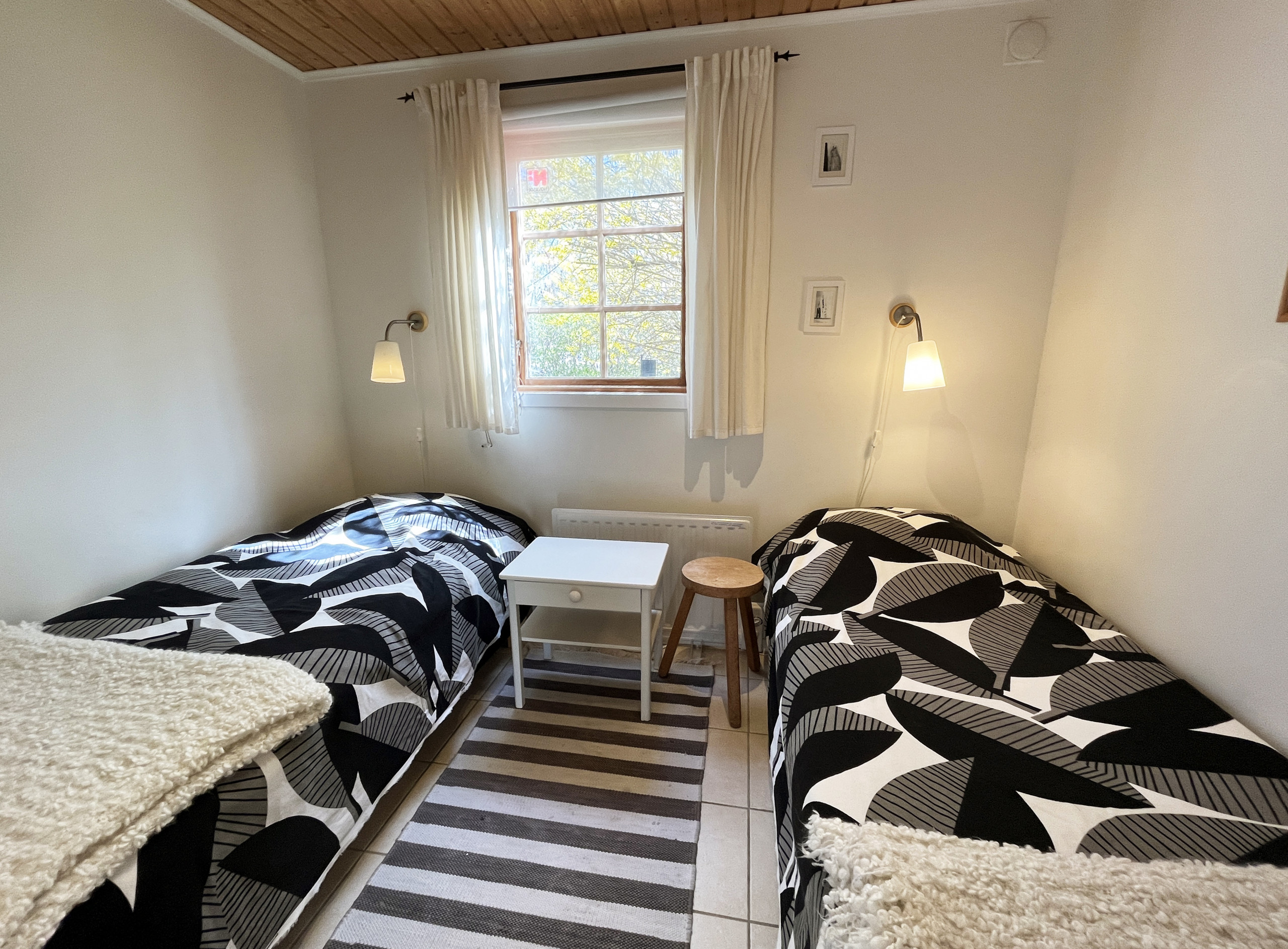 Das Ferienhaus bietet Platz für bis zu fünf Personen und verfügt über zwei Schlafzimmer, die jeweils mit zwei Einzelbetten ausgestattet sind. Die Küche ist komplett ausgestattet mit Herd, Backofen, Kühl-/Gefrierschrank, Mikrowelle und Geschirrspüler. Außerdem gibt es einen Esstisch mit einer bequemen Bank und Stühlen. Im gemütlichen, klimatisierten Wohnzimmer gibt es ein Schlafsofa, einen Couchtisch, zwei Sessel und einen Smart-TV mit Satellitenempfang mit schwedischen und deutschen Kanälen sowie eine Tür zum Garten. Das komplett geflieste Badezimmer verfügt sowohl über eine Dusche als auch über eine Toilette. Im angrenzenden Nebengebäude finden Sie die Sauna mit teilweise Meerblick, Dusche, WC, Waschmaschine und Wäschetrockner.