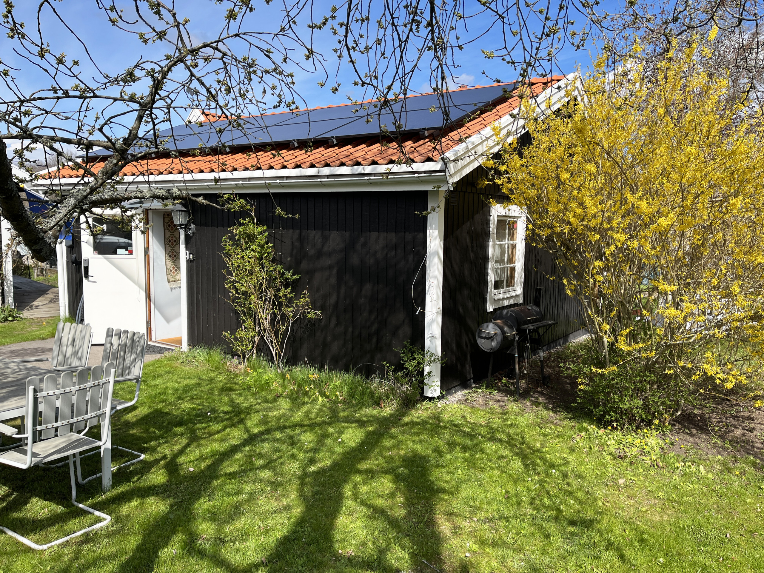 Das Haus besteht aus einem gemütlichen Wohnzimmer, das mit einem Esstisch und einer bequemen Sofagruppe sowie einem Fernseher ausgestattet ist. Daneben befindet sich ein Schlafzimmer mit einem Einzelbett und einer Toilette. Vom Wohnzimmer aus gelangt man dann über einen begehbaren Raum in die Küche, die mit einer Schlafcouch und einem Sessel ausgestattet ist. Die Küche ist praktisch und gut ausgestattet für Ihren Aufenthalt. Von hier aus gelangt man in das zweite Schlafzimmer, das mit einer Schlafcouch ausgestattet ist und Zugang zum Garten hat. Im schönen Anbau finden Sie ein Doppelbett, ein Schlafsofa sowie eine Dusche und ein WC. Die Dusche/WC ist auch von außen erreichbar. Am Eingang finden Sie eine möblierte überdachte Terrasse, auf der Sie tagsüber sitzen und entspannen können. Auch im kleinen Garten haben Sie Zugang zu einer Outdoor-Gruppe, in der Sie Ihr Frühstück oder Abendessen einnehmen können. Hier wohnen Sie gut in einer schönen Gegend und in der Nähe von Färjestaden