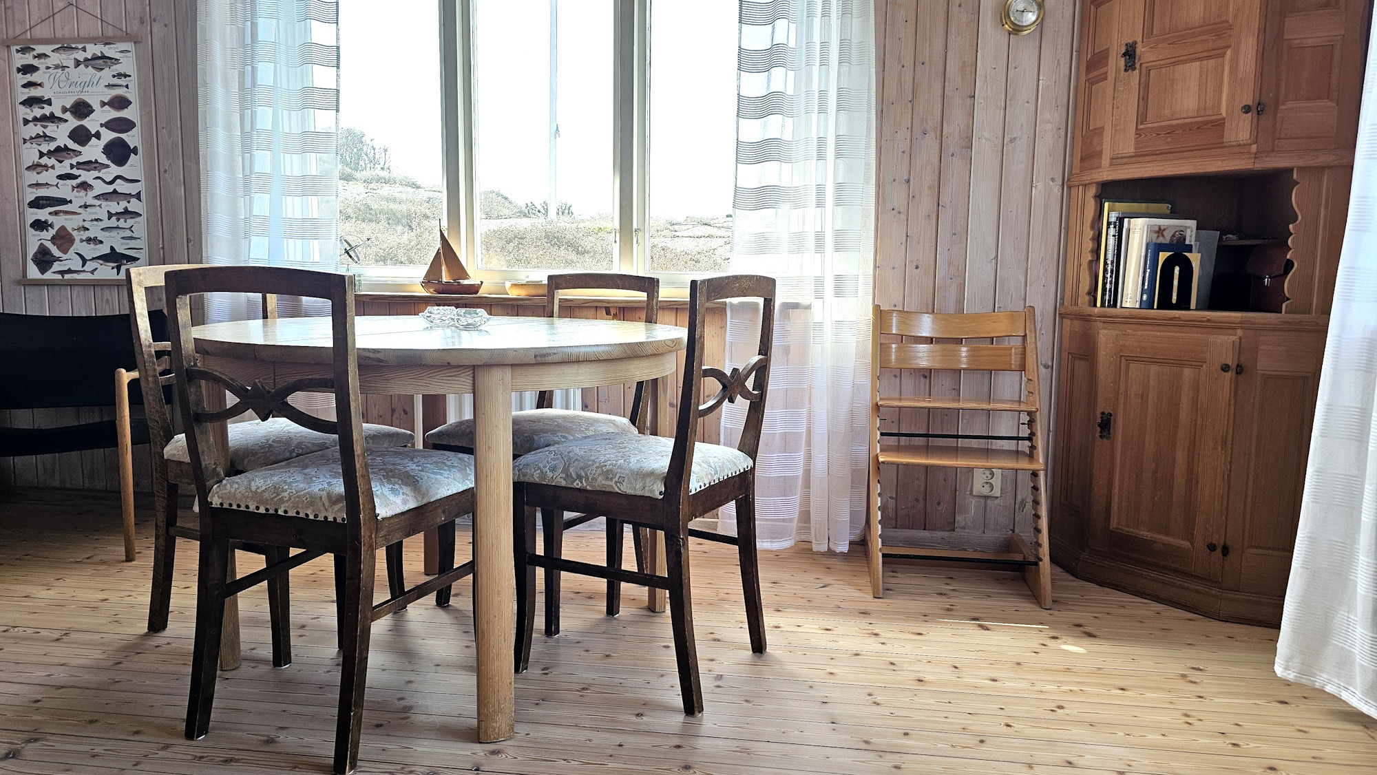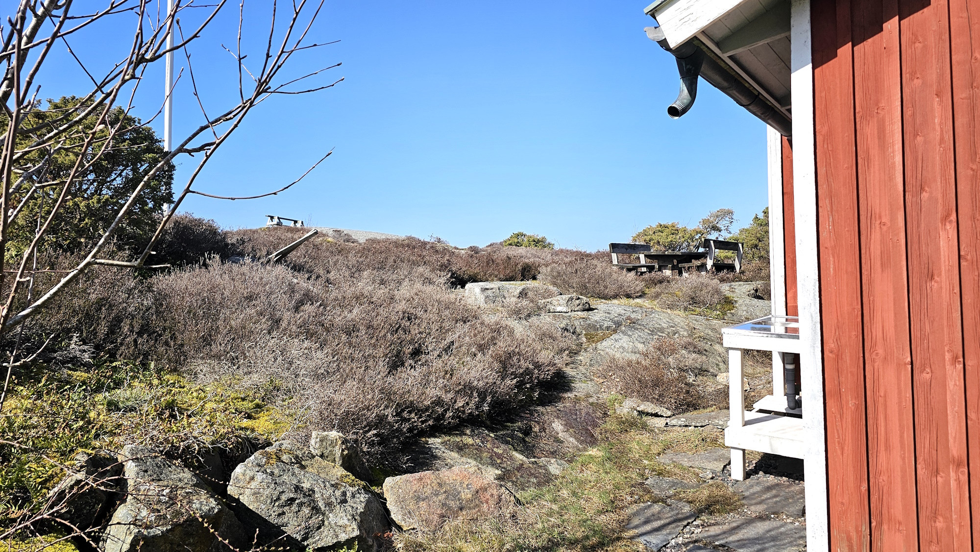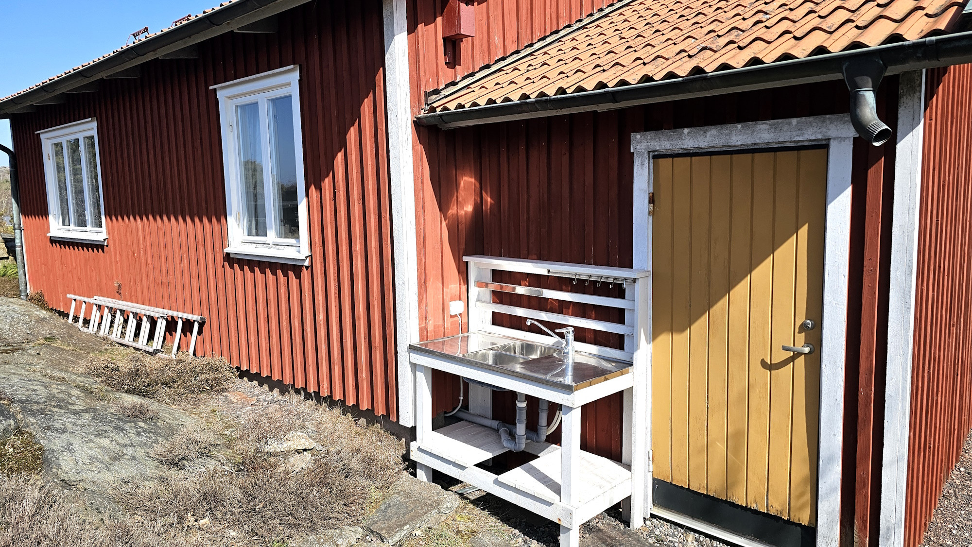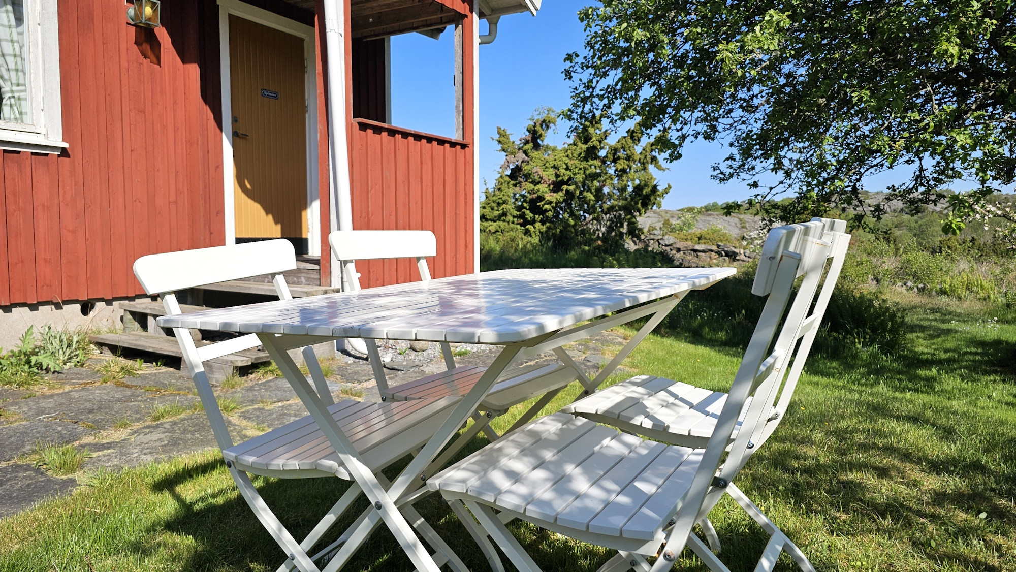Das Grundstück bietet echtes Bohuslän-Flair mit Heide, Felsen und einem kleinen Teich direkt hinter dem Haus. Es gibt mehrere Sitzmöglichkeiten im Freien – klassische Holzbänke sowie eine kleine Außenküche für einfache Mahlzeiten. Vor dem Haus laden Gartenmöbel mit Sonnenschirm und Grill zu langen Sommerabenden bei Sonnenuntergang ein.