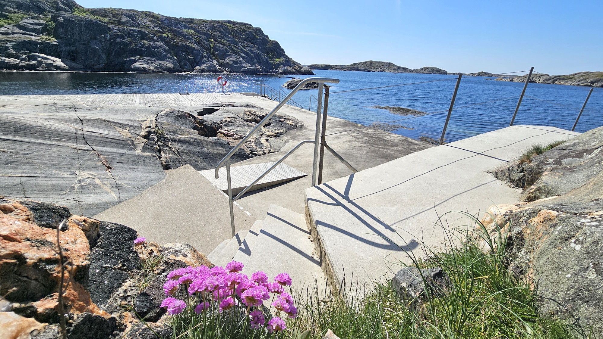 Nach einem kurzen Spaziergang von ca. 400 Metern erreichen Sie den Strand und das Meer. Dort befindet sich ein Bootshaus mit Essbereich, wo Sie direkt am Wasser einen Kaffee genießen oder essen können. Dank Steg und Klippen bietet sich beste Bademöglichkeit.
