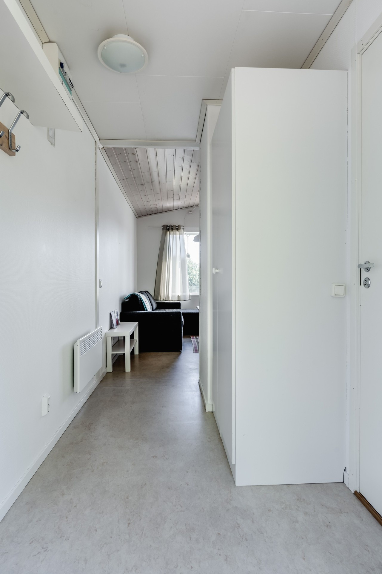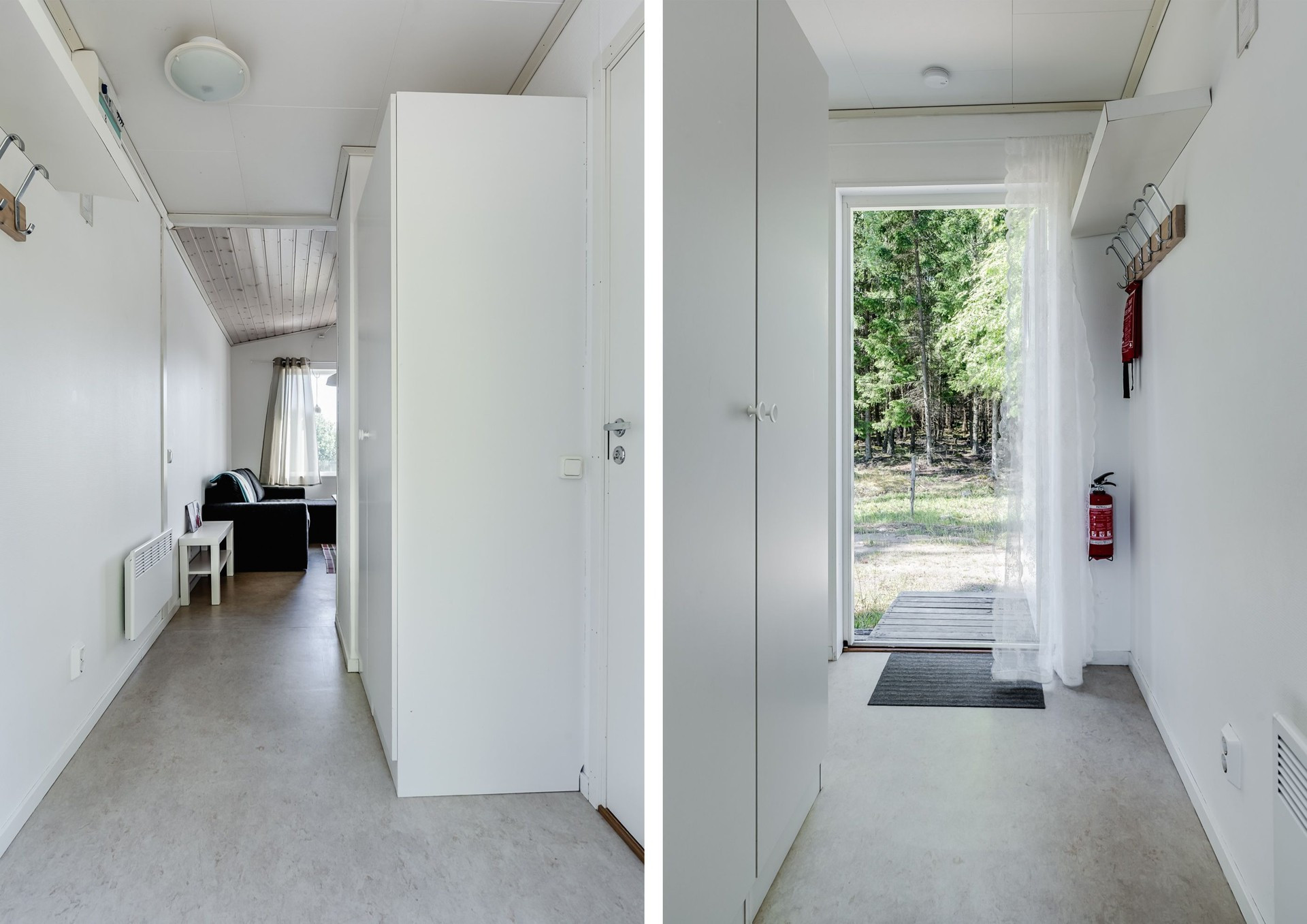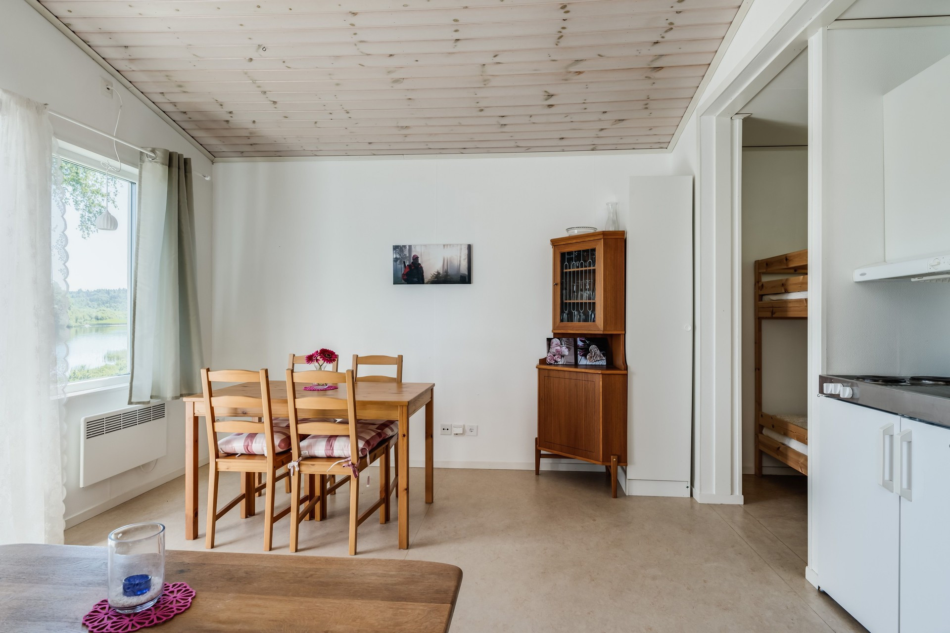 In der Hütte gibt es eine Kochnische und ein Etagenbett in einem durch einen Vorhang abgegrenzten Raum. Im Wohnzimmer befindet sich ein Schlafsofa, während Sie im Badezimmer Zugang zu einer Dusche und einem WC haben. Das Wasser enthält einen hohen Eisengehalt, der zu rötlichen Ablagerungen im Badezimmer führen kann.