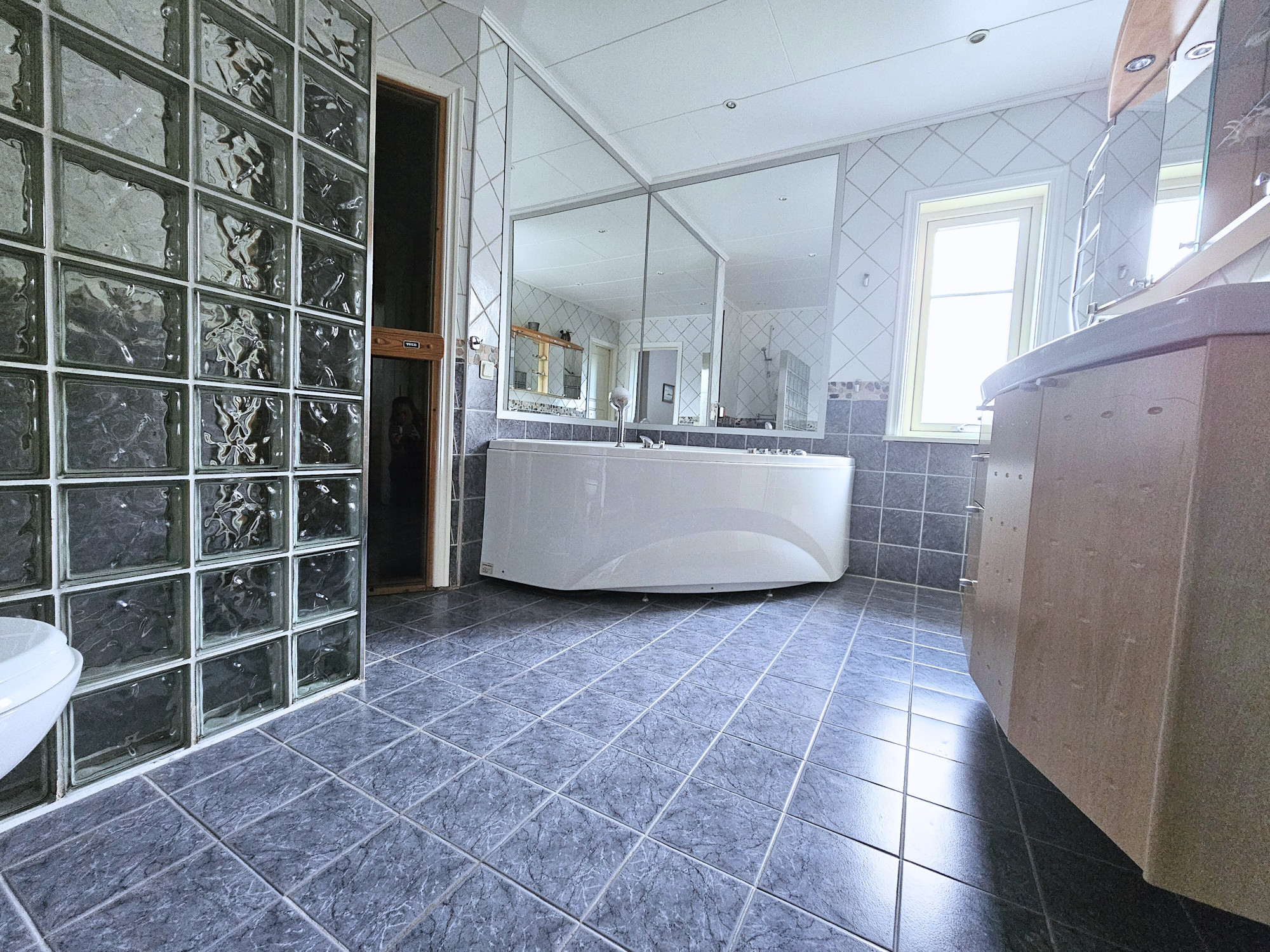 Das Haus verfügt über zwei vollständig geflieste Badezimmer, eines davon mit Whirlpool Badewanne (Eckbadewanne mit Bubble und Jet Funktion) und Sauna, perfekt zum Entspannen nach einem Tag am Meer.
