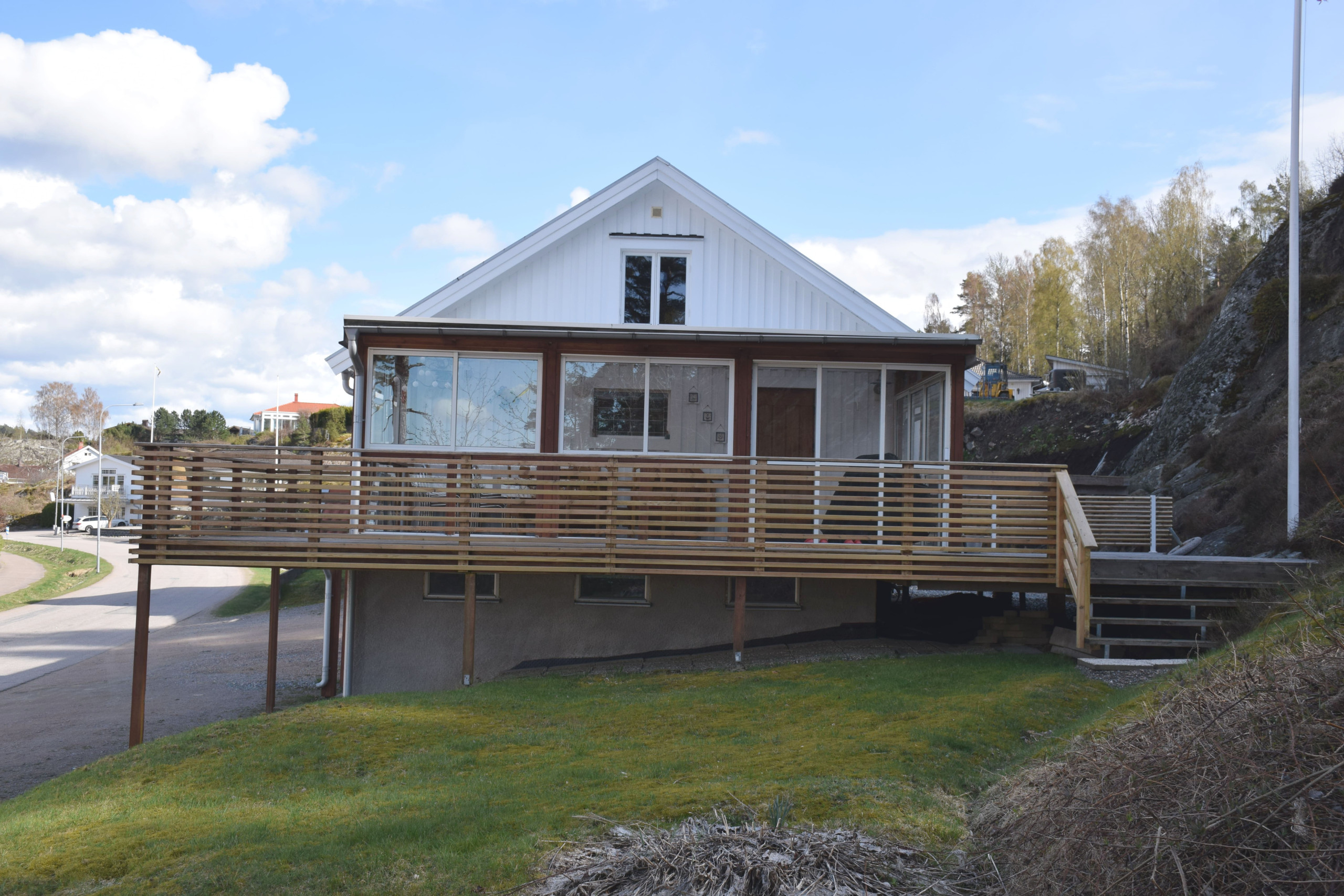 Willkommen in einem komfortablen Ferienhaus für bis zu 9 Gäste – ideal für Familien oder Gruppen, die in Meeresnähe und zugleich zentrumsnah wohnen möchten. Nur 300 Meter trennen Sie vom beliebten Badeplatz Småholmarna, und Geschäfte wie Sushi, Pizzeria, Fischladen, Eisdiele und Supermarkt sind bequem zu Fuß erreichbar. Das Haus ist ganzjährig gemütlich eingerichtet und bietet vier Schlafzimmer, mehrere Aufenthaltsbereiche und einen großen Wintergarten, in dem die ganze Familie Platz findet. Der Wintergarten dient als zusätzliches Wohnzimmer mit Zugang zur großen Terrasse, die sich um die Hälfte des Hauses erstreckt – perfekt für Grillabende und lange Sommernächte. Im Erdgeschoss befinden sich ein Schlafzimmer mit TV und eine Waschküche. Im mittleren Stock liegen das Wohnzimmer mit großer Sofaecke, ein Schlafzimmer mit Doppelbett und TV, die gut ausgestattete Küche sowie das Badezimmer mit Dusche. Im Obergeschoss gibt es ein gemütliches Loft (mit Stehhöhe in der Mitte), ein weiteres Schlafzimmer und einen kleinen Meerblick. Mehrere Fernseher, WLAN, Geschirrspüler und Waschmöglichkeiten sorgen für einen angenehmen Aufenthalt – und Sie parken direkt vor der Tür.