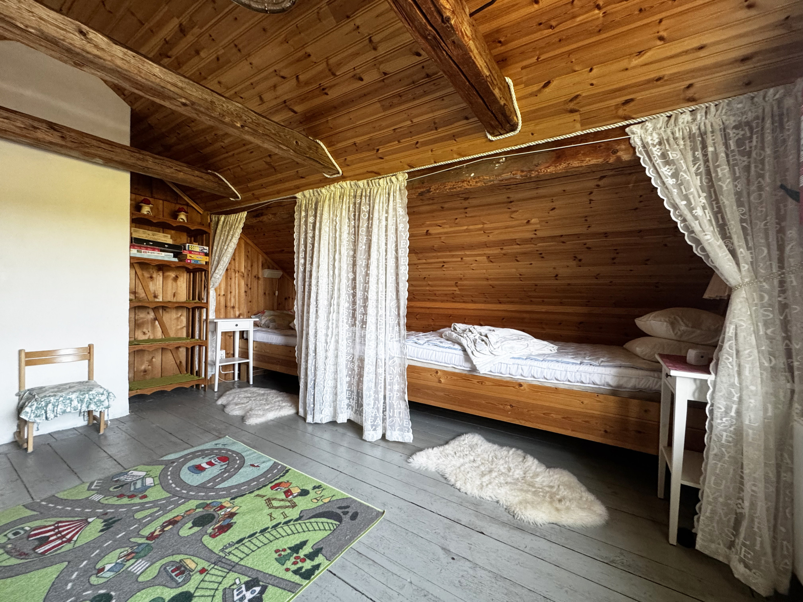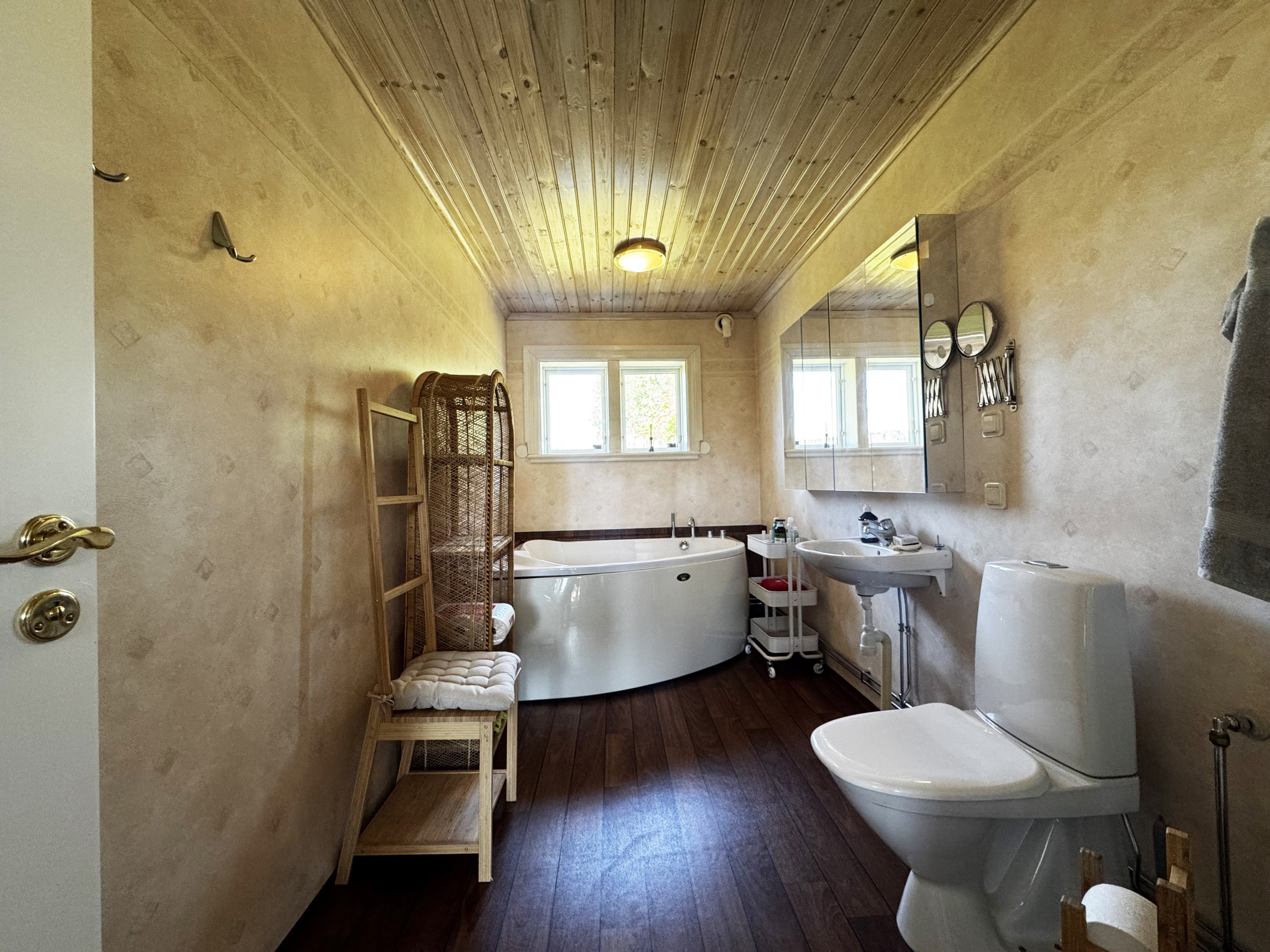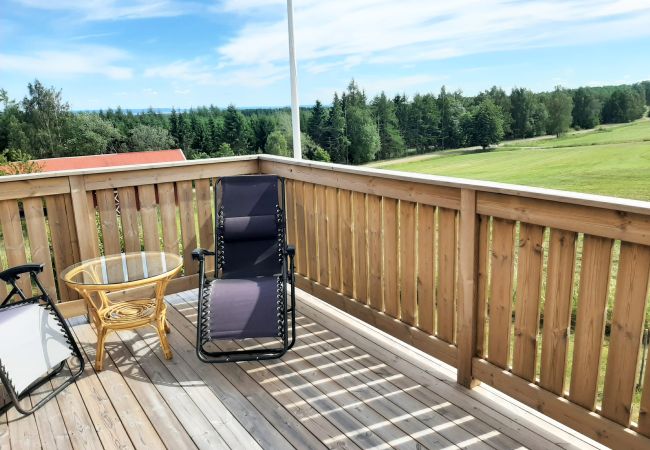 Im Obergeschoss befinden sich ein Durchgangszimmer mit drei Betten und ein gemütliches Schlafzimmer mit Doppelbett und direktem Zugang zum Balkon mit herrlichem Blick auf die wunderschöne Landschaft – und bei klarem Wetter können Sie in der Ferne den Vätternsee erblicken.