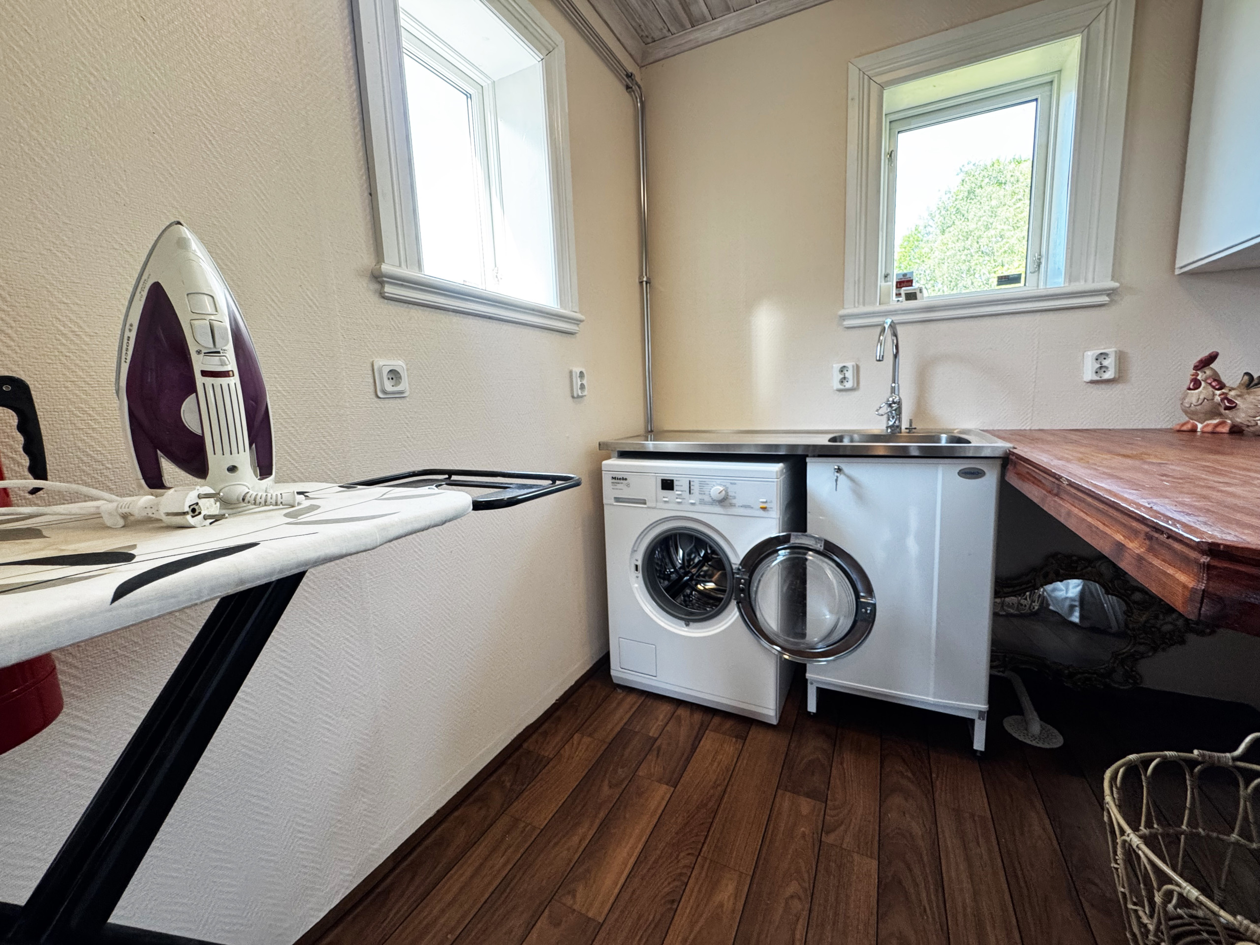 Im Eingangsbereich befinden sich eine ältere, aber voll funktionsfähige Küche mit Geschirrspüler und eine praktische Waschküche mit Trockenmöglichkeit. Das geräumige Wohnzimmer bietet einen wärmenden Holzofen, stilvolle Rokokomöbel und ein bequemes Hochbett zum Entspannen.Large bathroom with bathtub and separate shower