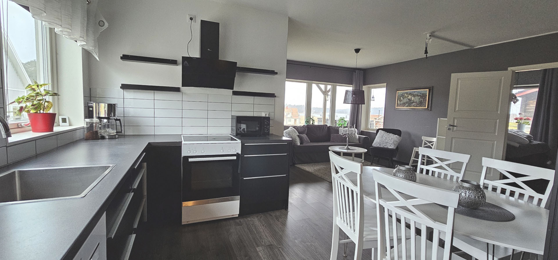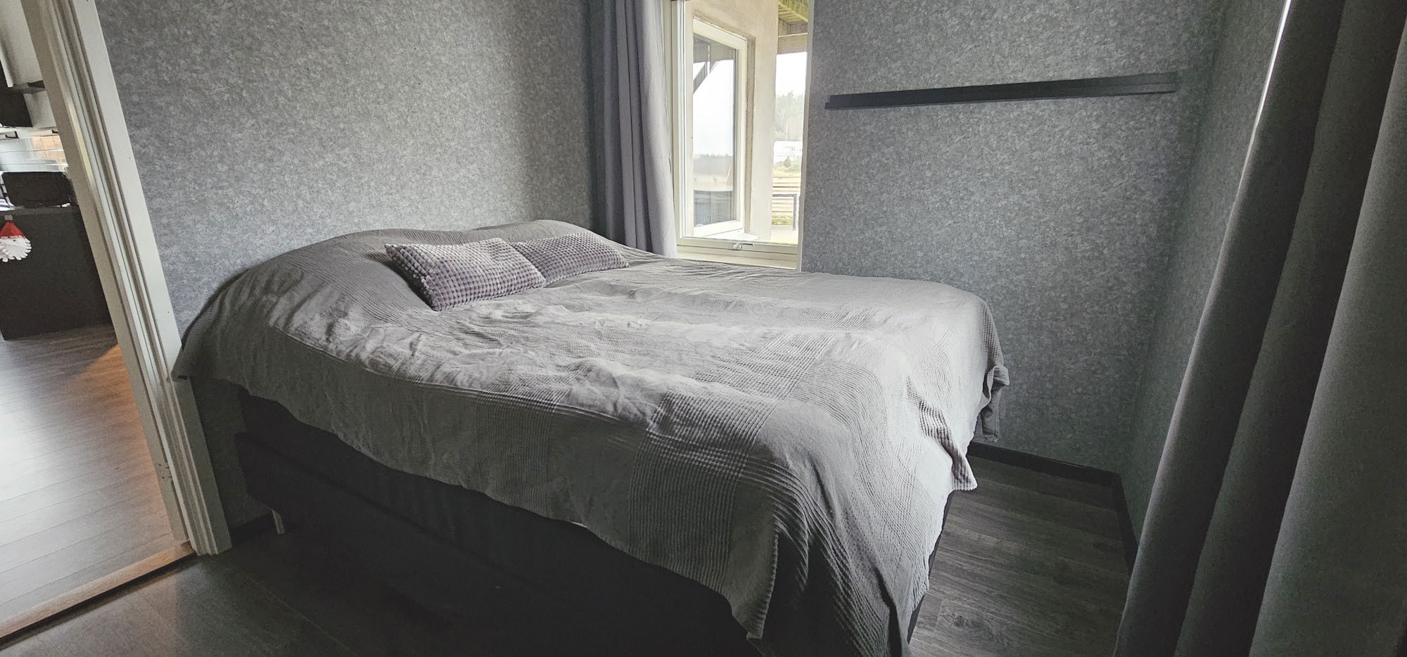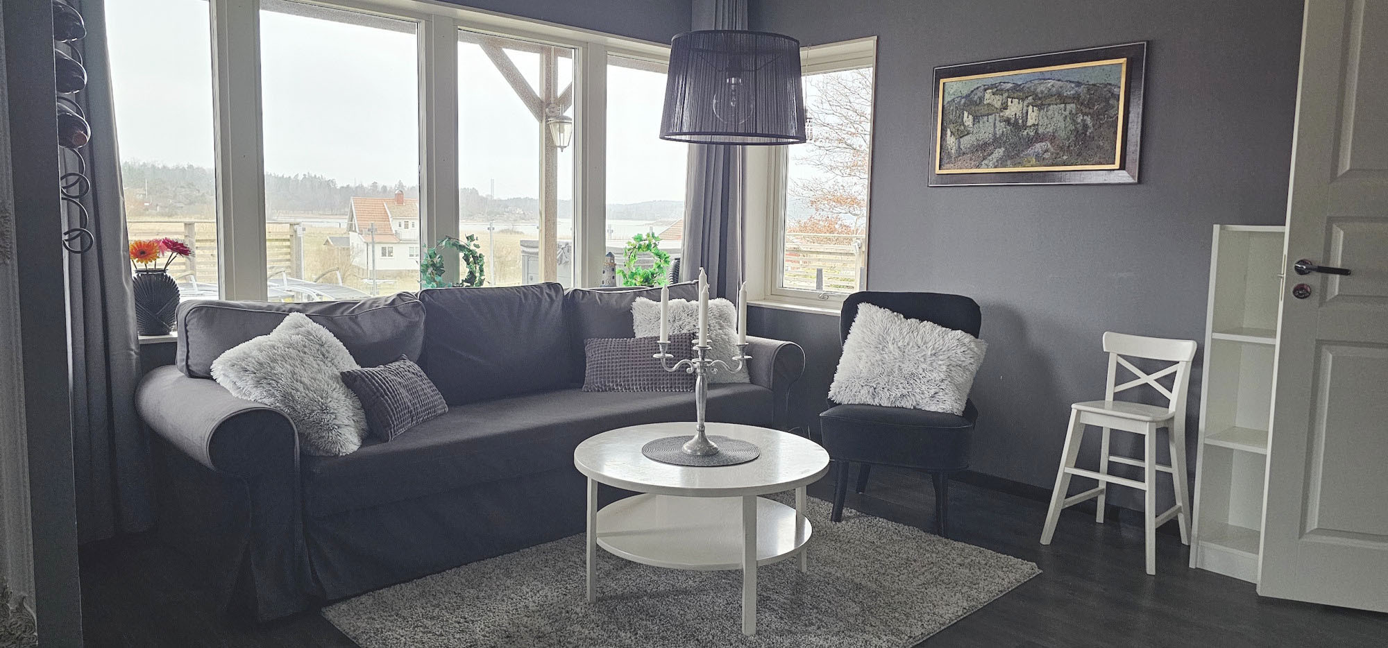 Das Haus ist sehr geräumig und hell, mit Fenstern in drei Richtungen. Durch den offenen Grundriss verteilt sich die Luft der Luft-Wärmepumpe ungehindert und verleiht dem gesamten Ferienhaus die gewünschte Temperatur. Im großen Zimmer steht eine Doppelschlafsofa, sowie ein Doppelbett, das mit Verdunklungsvorhängen leicht abgeschirmt werden kann. Der zweite Teil des Ferienhauses besteht aus dem Flur, dem Bad, der Küche mit Kücheninsel und Essbereich mit fantastischem Blick auf das Meer und die Brücke Tjörnbron.