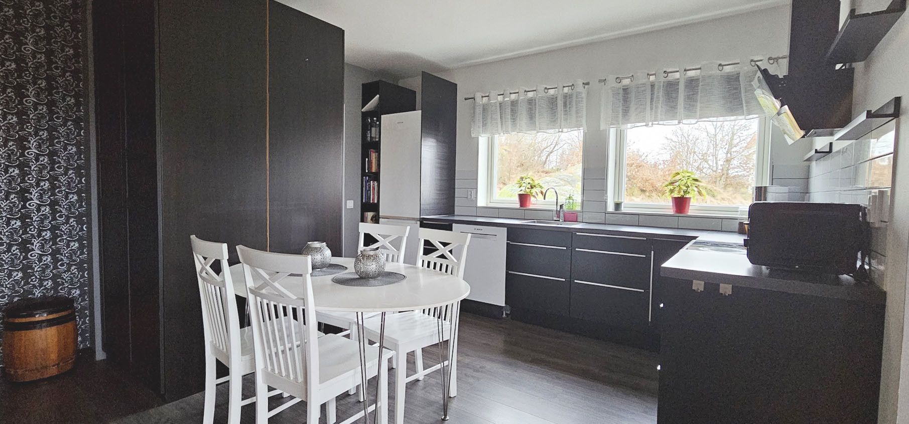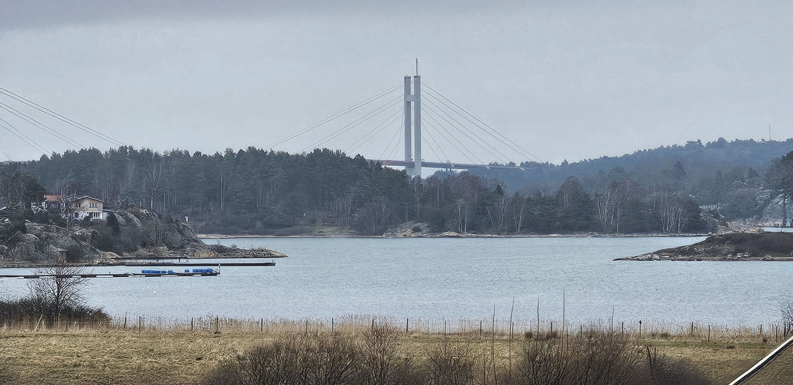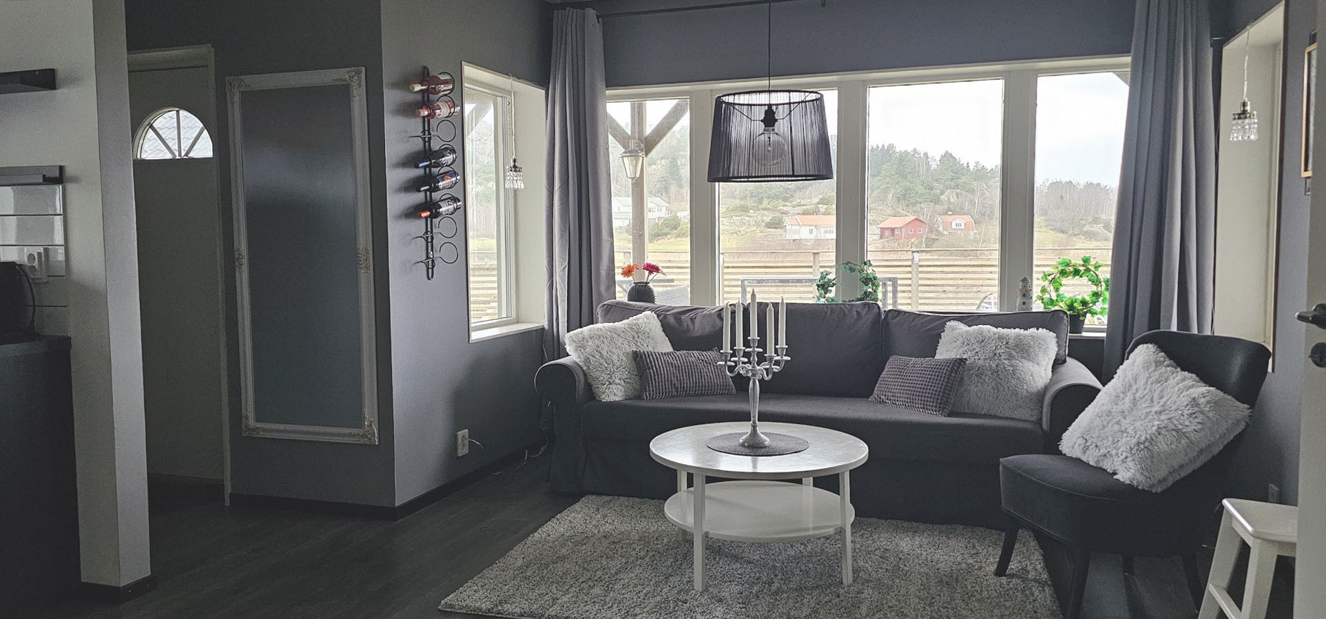 Das Haus ist sehr geräumig und hell, mit Fenstern in drei Richtungen. Durch den offenen Grundriss verteilt sich die Luft der Luft-Wärmepumpe ungehindert und verleiht dem gesamten Ferienhaus die gewünschte Temperatur. Im großen Zimmer steht eine Doppelschlafsofa, sowie ein Doppelbett, das mit Verdunklungsvorhängen leicht abgeschirmt werden kann. Der zweite Teil des Ferienhauses besteht aus dem Flur, dem Bad, der Küche mit Kücheninsel und Essbereich mit fantastischem Blick auf das Meer und die Brücke Tjörnbron.