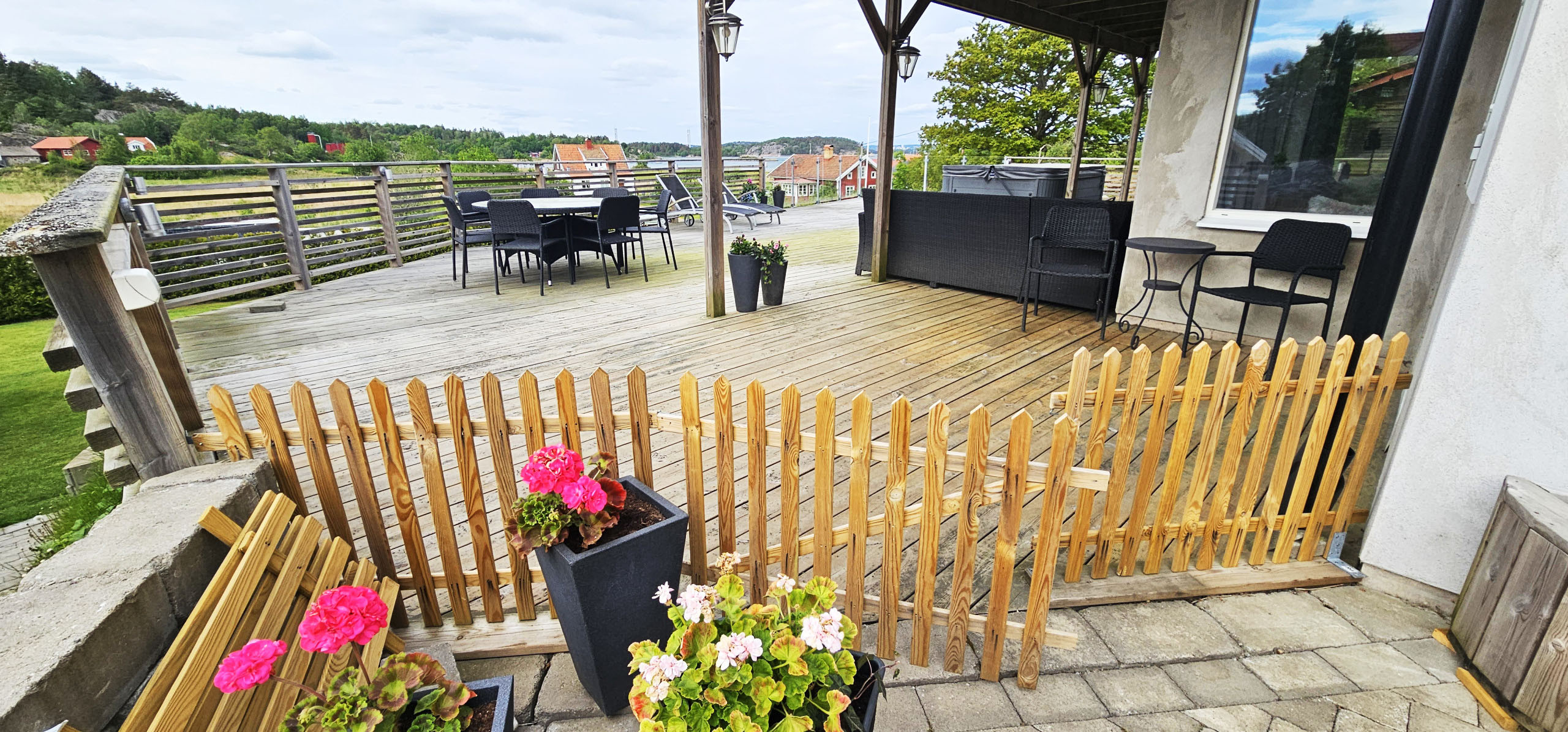 Auf der anderen Seite des Hauses befindet sich eine große Terrasse mit Tisch und Stühlen für 6 Personen, 4 Sonnenliegen und dem Meer direkt vor der Tür. Dort kann man lange sitzen, das Plätschern des Meeres genießen und den vorbeifahrenden Booten zusehen. Neben dem Ferienhaus befindet sich das Gästehaus mit einem großen Doppelbett mit Blick auf den Fjord. Es perfektes Haus für zwei Paare, die gemeinsam Urlaub machen wollen.