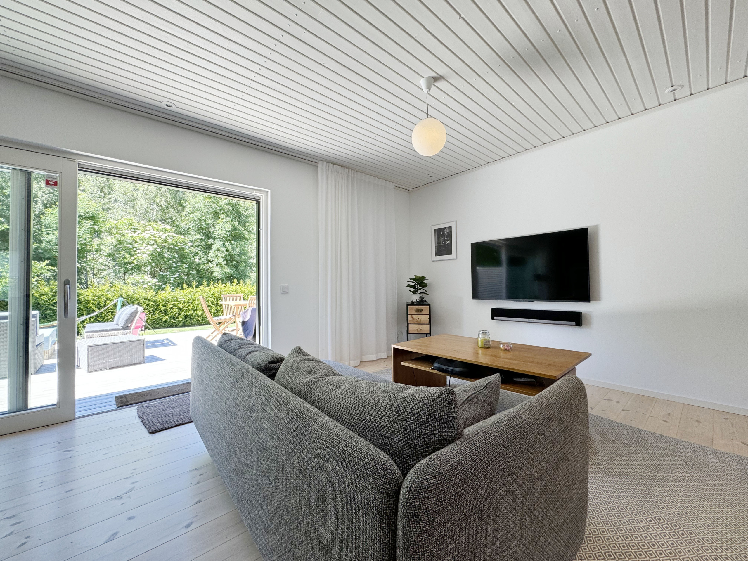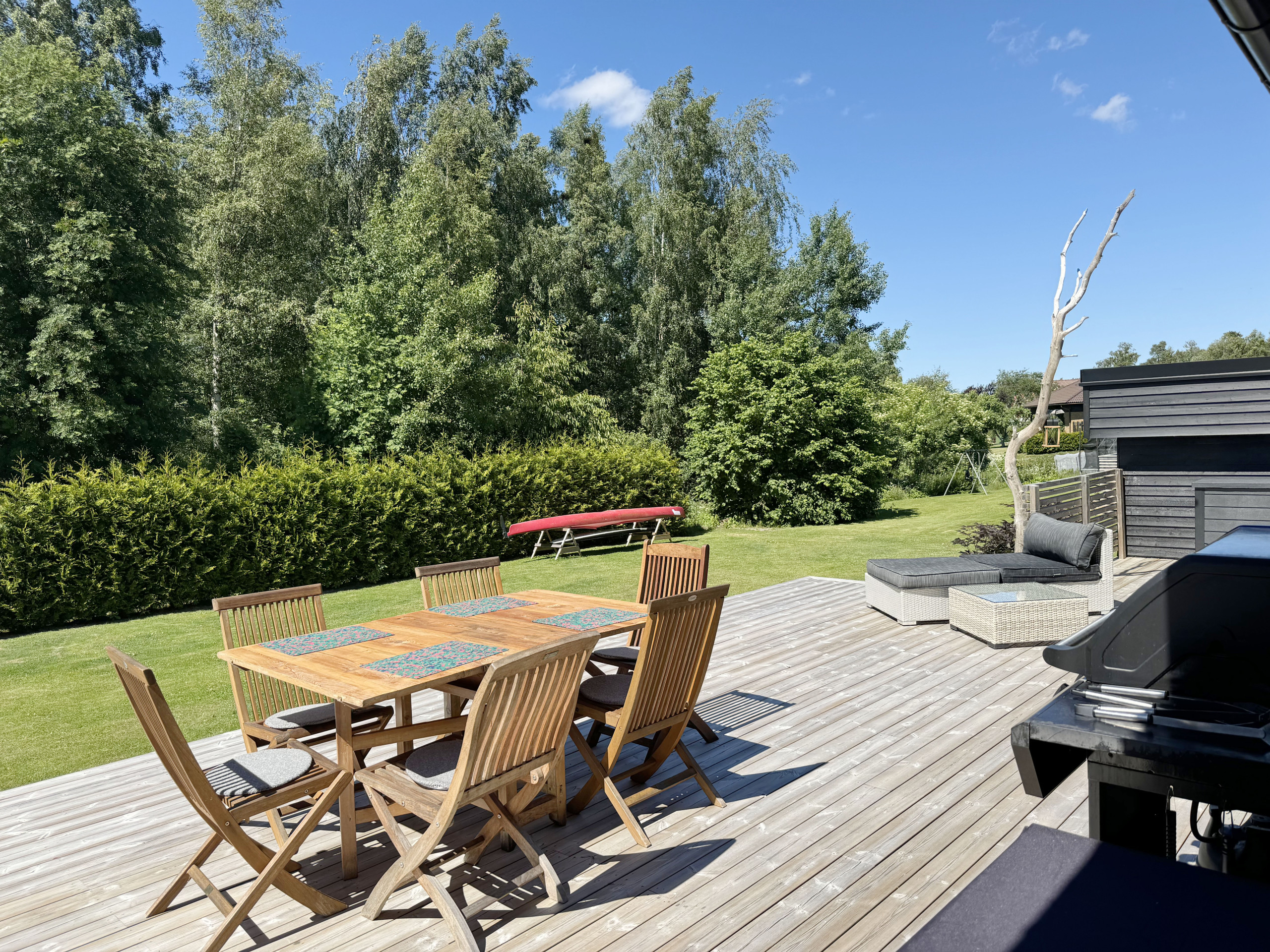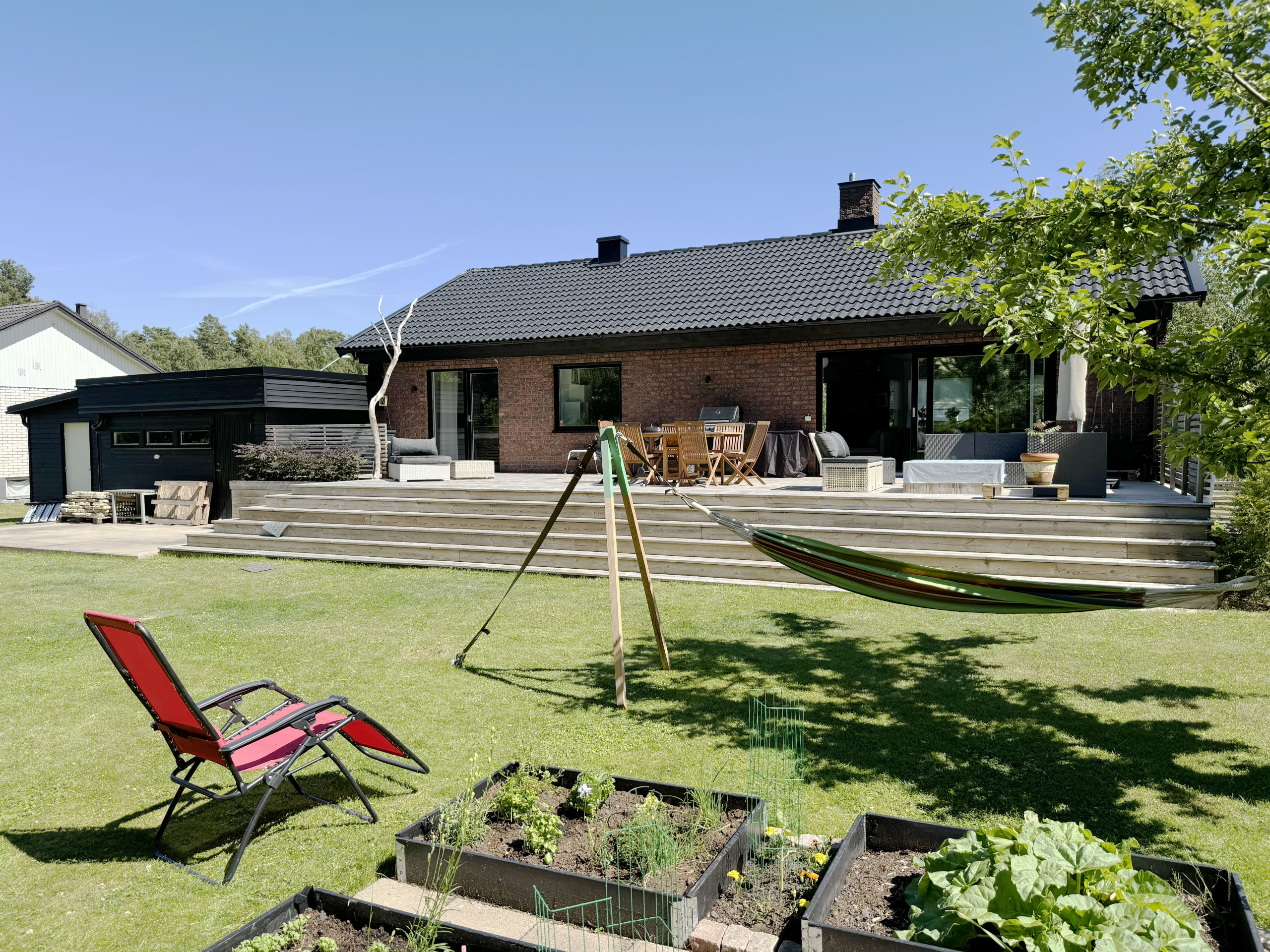 Die Villa liegt eingebettet in einen großen, grünen Garten, der zum Spielen und Entspannen einlädt. Es gibt mehrere geschmackvolle Gartenmöbel, Liegestühle und eine gemütliche Hängematte, wo Sie ruhige Momente in der Natur genießen können. Die großzügige Terrasse ist mit einem Gasgrill ausgestattet, perfekt für schöne Grillabende bei Sonnenuntergang.