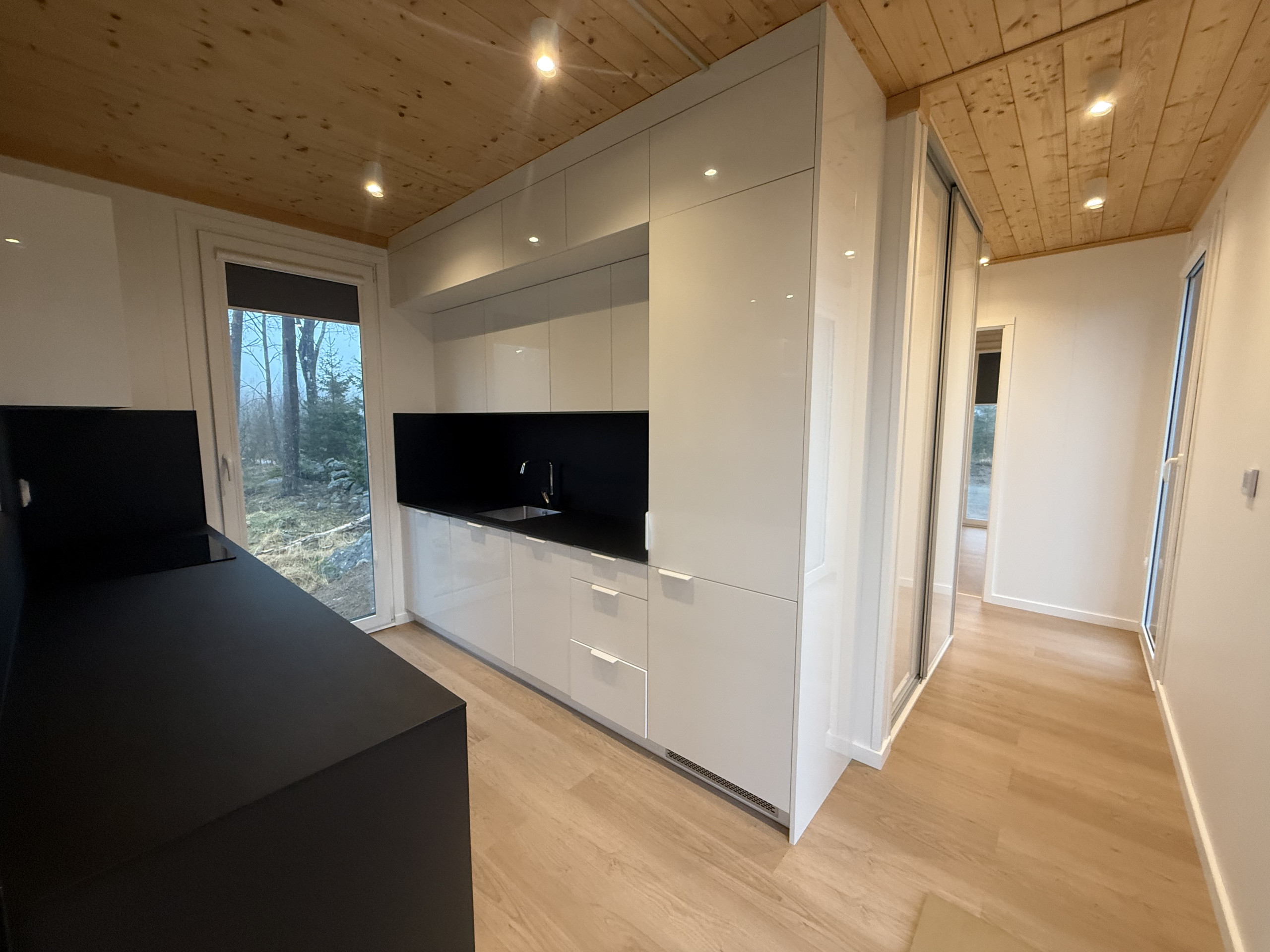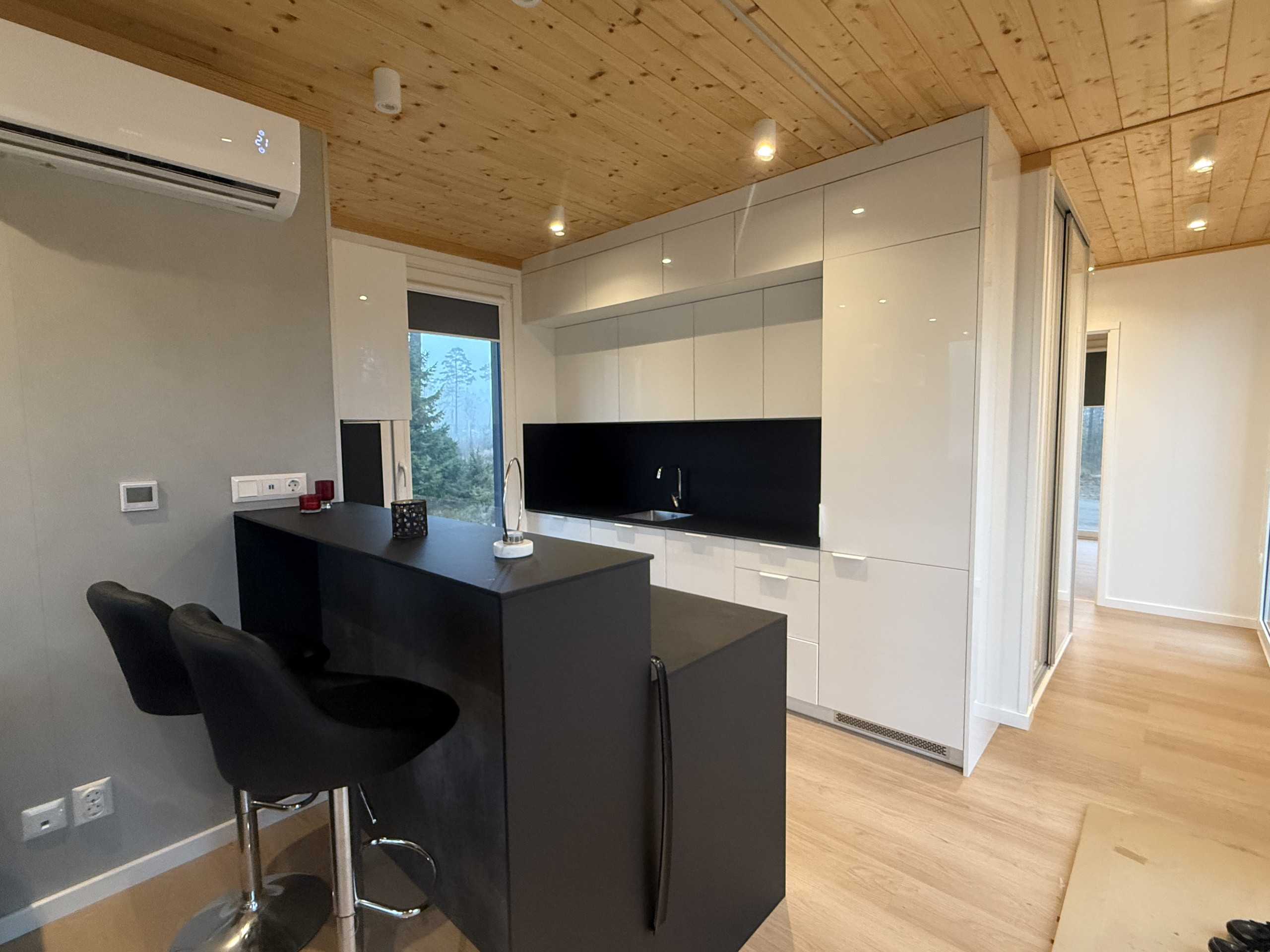 Willkommen in einem brandneuen Ferienhaus, perfekt für einen erholsamen Aufenthalt für bis zu 4 Personen. Die Unterkunft verfügt über zwei Schlafzimmer, eines mit Doppelbett und eines mit Etagenbett, sowie ein Schlafsofa im Wohnzimmer. Es gibt ein frisches Badezimmer mit Dusche und eine voll ausgestattete Küche mit einem Esstisch für 4 Personen. Das Haus liegt direkt am Waldrand und bietet einen fantastischen Ausblick auf Wald und Wiese. Kleinere Terrasse für schöne Sommerabende. Draußen gibt es außerdem eine gepflasterte Terrasse mit Grill und Gartenmöbeln, perfekt zum Entspannen in der Natur.