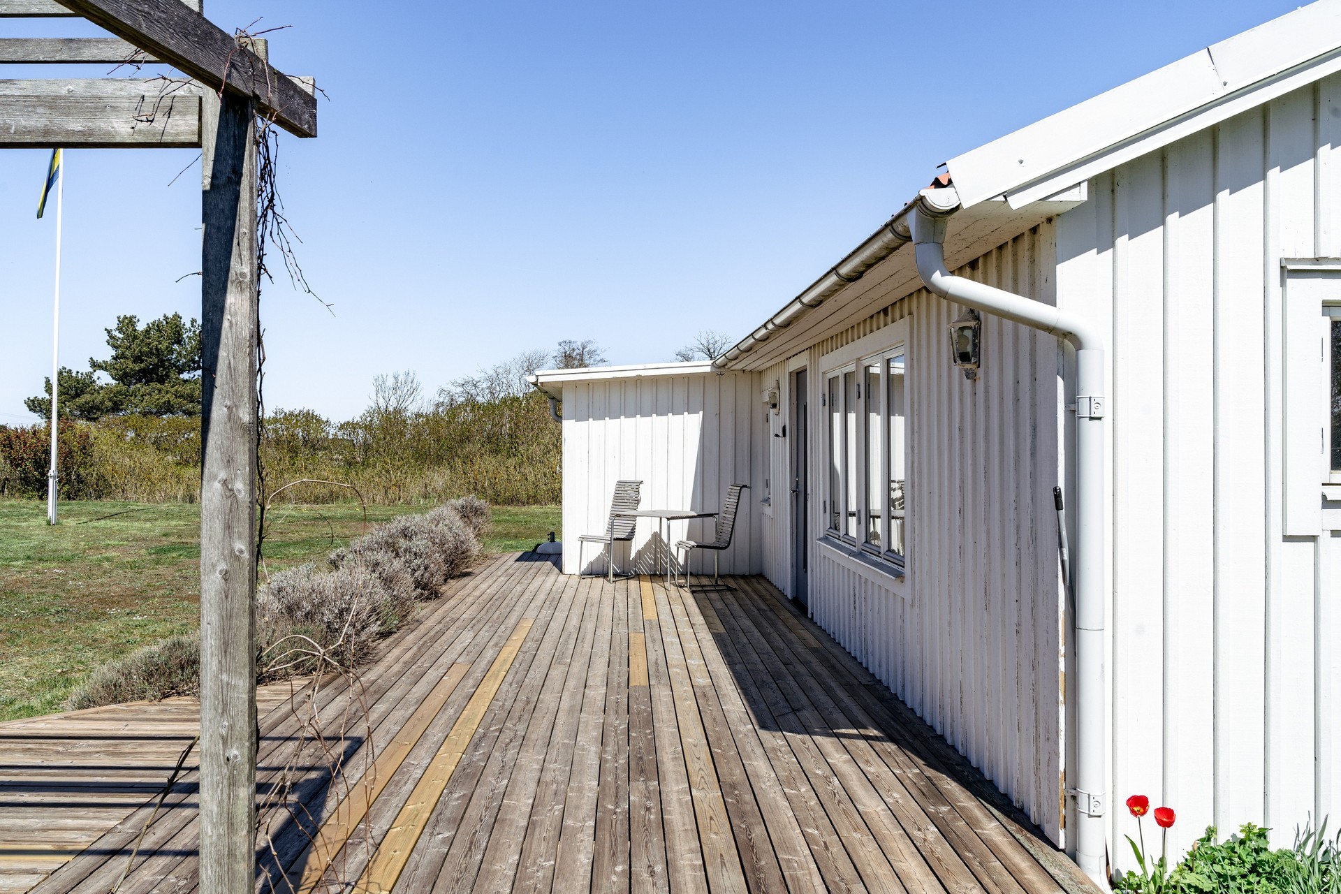 Das Haus bietet drei Zimmer, davon zwei Schlafzimmer - eines mit Doppelbett und das andere, von außen zugängliche, mit zwei Einzelbetten. Das Wohnzimmer ist mit einem Sofa ausgestattet und bietet einen herrlichen Blick auf Felder und Meer. Die gut ausgestattete Küche ist geräumig und hat Zugang zu einer kleinen Terrasse auf der Rückseite des Hauses, wo Sie in der Morgensonne frühstücken können. Das Badezimmer ist mit Toilette, Waschbecken, Duschkabine und Waschmaschine ausgestattet. Sowohl vom Inneren des Hauses als auch von der großen Westterrasse bietet Sie einen schönen Blick auf den Kalmarsund.