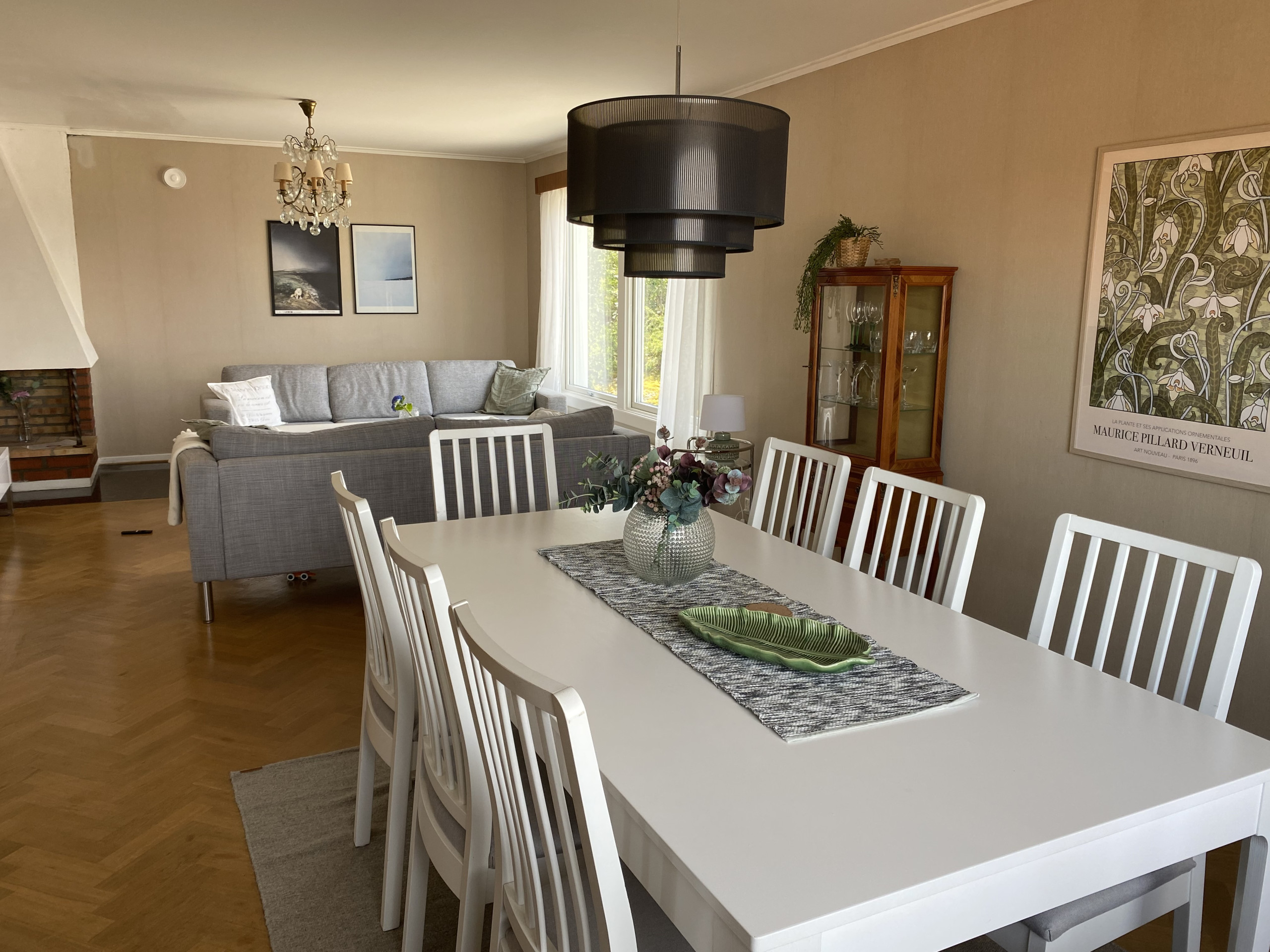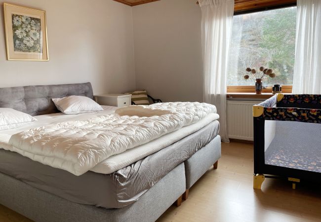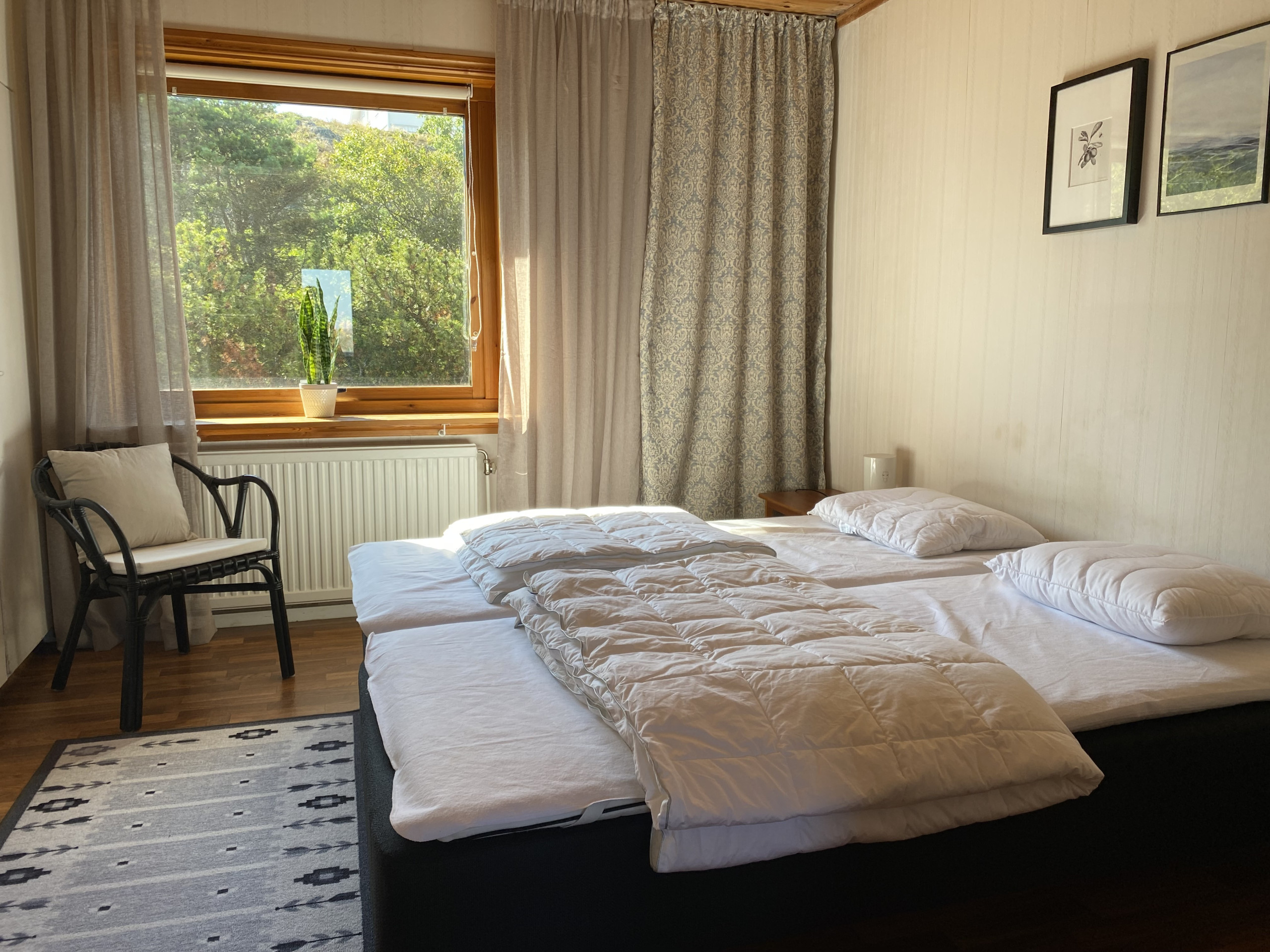 Rustikale, geräumige Villa auf drei Etagen am Fuße des südlichen Tjörn. Sie bietet Platz für zwei Familien. Im Erdgeschoss befinden sich ein Schlafzimmer mit Doppelbett, ein Duschbad mit WC (das bis Sommer 2025 komplett renoviert wird), ein großes, gemütliches Wohnzimmer und Zugang zur Terrasse mit Gartenmöbeln und Grill.
