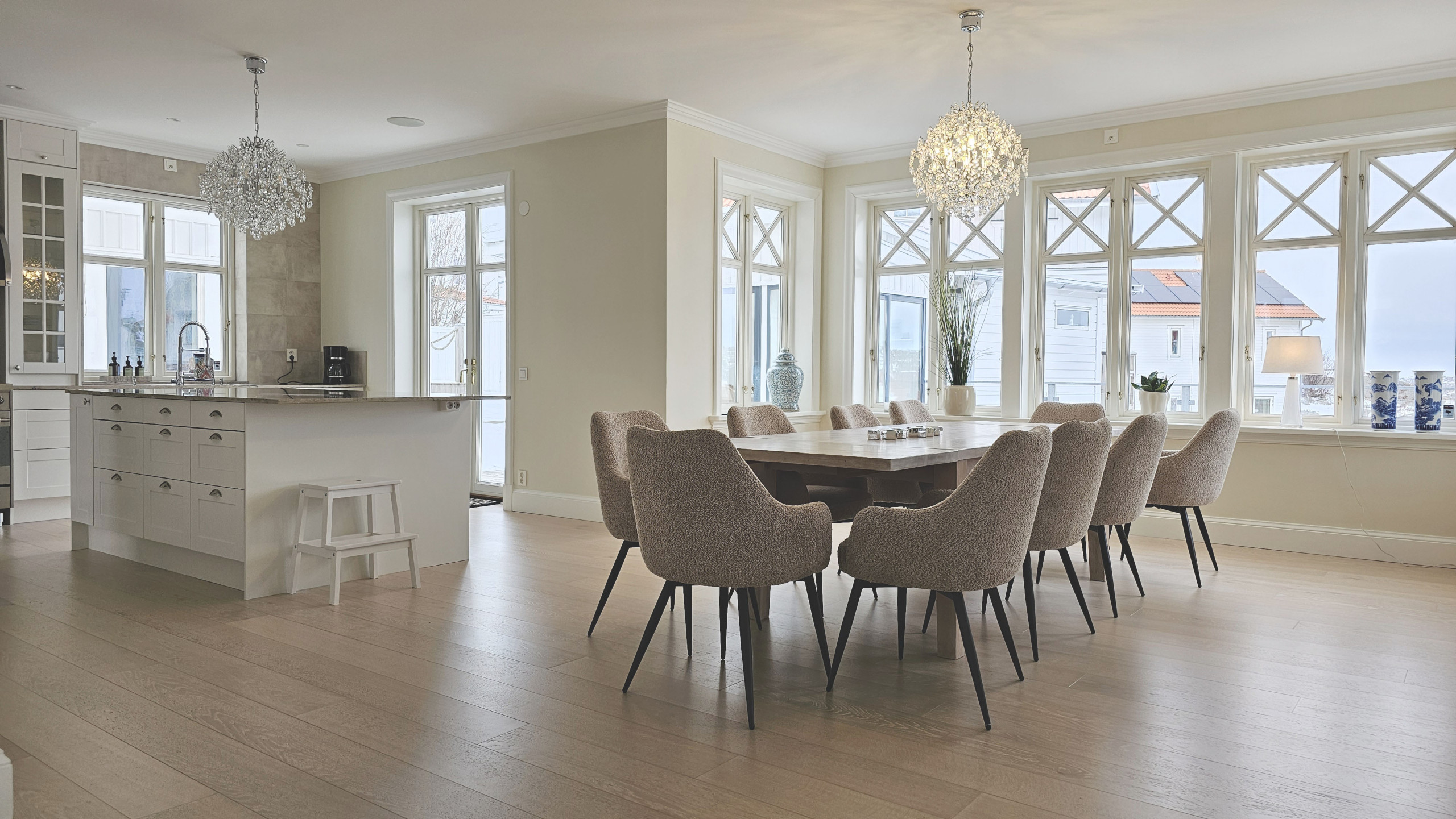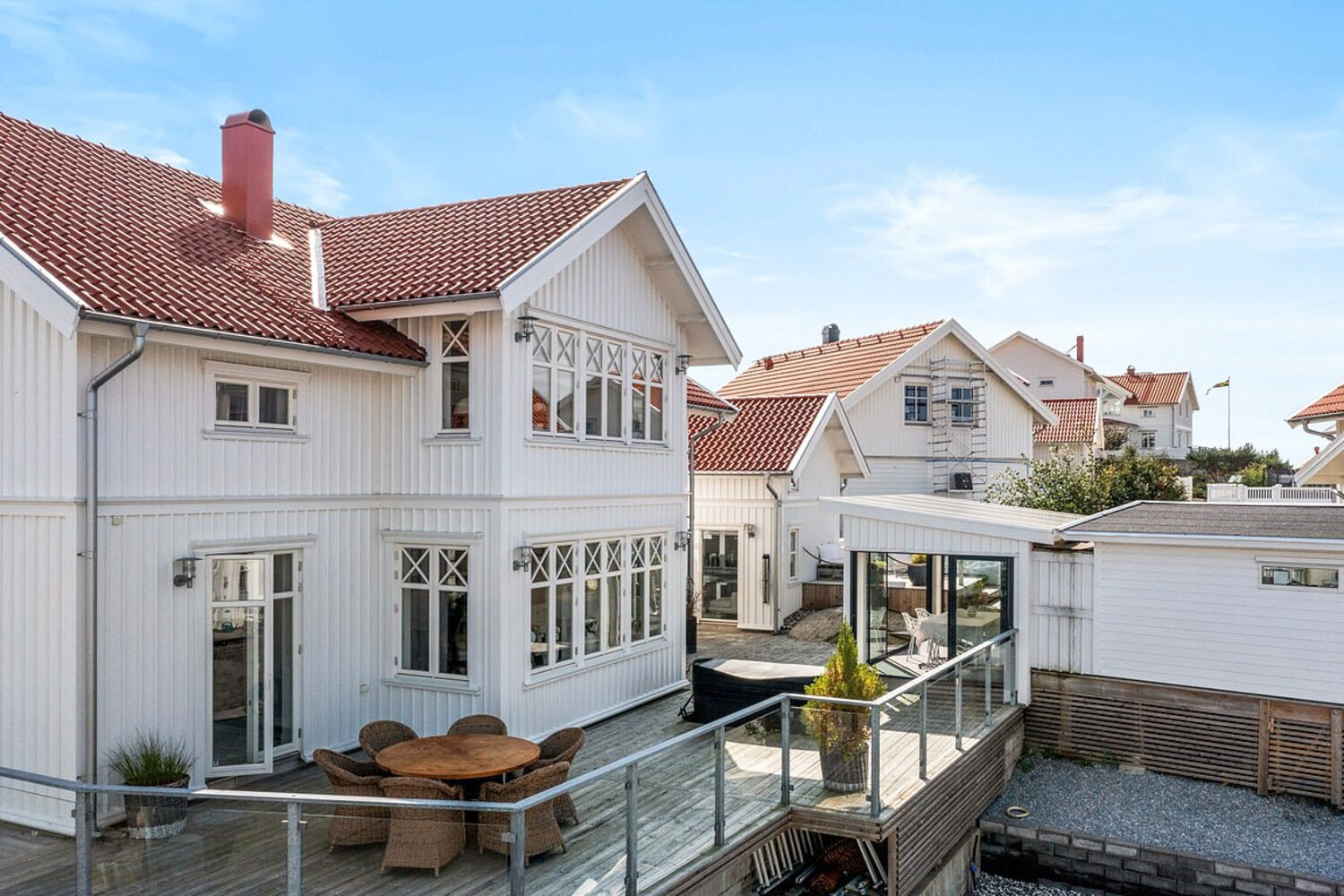 Willkommen in einem geräumigen und stilvollen Haus im beliebten Rönnäng auf Tjörn, mit Platz für bis zu 15 Personen, verteilt auf 6 Schlafzimmer. Hier wohnen Sie komfortabel in einem hellen und modernen Haus mit großzügigen Flächen, ideal für große Familien oder Gruppen, die gemeinsam Urlaub machen möchten. Nur 550 Meter vom Hafen entfernt wohnen Sie in unmittelbarer Nähe zu Badeplätzen und dem Leben in der Schärenlandschaft. Das Haus verfügt über einen offenen und geselligen Grundriss mit einer großen, voll ausgestatteten Küche, die zum natürlichen Treffpunkt wird. Es gibt viel Platz für gemeinsame Mahlzeiten und geselliges Beisammensein. Mehrere Wohnzimmer bieten Möglichkeiten, sowohl Zeit miteinander zu verbringen als auch sich zurückzuziehen. Die hellen Schlafzimmer sind geschmackvoll eingerichtet und bieten guten Komfort. Insgesamt gibt es 3 Badezimmer mit Dusche, eines davon verfügt zusätzlich über eine Badewanne. Im Außenbereich stehen mehrere Bereiche zur Verfügung, und nach einem Tag am Meer können Sie auf der schönen gepflasterten Terrasse des Hauses entspannen. Die Lage ist sehr gut, mit fußläufiger Entfernung zu salzigen Badeplätzen an den Klippen sowie in der Nähe von Restaurants und einem Supermarkt.