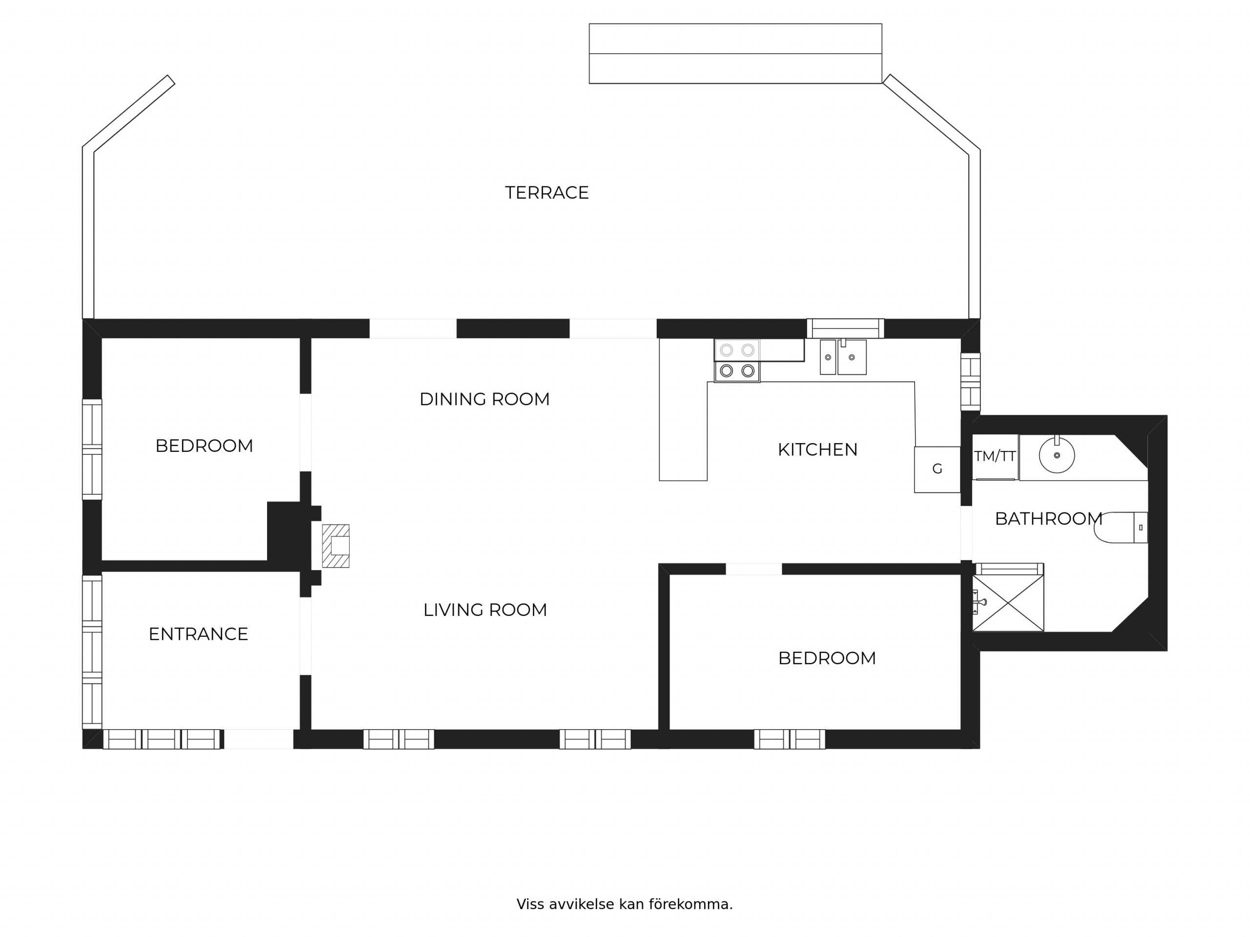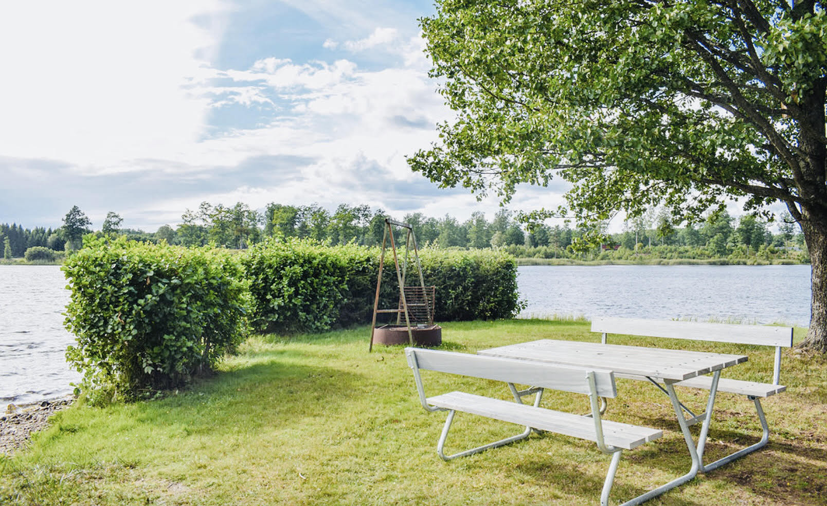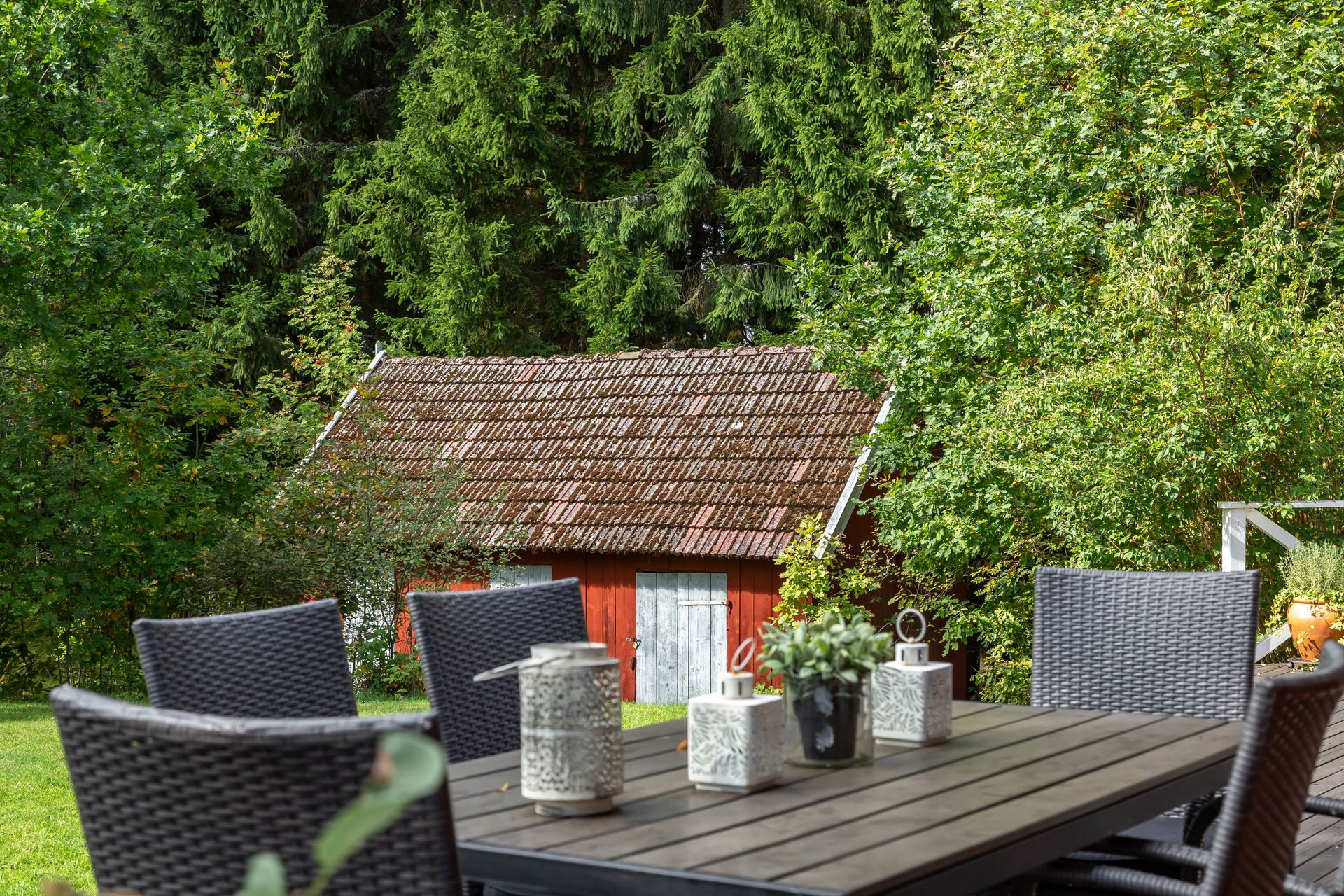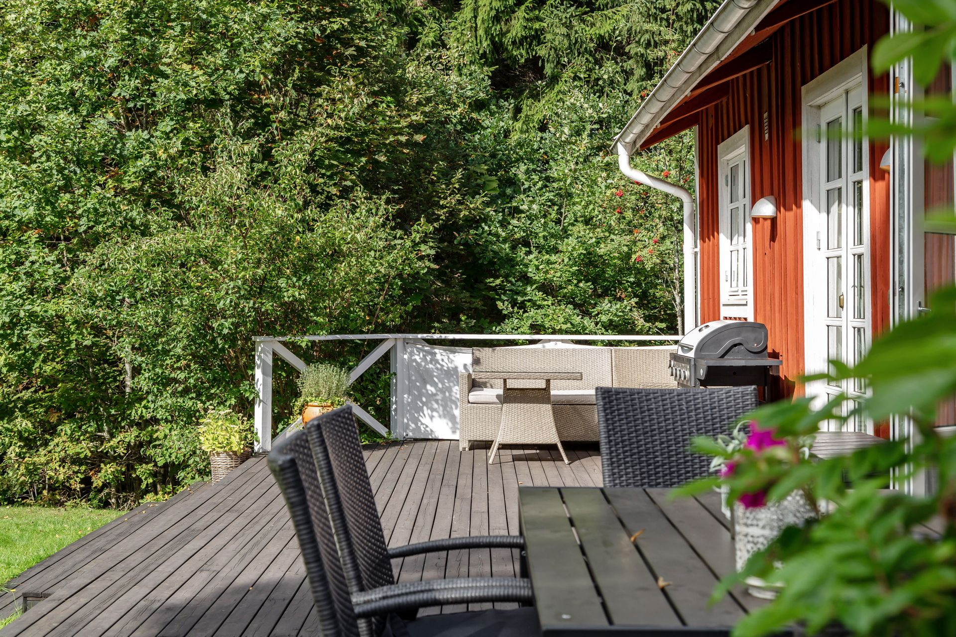 Sie haben auch Zugang zu einer großen Terrasse, die sich gut zum Abendessen an lauen Sommerabenden eignet. Von der Terrasse geniessen Sie auch einen teilweisen Blick zwischen den Bäumen über den Fyllesjön. Der See bietet sowohl gute Angelmöglichkeiten als auch einen Badeplatz mit Sitzgelegenheiten. Es gibt einen Roboter-Rasenmäher, der wochentags von 00:00 bis 06:30 Uhr aktiviert ist. Aus diesem Grund ist es empfehlenswert, Ihr Eigentum auf der Terrasse zu lagern.