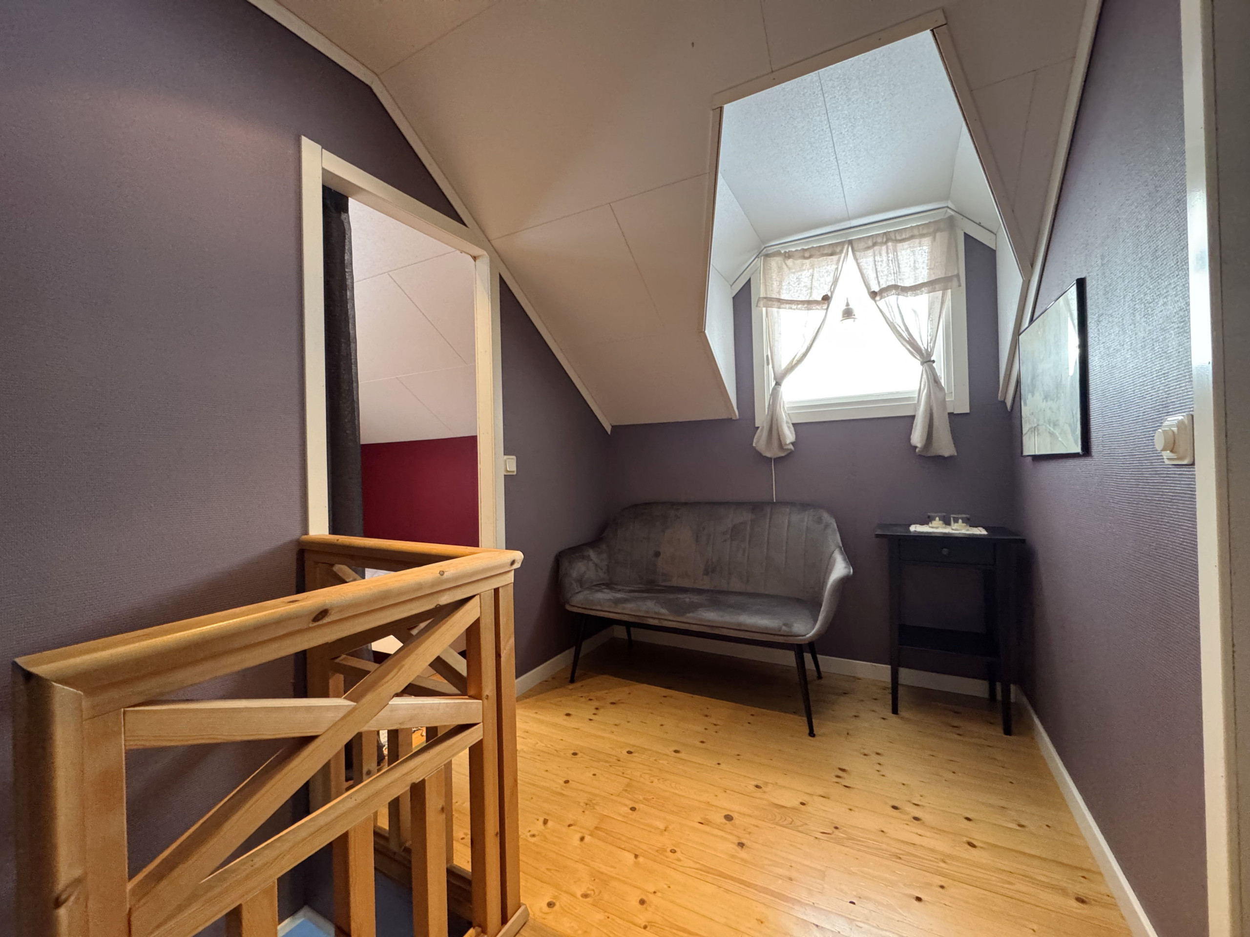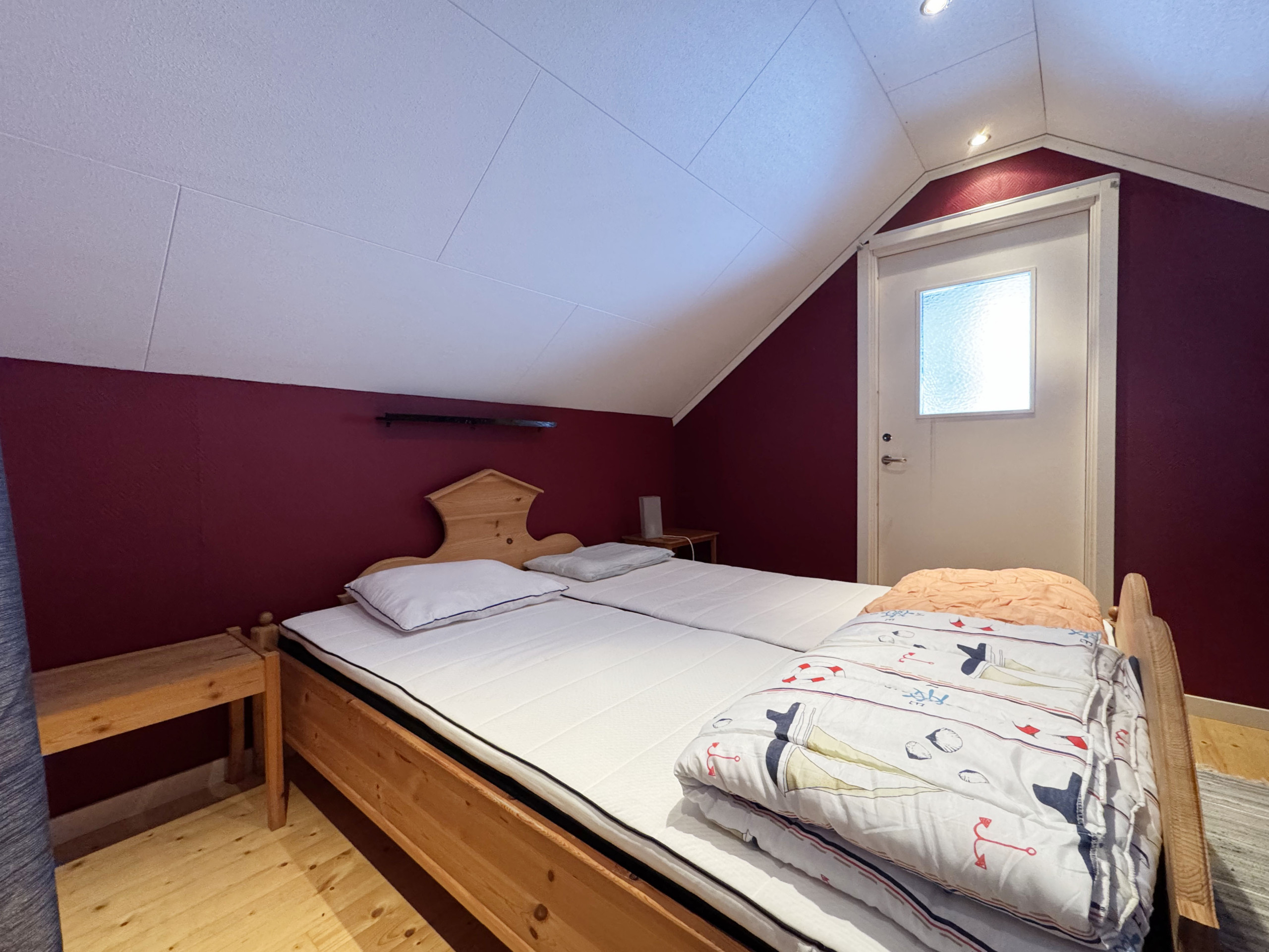 Im Obergeschoss befinden sich drei Schlafzimmer mit jeweils zwei Betten, ein zusätzliches Badezimmer mit Dusche und Doppelwaschbecken sowie ein Arbeitsplatz mit Blick aufs Wasser.