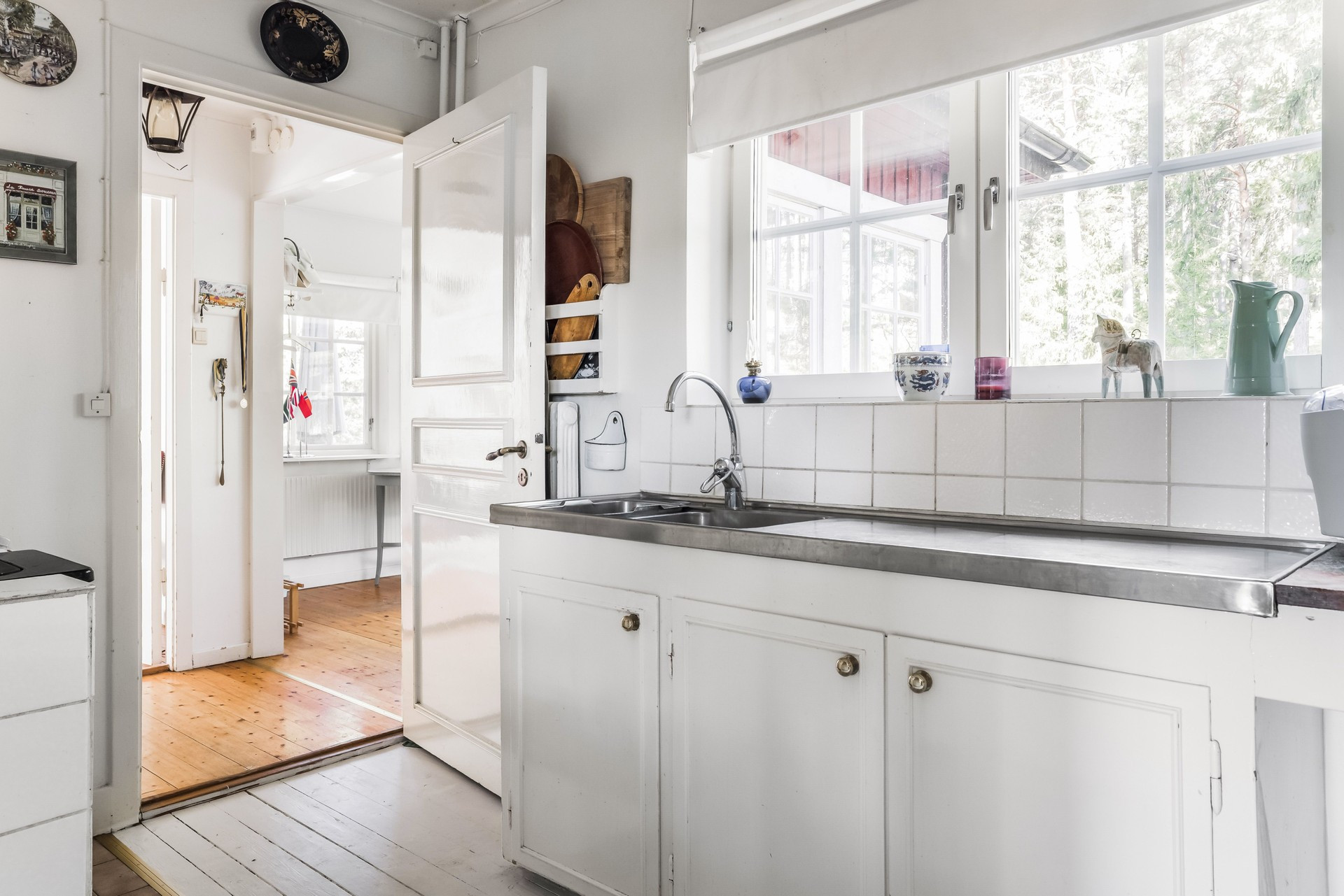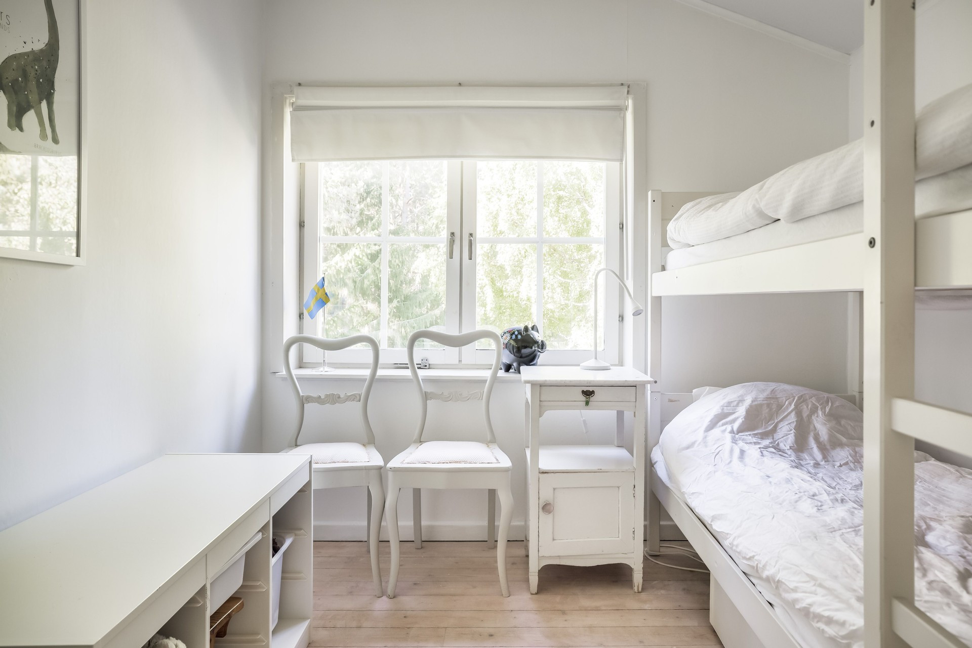 Das Haus bietet Platz für acht Personen in Form von drei Schlafzimmern und einem Bootshaus, in denen jeweils zwei schlafen. Im ersten Schlafzimmer steht ein Doppelbett, im zweiten ein Etagenbett und im dritten zwei Einzelbetten, ebenso hat das Bootshaus zwei Einzelbetten. Die Küche ist gut ausgestattet und hat alles, was Sie brauchen könnten, sowie eine schöne Aussicht. Es gibt zwei Badezimmer, beide mit Dusche und Toilette. Im gemütlichen Wohnzimmer gibt es einen Chromecast-Fernseher. Vom Schlafzimmer mit Doppelbett gelangen Sie außerdem auf einen großen Balkon mit Tisch, Stühlen und einem fantastischen Blick auf das Wasser. Unten am Strand und am Steg, der Platz für drei Boote bietet, gibt es auch eine kleinere Terrasse mit Gartenmöbeln, wenn Sie dort lieber zu Abend essen möchten. Angrenzend an den Balkon befindet sich auch die holzbefeuerte Sauna.