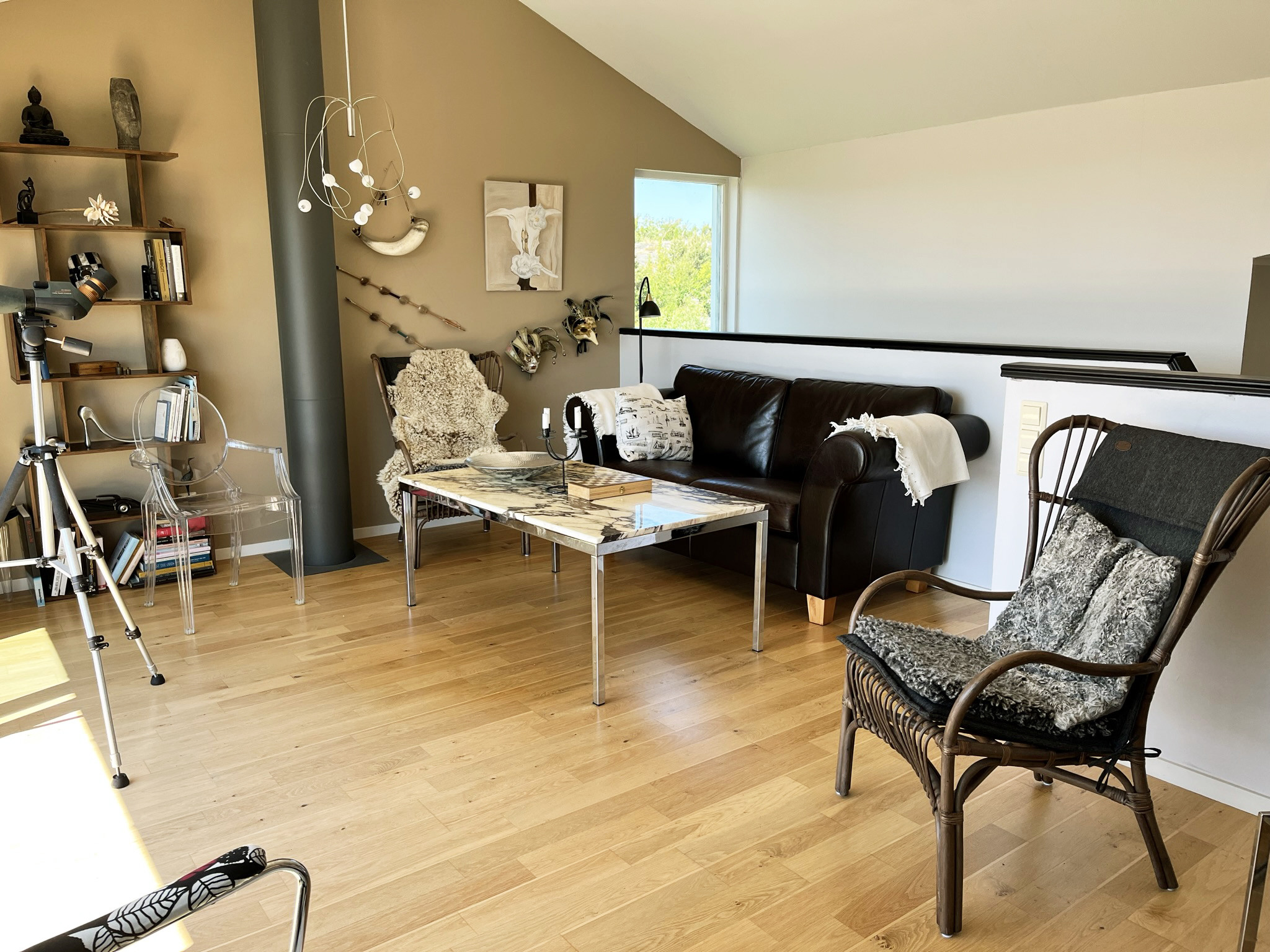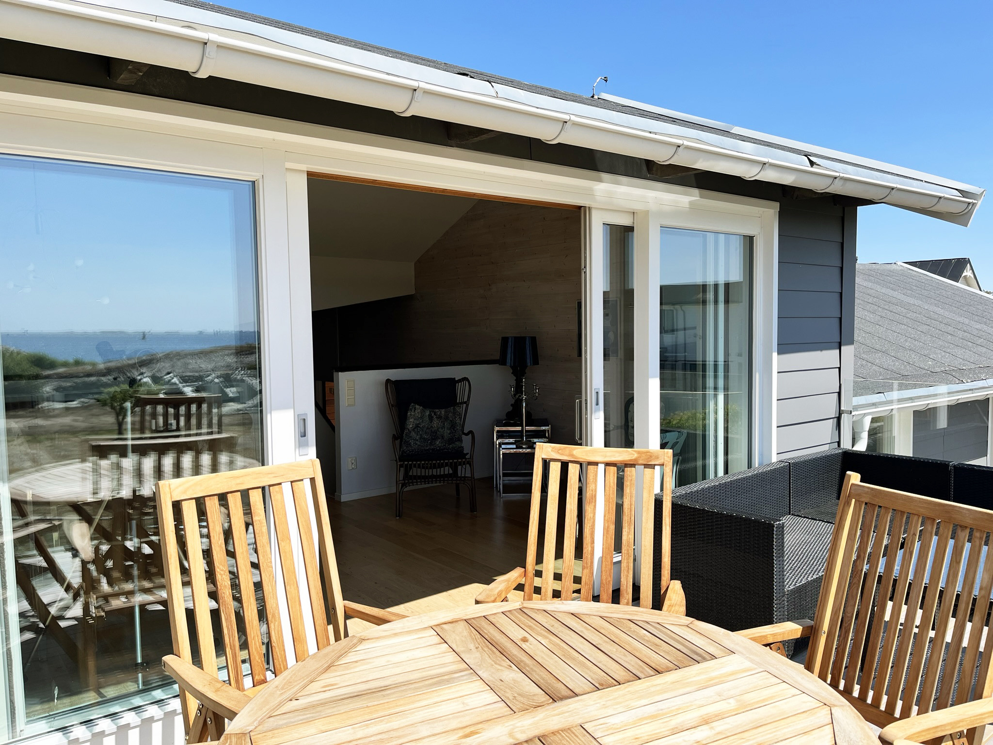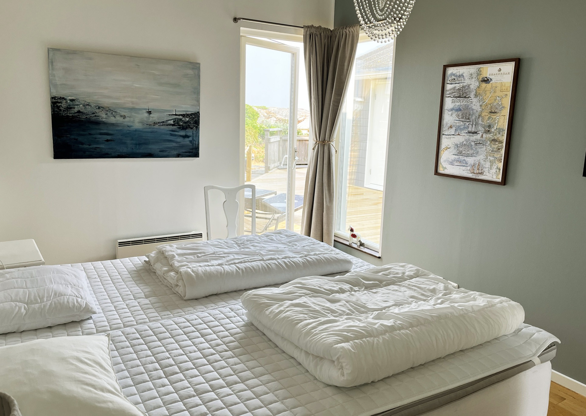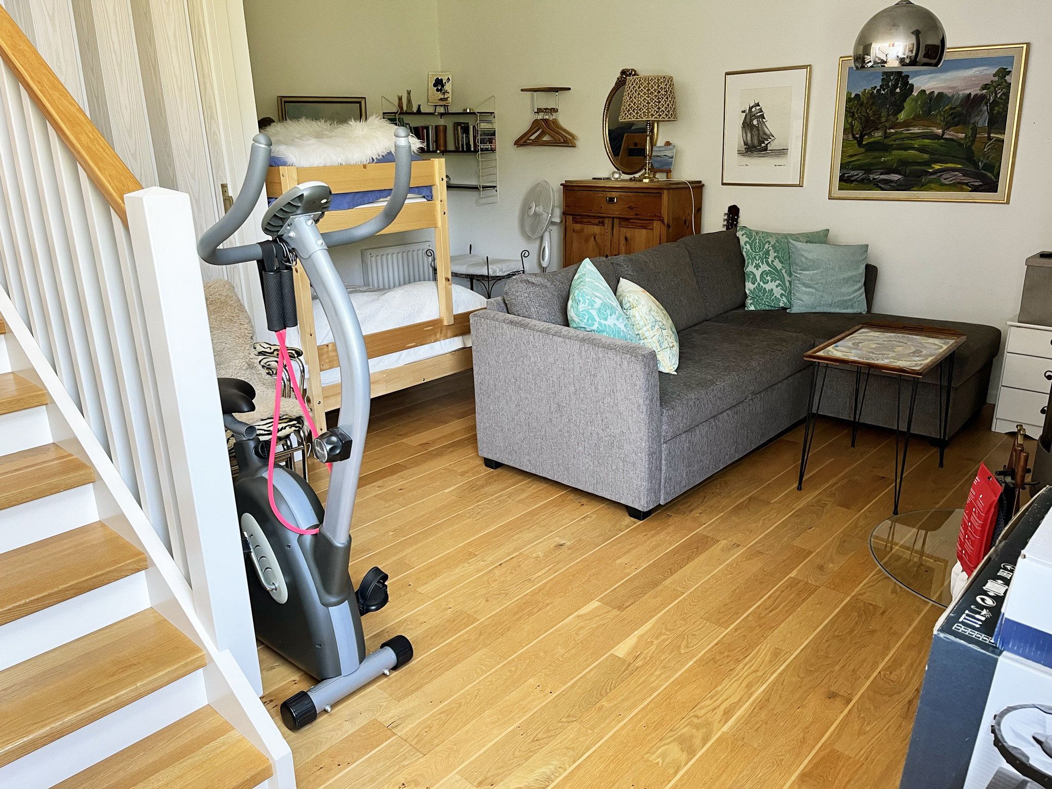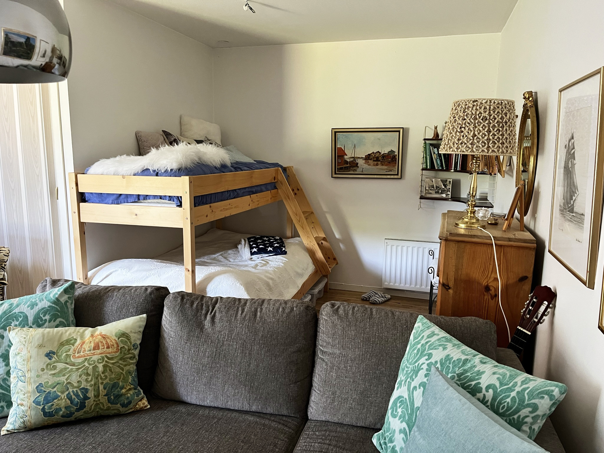 Im Haus gibt es zwei Standardschlafzimmer mit Doppelbetten und ein Familienzimmer im Erdgeschoss mit einem Schlafsofa und einem Familienbett (120 cm breit und 80 cm im oberen Bett). Das Familienzimmer hat keine Tür, aber einen langen Vorhang zum Zuziehen. Das Familienbett steht relativ ungestört und uneinsehbar in einer Art Nische unter dem Obergeschoss.