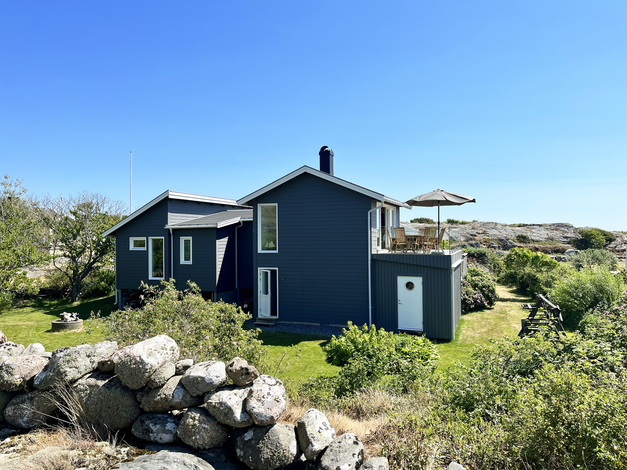 Dieses schöne Ferienhaus, in dem Altes auf Neues trifft, liegt auf einer paradiesischen Insel im westlichen Schärengarten von Göteborg.
