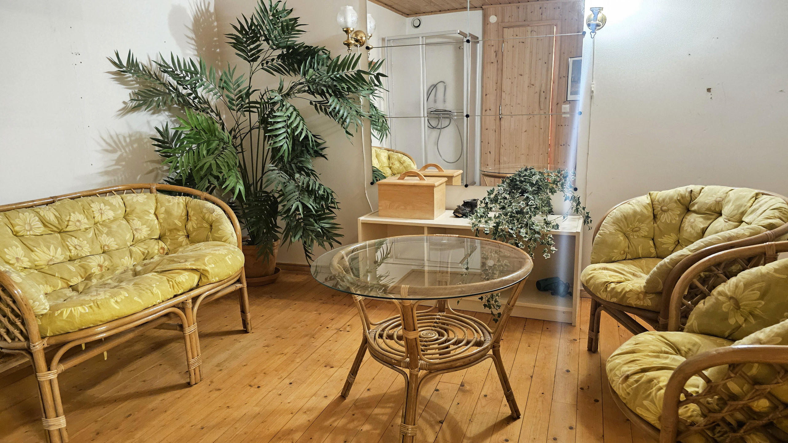 Wohnraum: Ein Durchgangszimmer, das bei Bedarf auch als Schlafzimmer genutzt werden kann. Hier befindet sich ein breites Sofa (140 cm) + eine zusätzliche Matratze zum Auflegen