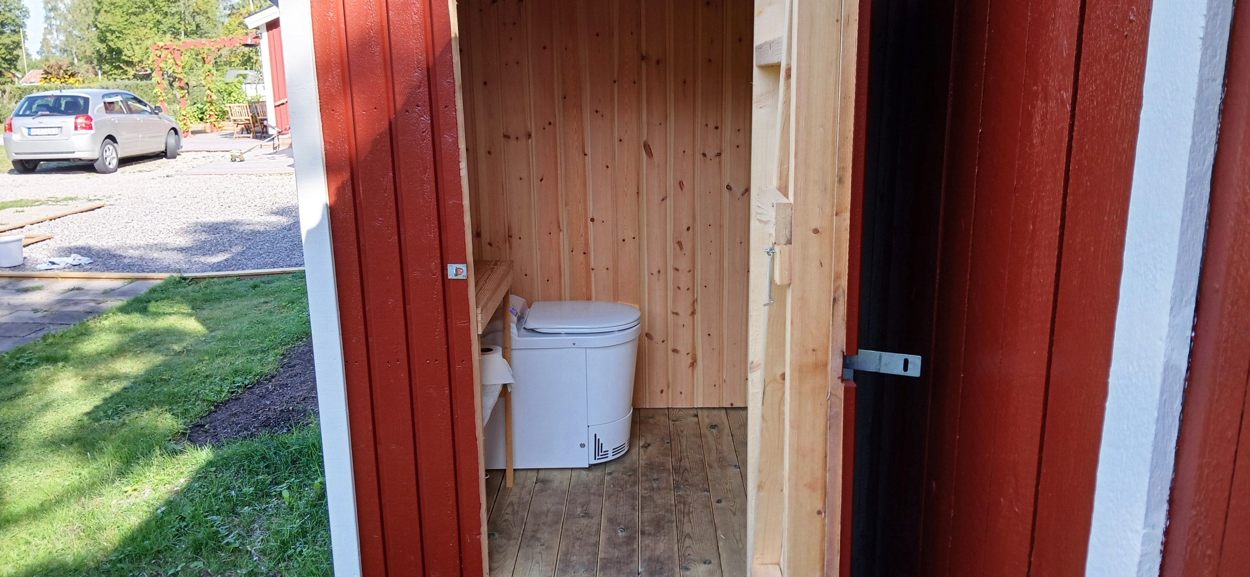 Eine Dusche mit WC befindet sich im Haupthaus, eine Verbrennungstoilette befindet sich 3 Meter vom kleinen Ferienhaus entfernt.