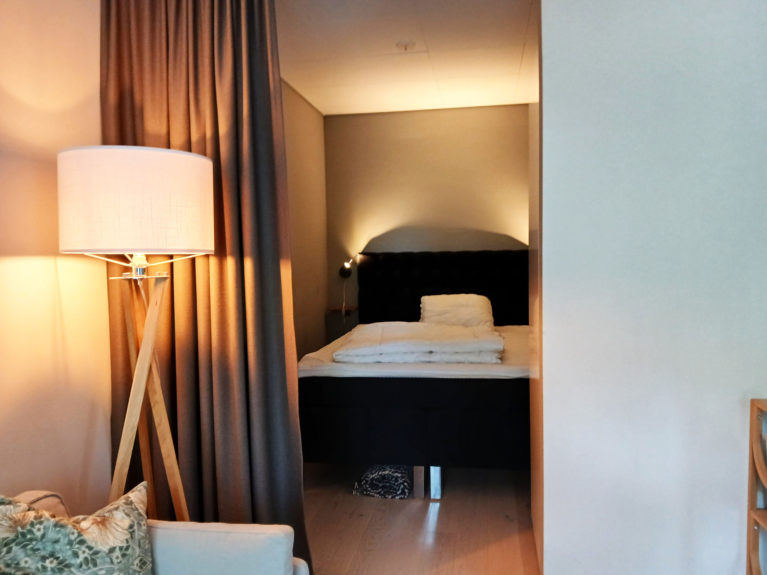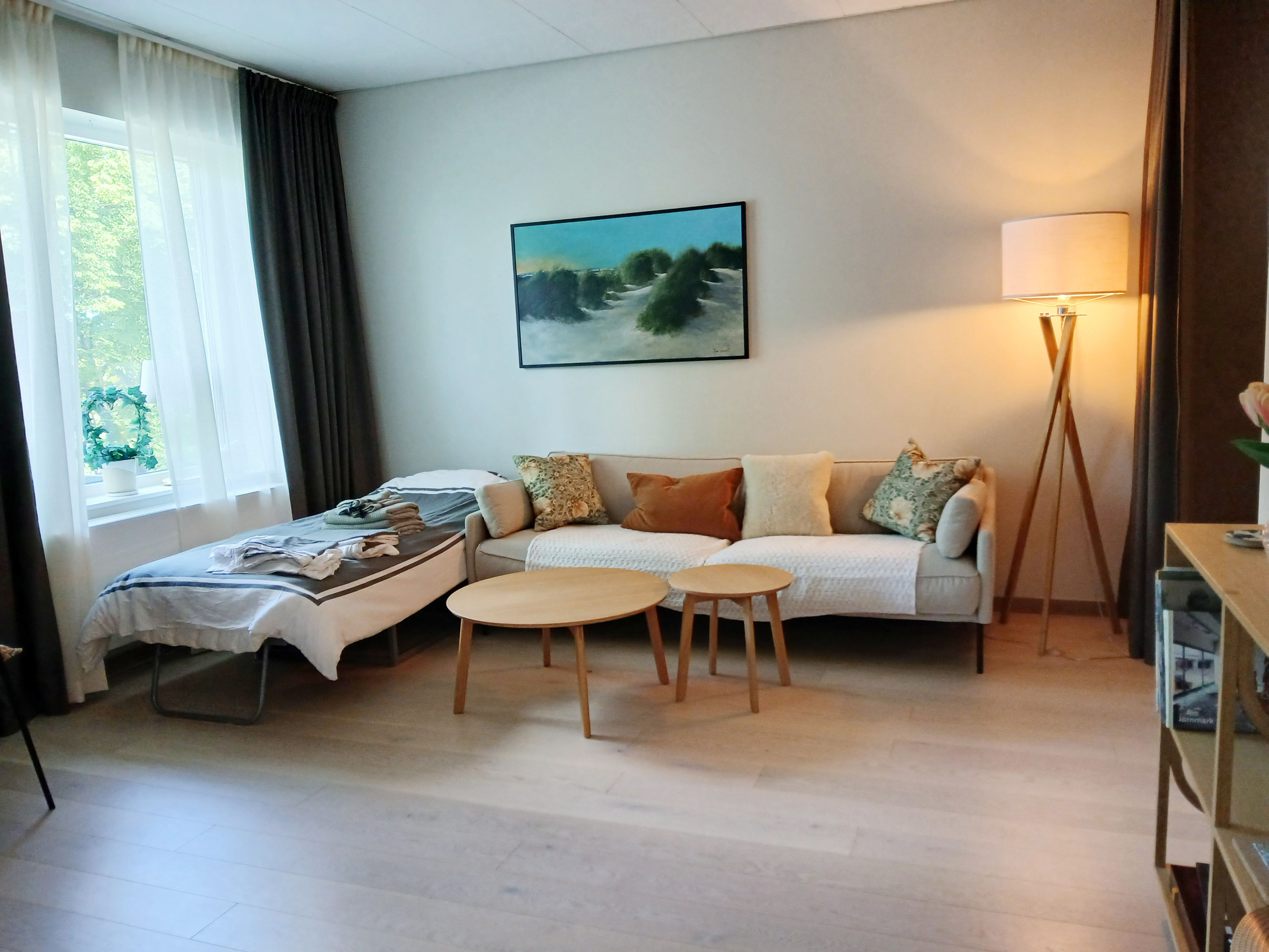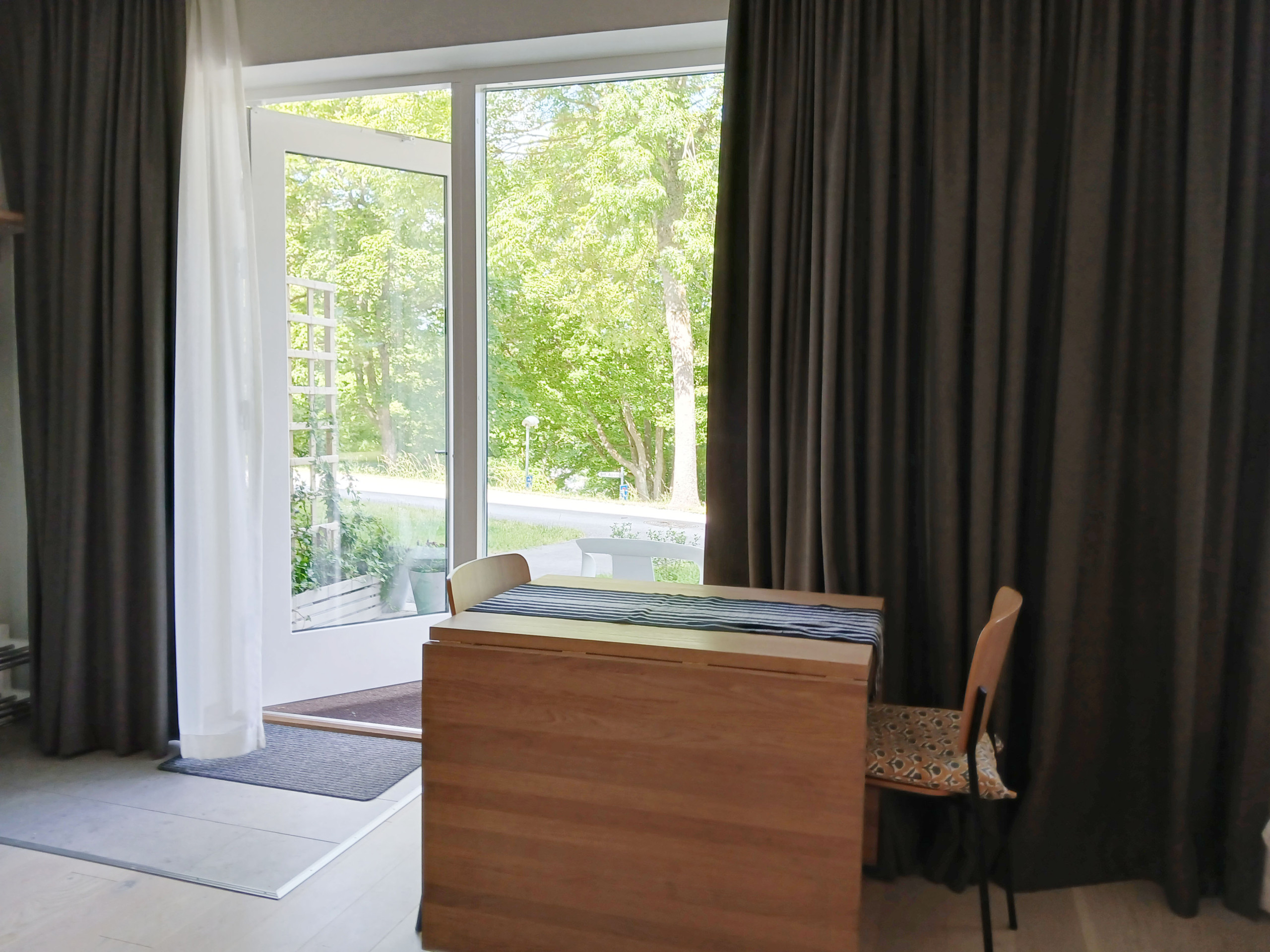 Live near Visby city center in a quiet park-like environment. Apartment built in 2022 to a high standard and only 5 minutes from the ferry terminal, the center and shops. There is accommodation for 3 people here. The apartment has its own entrance and patio with evening sun. Living room in open plan with the kitchen, view via panoramic window over green environment. Sleeper sofa with double bed and a single bed in the living room. On the patio there is a lounge group and from here you have a partial sea view. Parking space number 2 belongs to the apartment.
