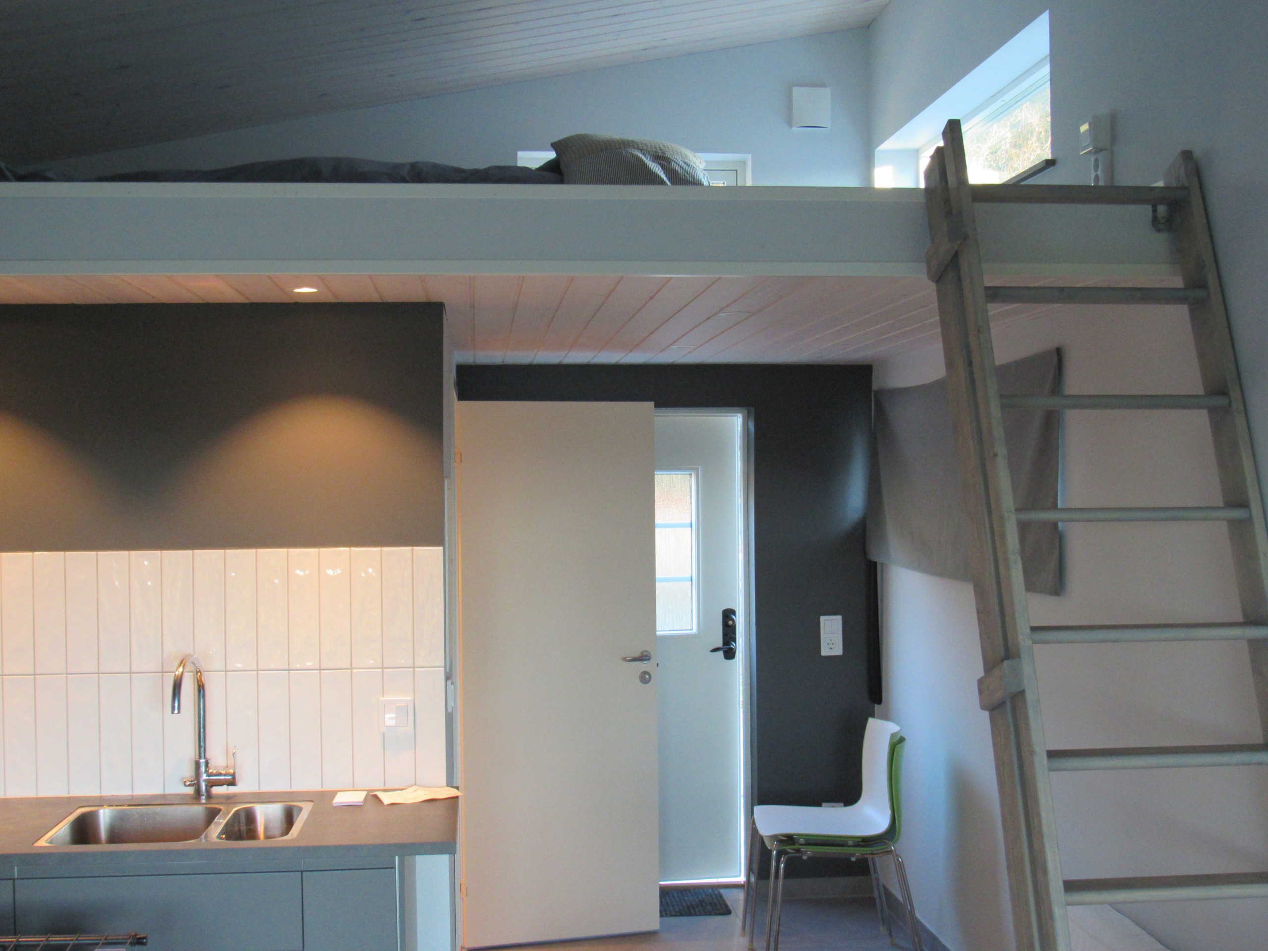 The bright and comfortable cottage offers a fully equipped kitchen with dishwasher, stove, oven, microwave and fridge/freezer. The bathroom is fresh and features a shower and washing machine. In the living room there is a daybed that can easily be converted into a 160 cm double bed, and in the sleeping loft there are two mattresses (90 cm each). TV and Wi-Fi are available for relaxation after a day by the sea.