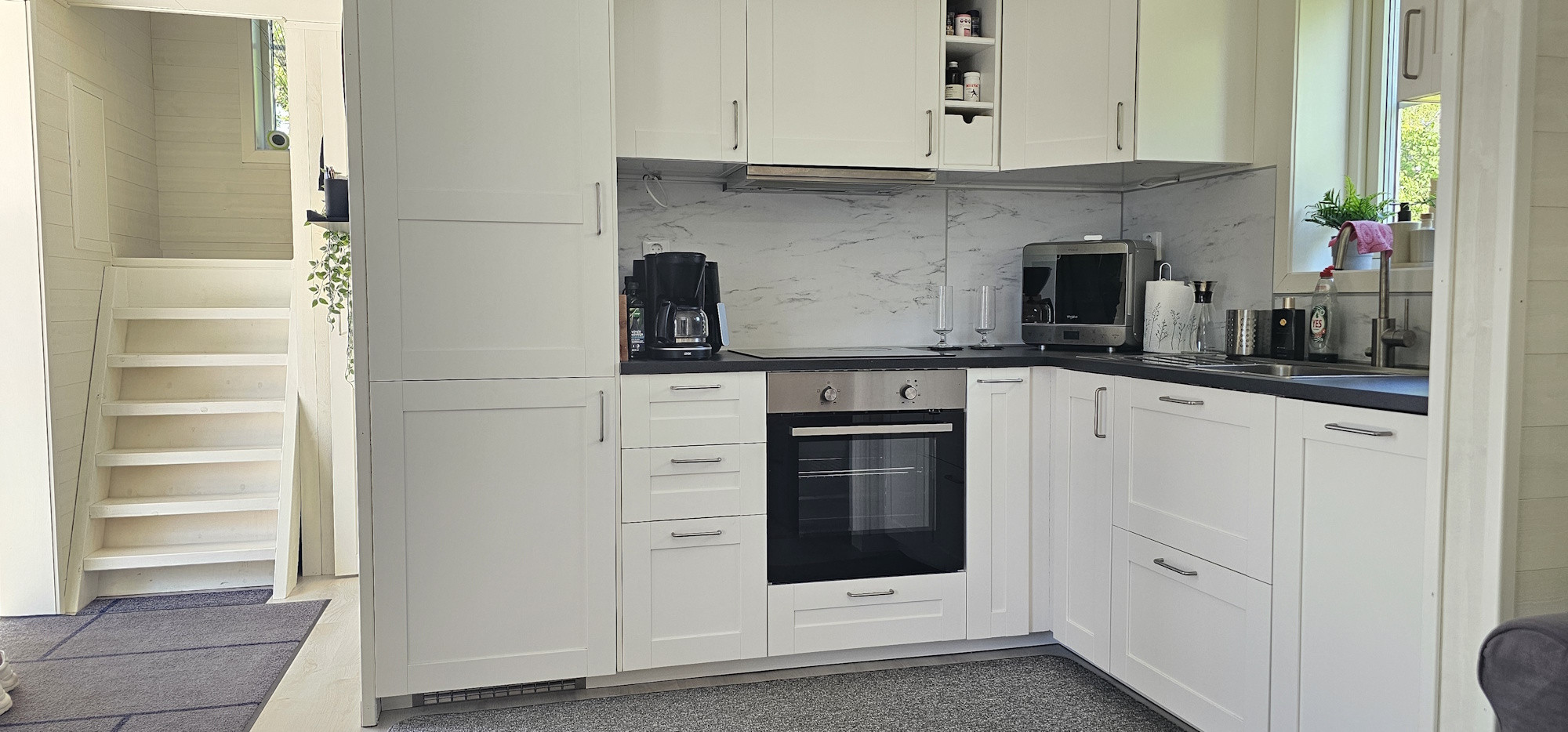 Welcome to this fresh and stylishly decorated studio house in Rossö on Orust. Here you live in 30 well-planned square meters with an open floor plan and a cozy sleeping loft with a 140 cm bed. The living room is furnished with a comfortable sofa bed (140 cm), making the house suitable for up to 4 people. The modern kitchen is fully equipped with a dishwasher, oven, freezer, microwave, and coffee maker, offering all the amenities for a smooth vacation.