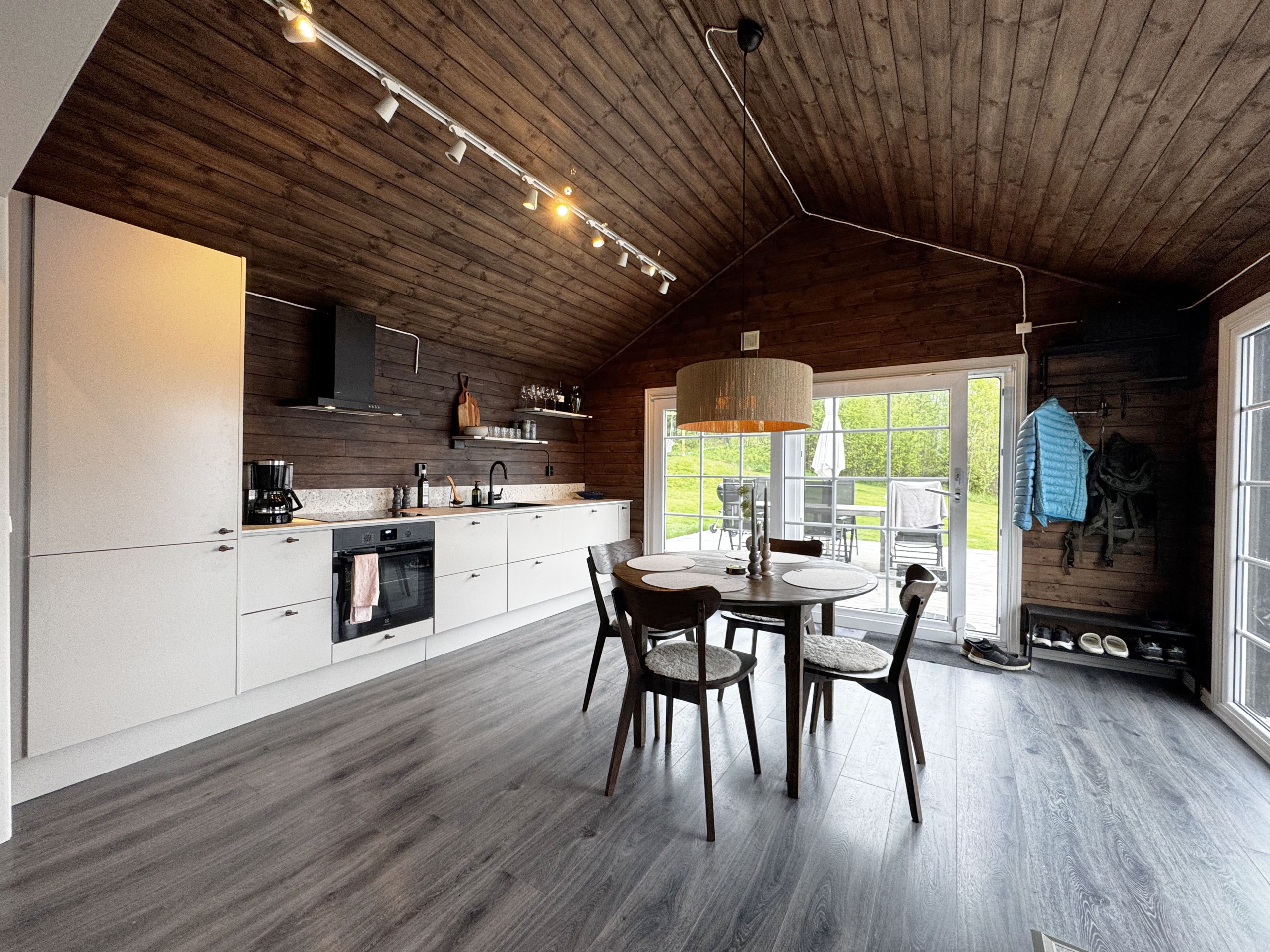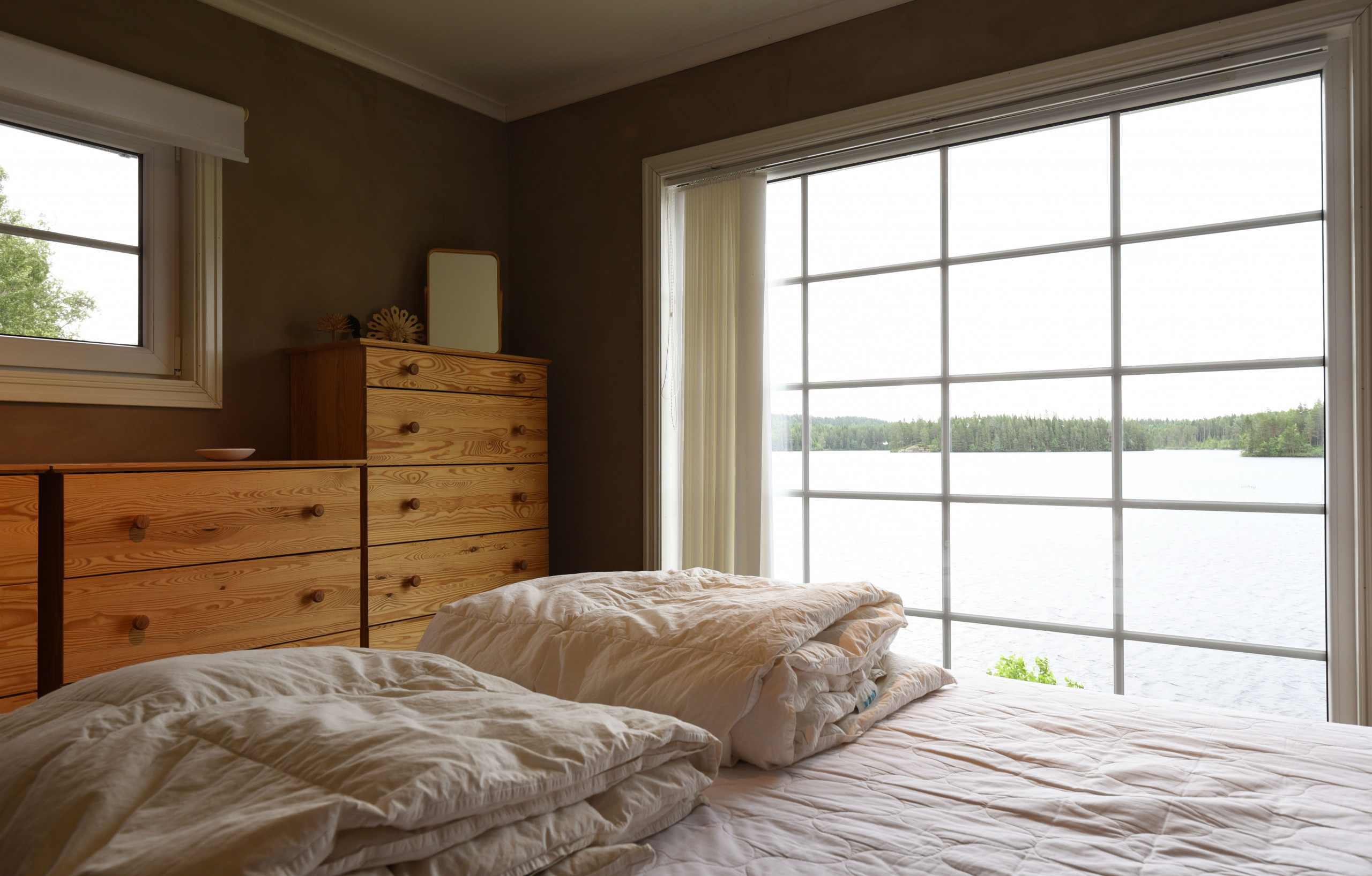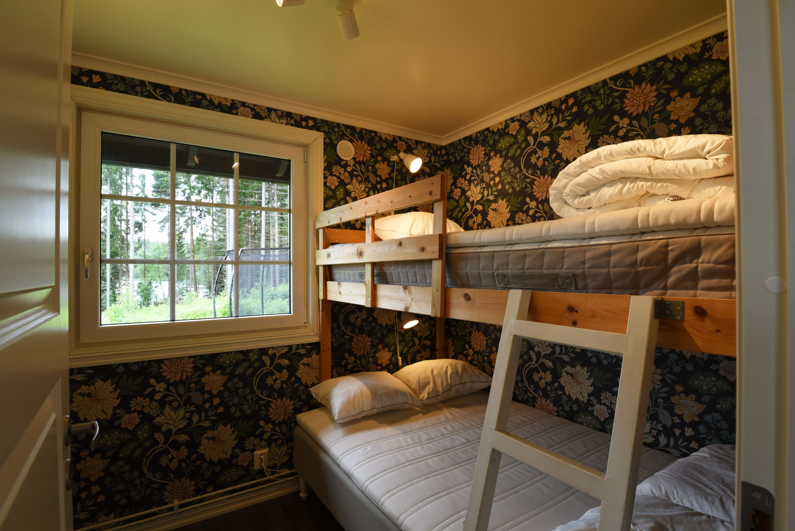 With room for five people divided into two bedrooms and an extra space in a sofa bed in the living room. Open floor plan between kitchen and living room filled with light from the large windows that look out over the lake. You also have access to internet via fiber. The bathroom is equipped with a shower and a combustion toilet.