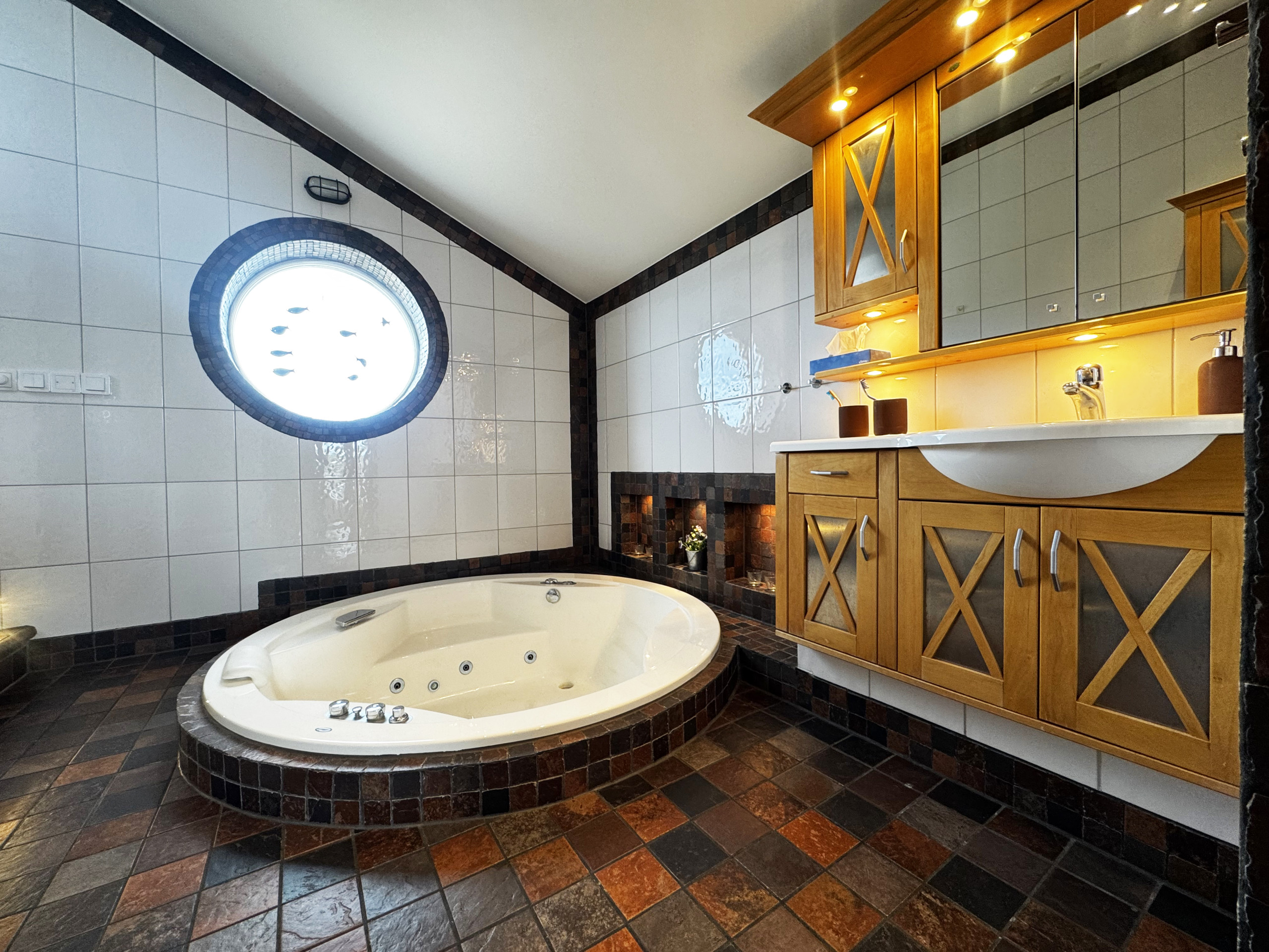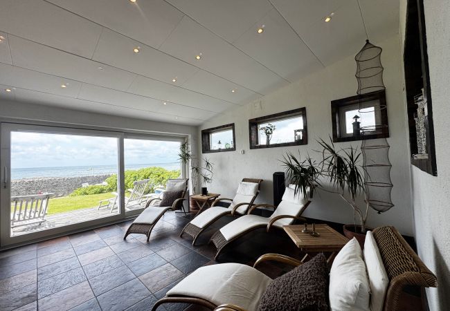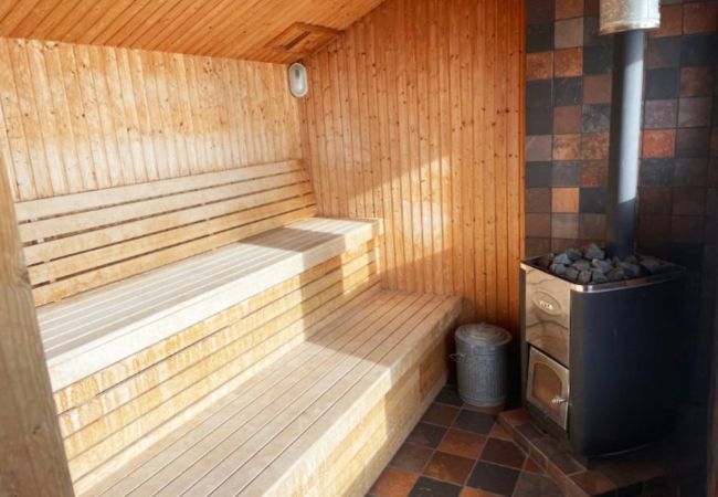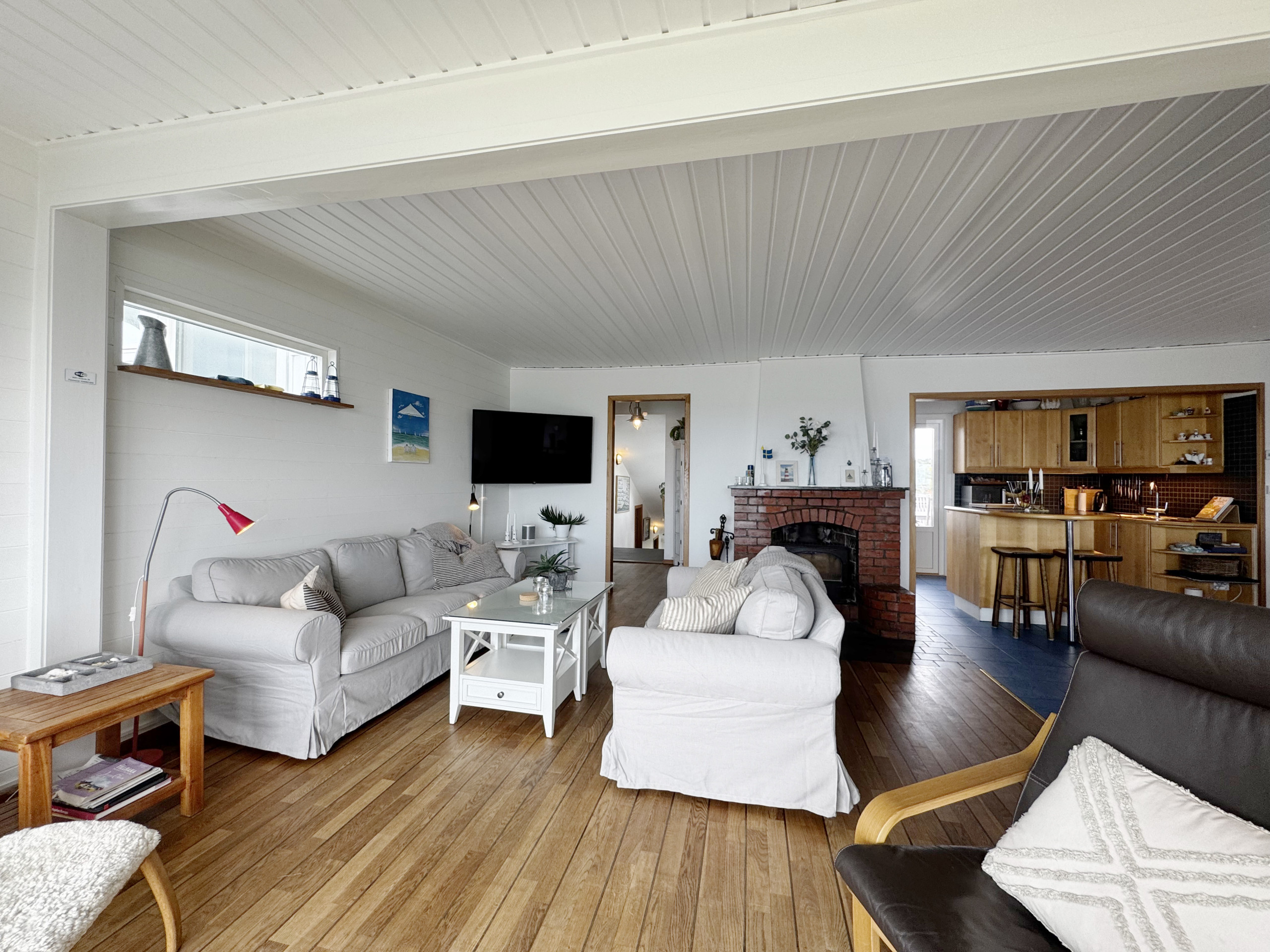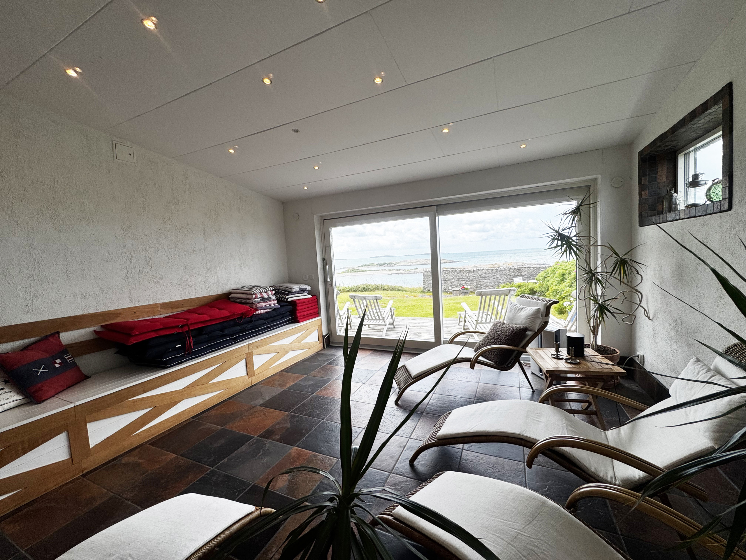 Enjoy the fantastic relaxation area with jacuzzi, sauna and sea view – a perfect place to relax after a day at the sea. The large and bright living room has an open fireplace and panoramic views that create a cozy atmosphere for the evenings.