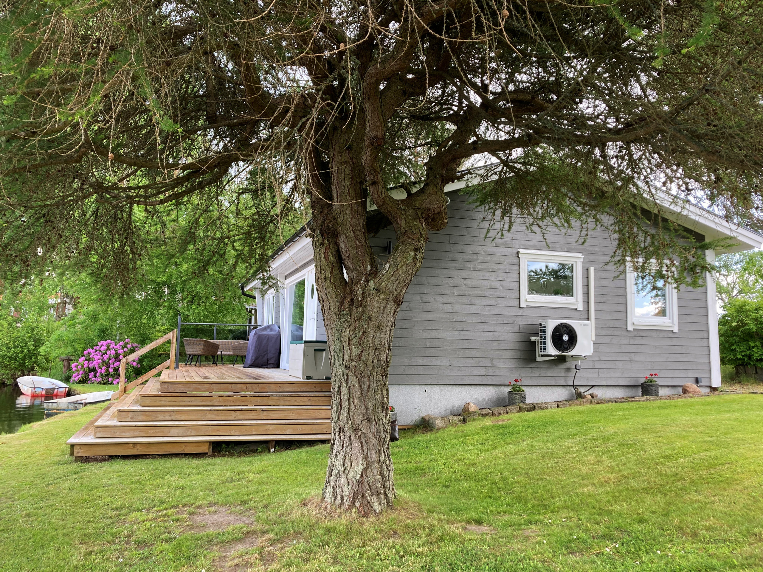 You live only 2 m from Klerebodammen and have your own lake plot. Enjoy the sunset from the lovely terrace which has a fantastic view. There is garden furniture and a gas grill here. At the water's edge is your boat (10 feet), which is included in the rent. It is possible to rent an extra boat for SEK 700 per week. However, you should note that fishing is not allowed in the lake. You have a lovely large panoramic window from the dining area.