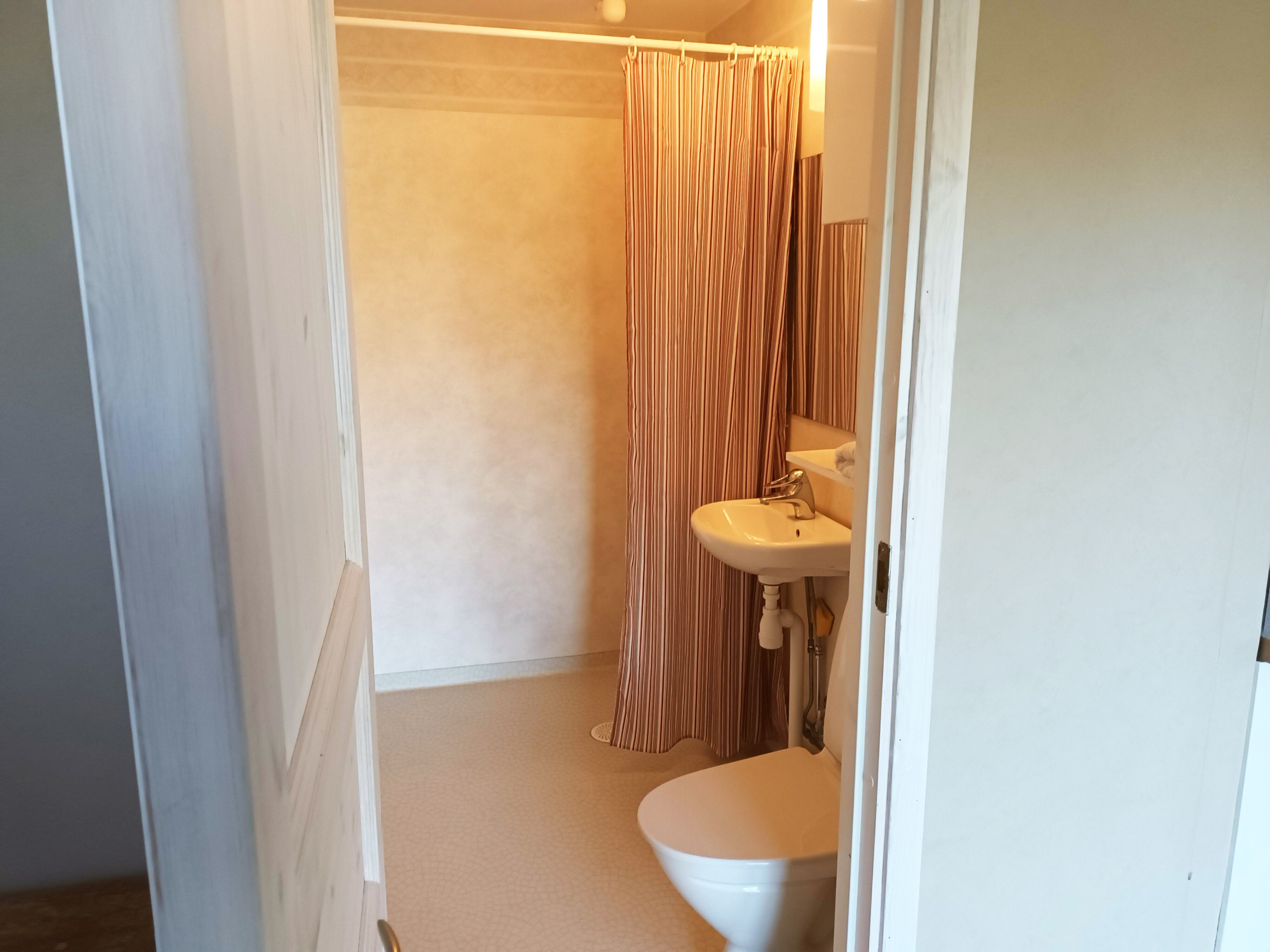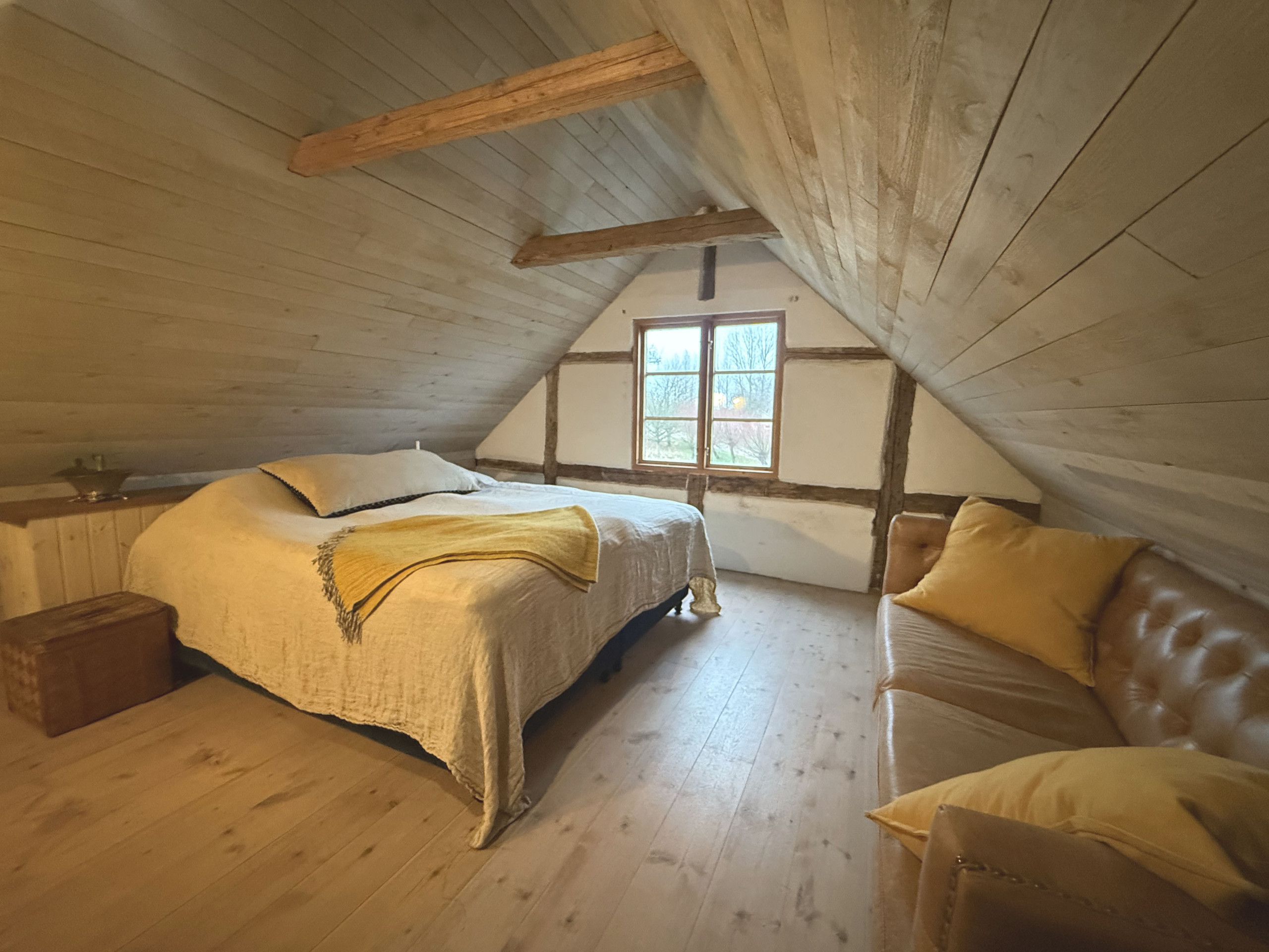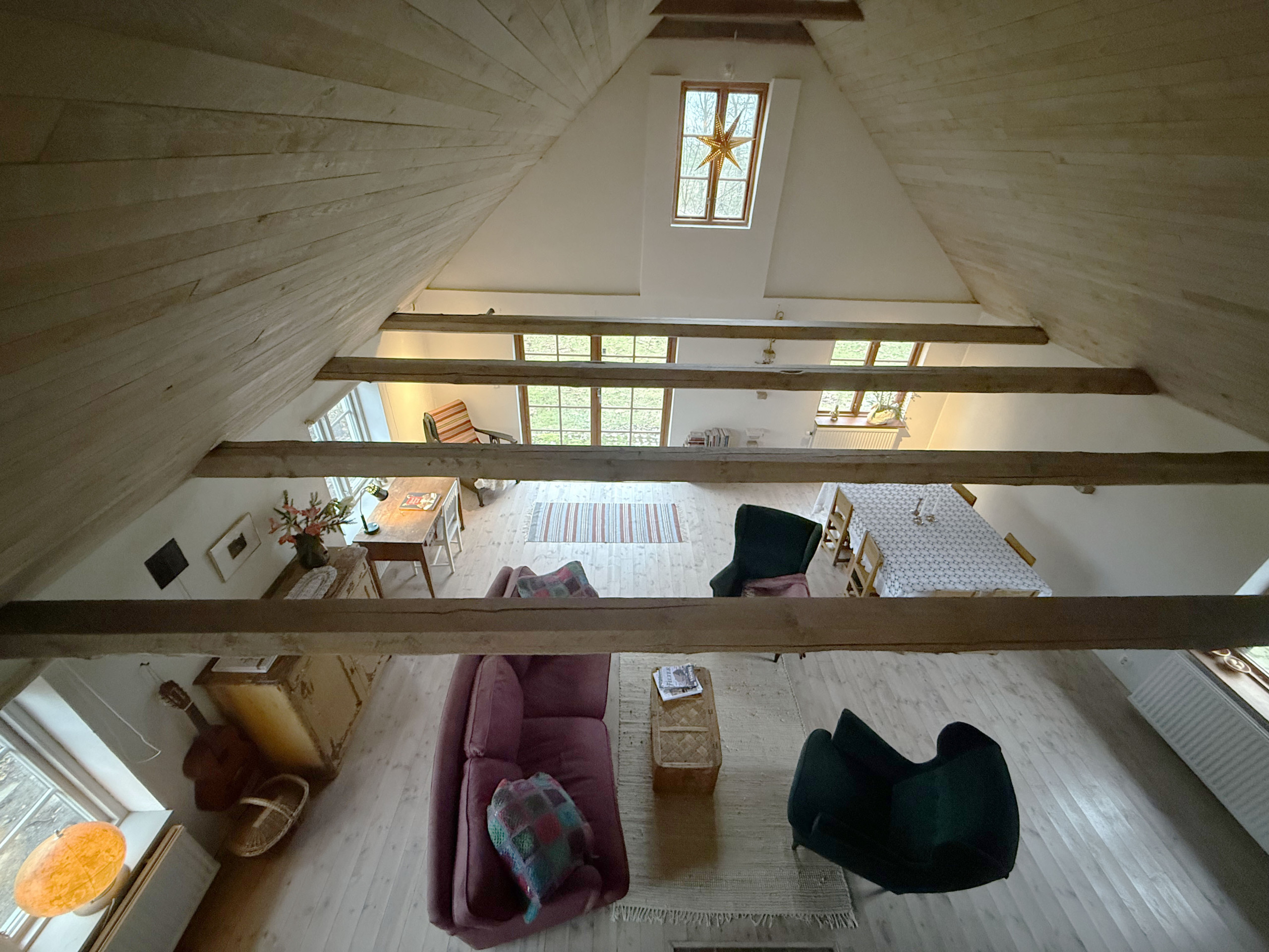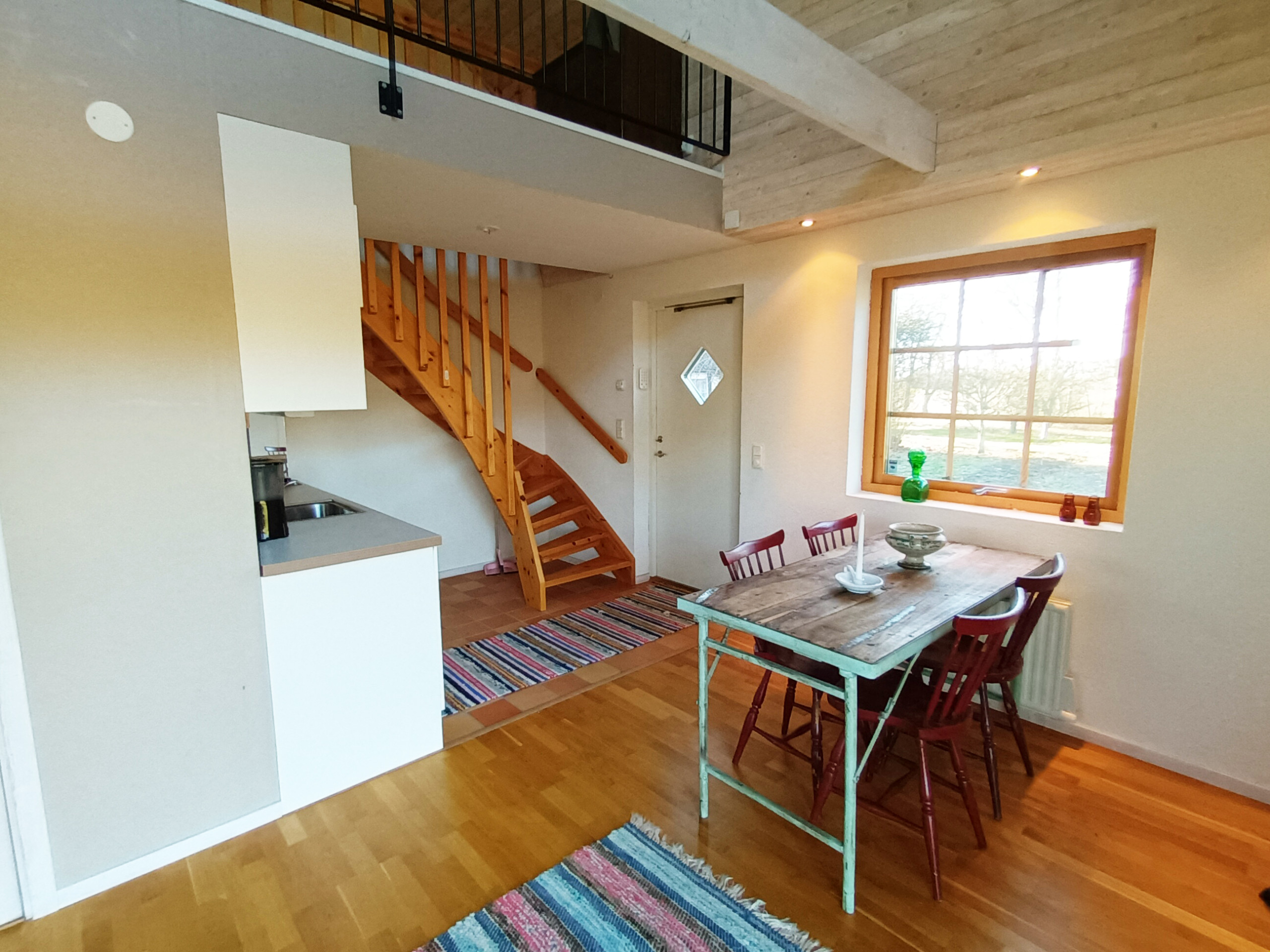 The large house has a bedroom with two single beds and a loft with a double bed, which makes the house well suited for both families and smaller groups. There is also a toilet with shower and a well-equipped kitchen that is suitable for both everyday meals and longer dinners. Large living room open to the ceiling, which gives a wonderful feeling of space. For cooler days there is a stove that creates both warmth and atmosphere.