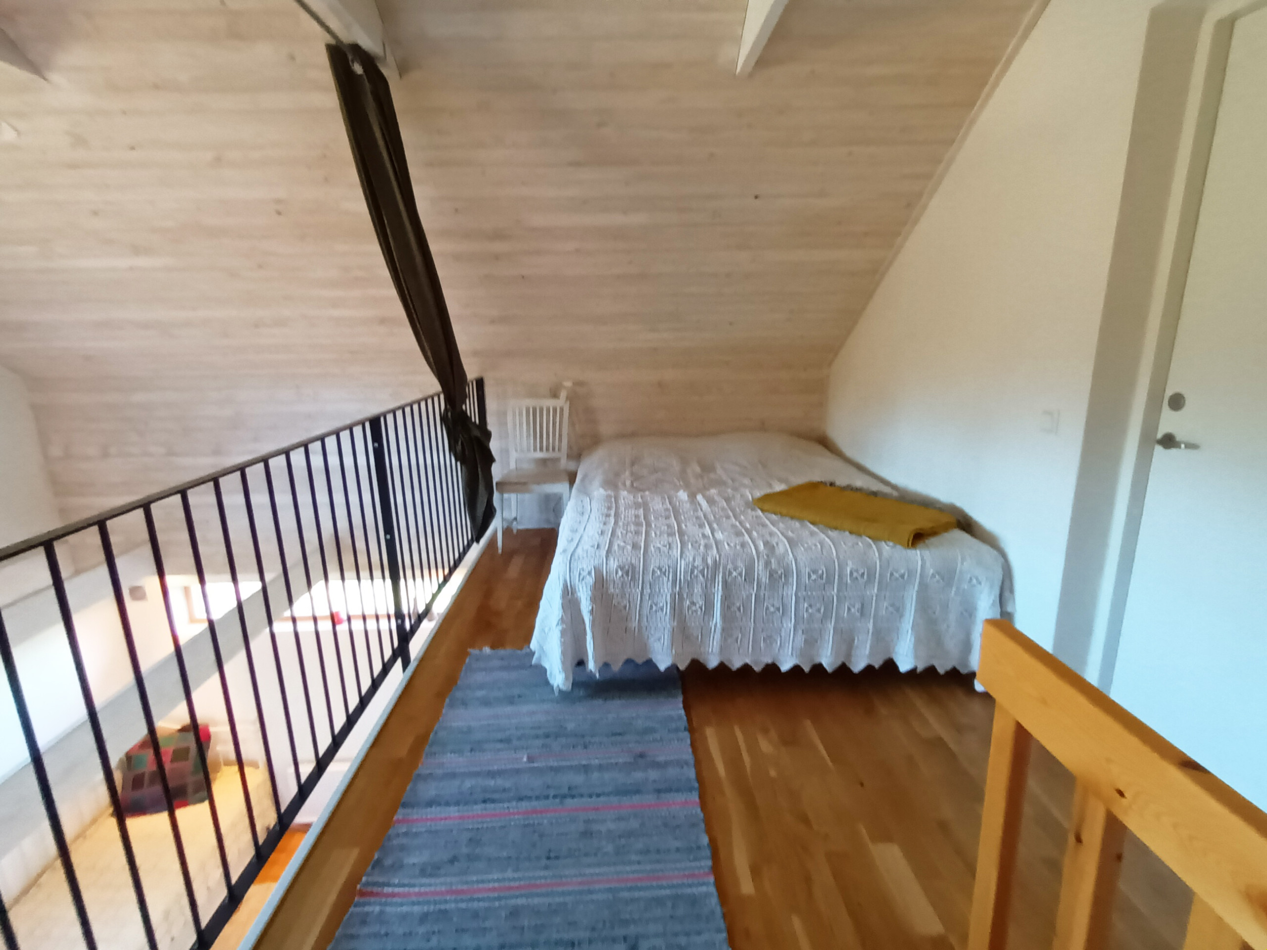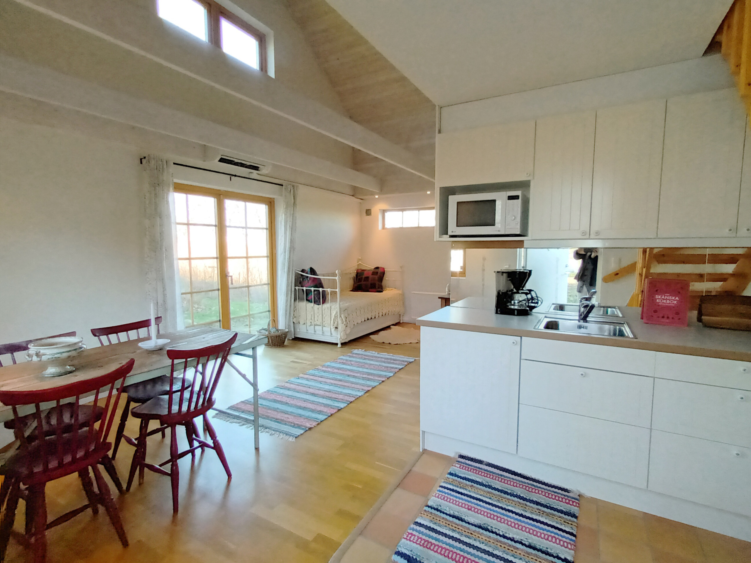 The small house has a bedroom with bunk beds and a loft with a double bed, as well as a daybed/single bed in the living room. Smaller kitchen for cooking and toilet with shower.