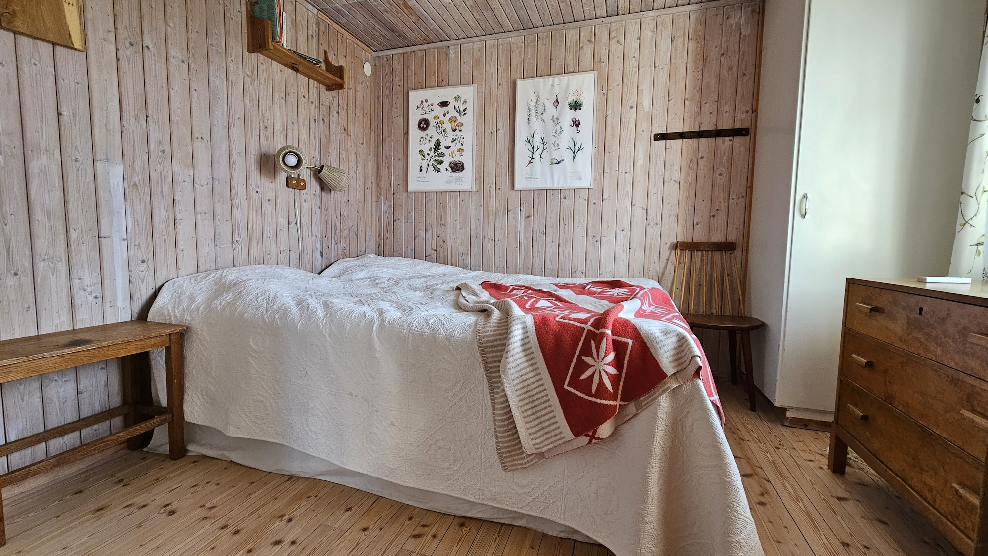 Welcome to this well-preserved 1960s cottage, located in a quiet area on a beautiful rocky plot, just 1.5 km from the idyllic fishing village of Hälleviksstrand. The house accommodates up to 4 guests with two bedrooms – one with a double bed (160 cm) and one with a bunk bed (80 cm). The interior is cozy with original furniture from the 60s, a living room with sofa, dining table and TV, as well as a small but functional kitchen equipped with fridge, freezer, stove, oven, and microwave. A toilet with washbasin is available inside the house, and in the storage room you will find a shower and washing machine.