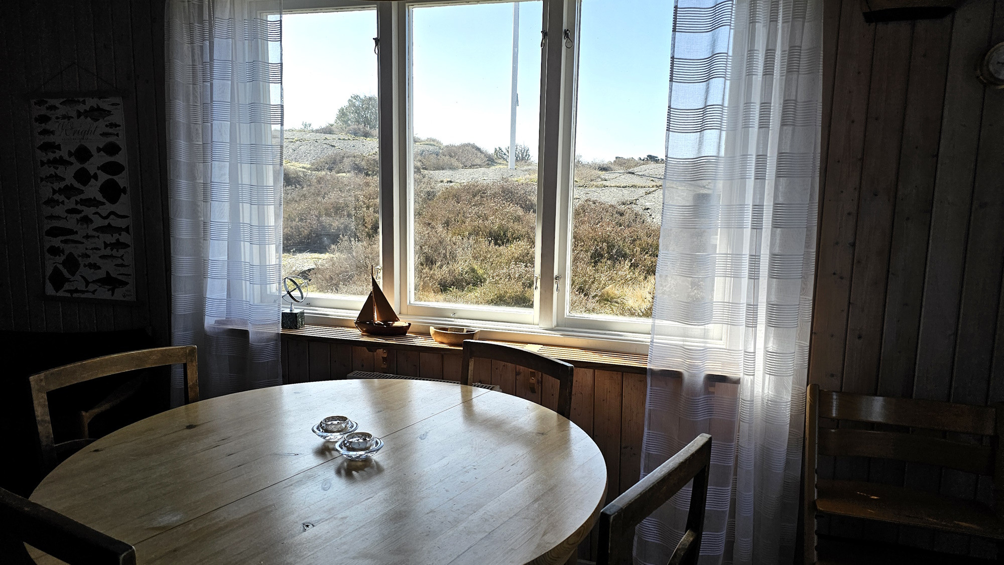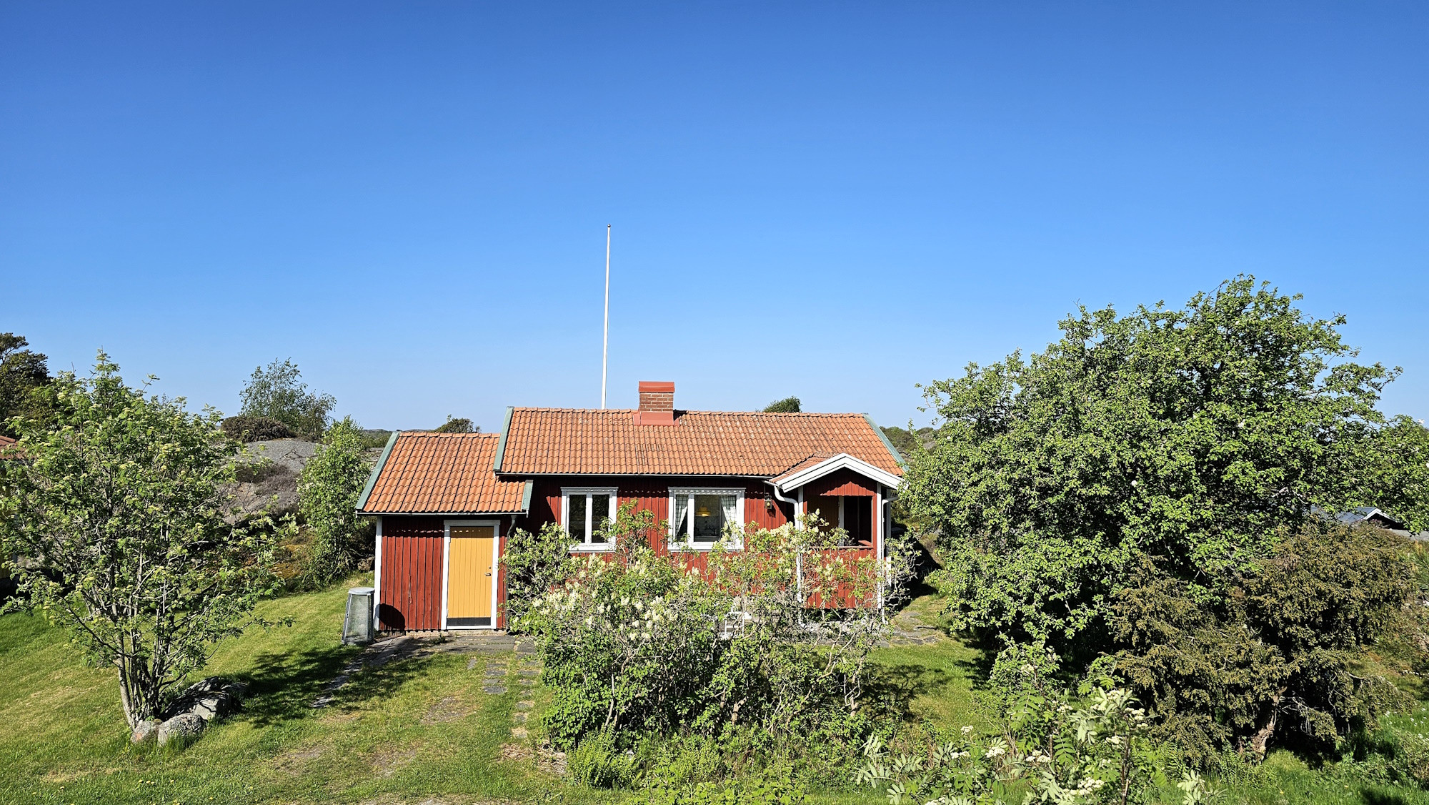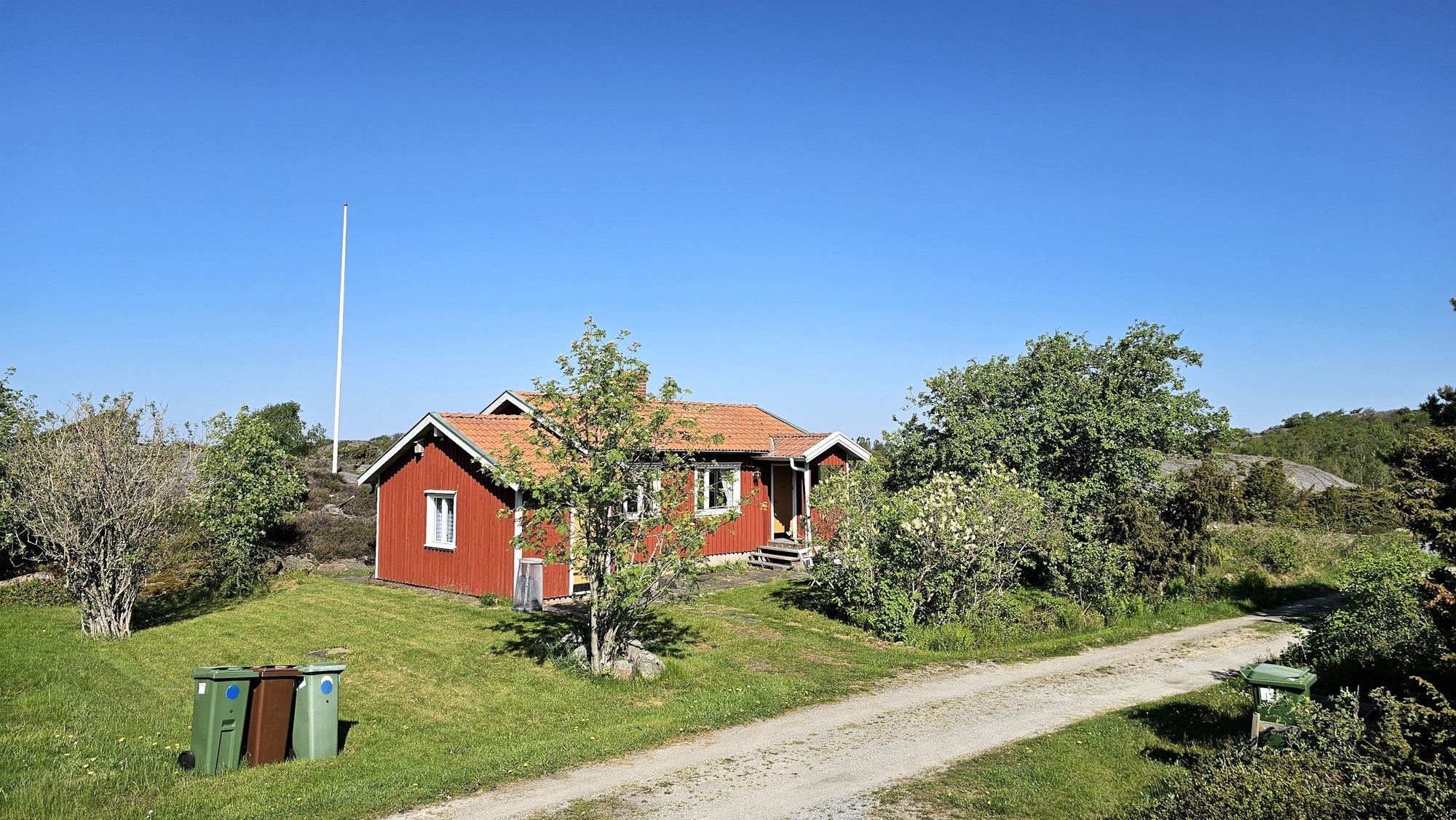 The plot offers a genuine Bohuslän atmosphere with heather, rocks, and a small pond just behind the house. Several outdoor seating areas are available, including classic wooden benches and a small outdoor kitchen where you can prepare simple meals. At the front, garden furniture with parasol and a barbecue invite you to spend long summer evenings in the sunset.