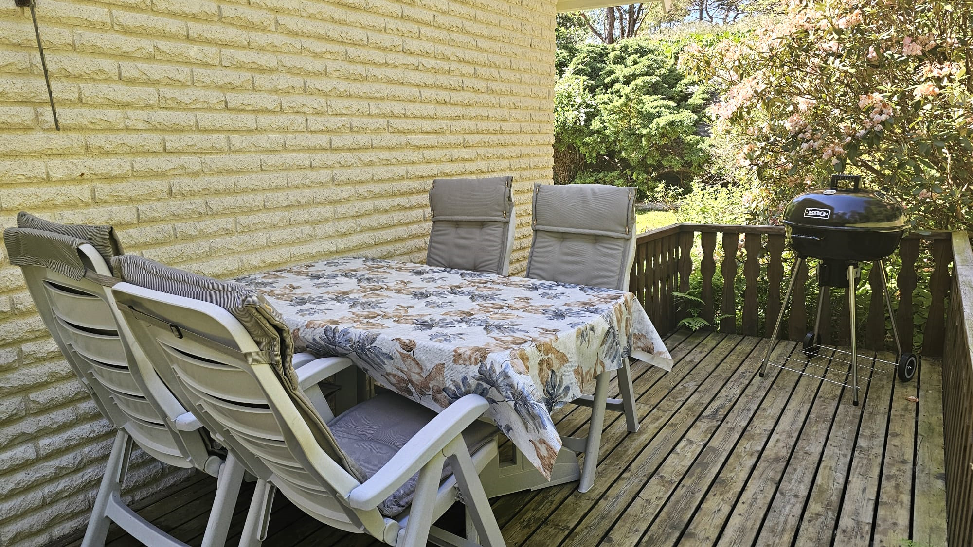 The large south-facing terrace offers sunshine from morning to evening, with a dining area, lounge furniture, and barbecue for wonderful summer evenings.