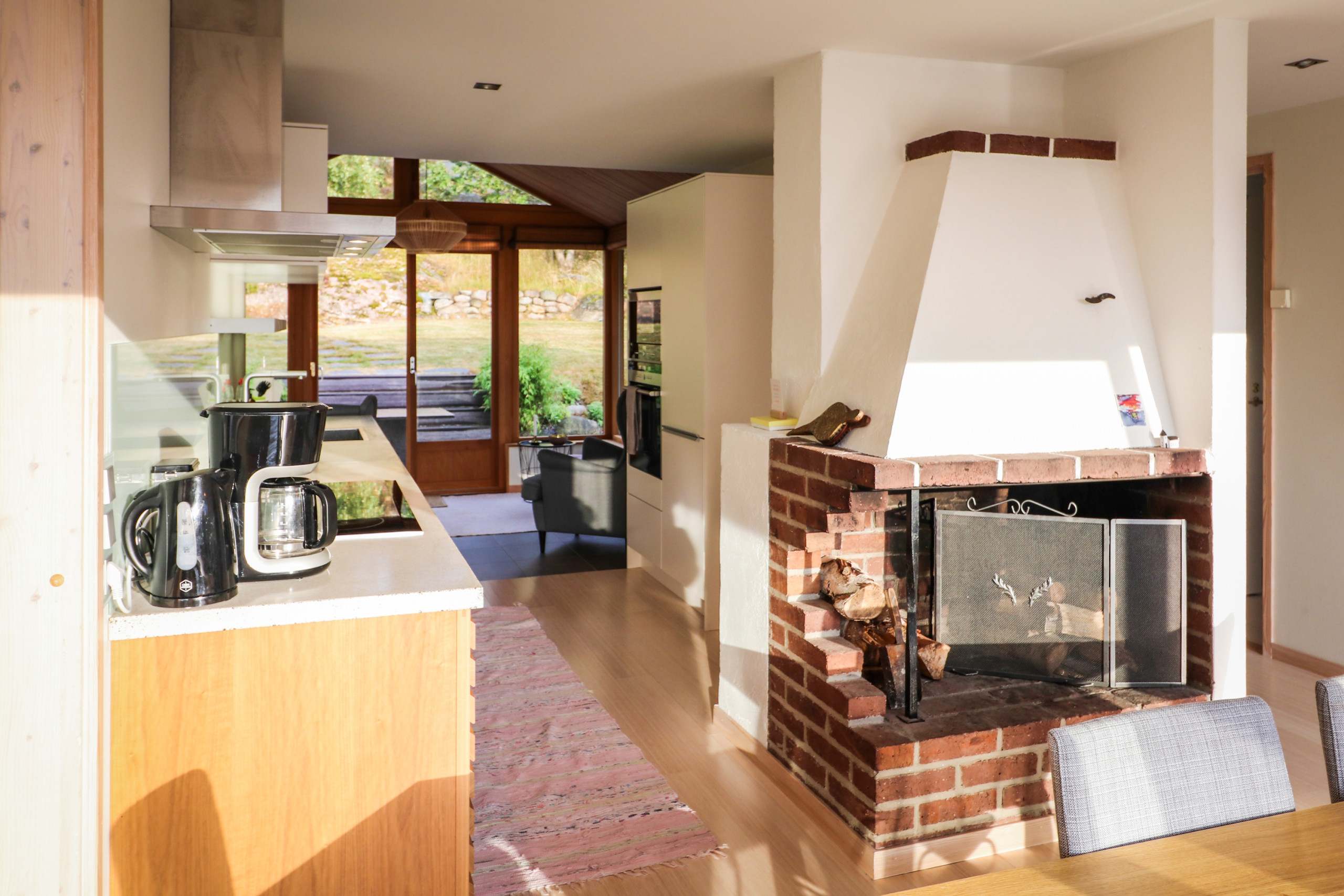 The villa is spacious and tastefully decorated with large windows, high ceilings, and an open floor plan that brings in the light and nature outside. It accommodates up to 6 people in three bedrooms – one with a double bed, one with two single beds, and a smaller one with a bunk bed. The kitchen is fully equipped with everything you need for enjoying holiday meals, and the dining area offers views of the terrace and the lush garden. The living room has a cozy sofa corner, a fireplace, and direct access to the terrace and pool area. The bathroom is fully tiled with shower, WC, and laundry facilities.