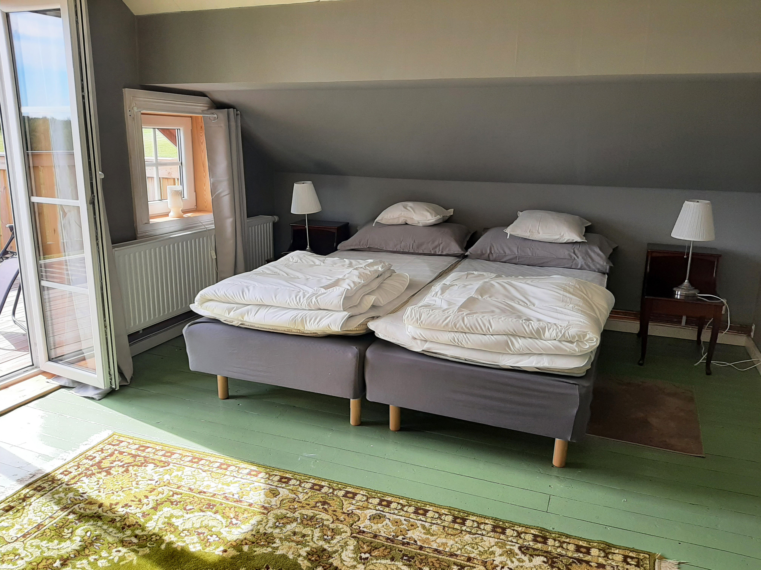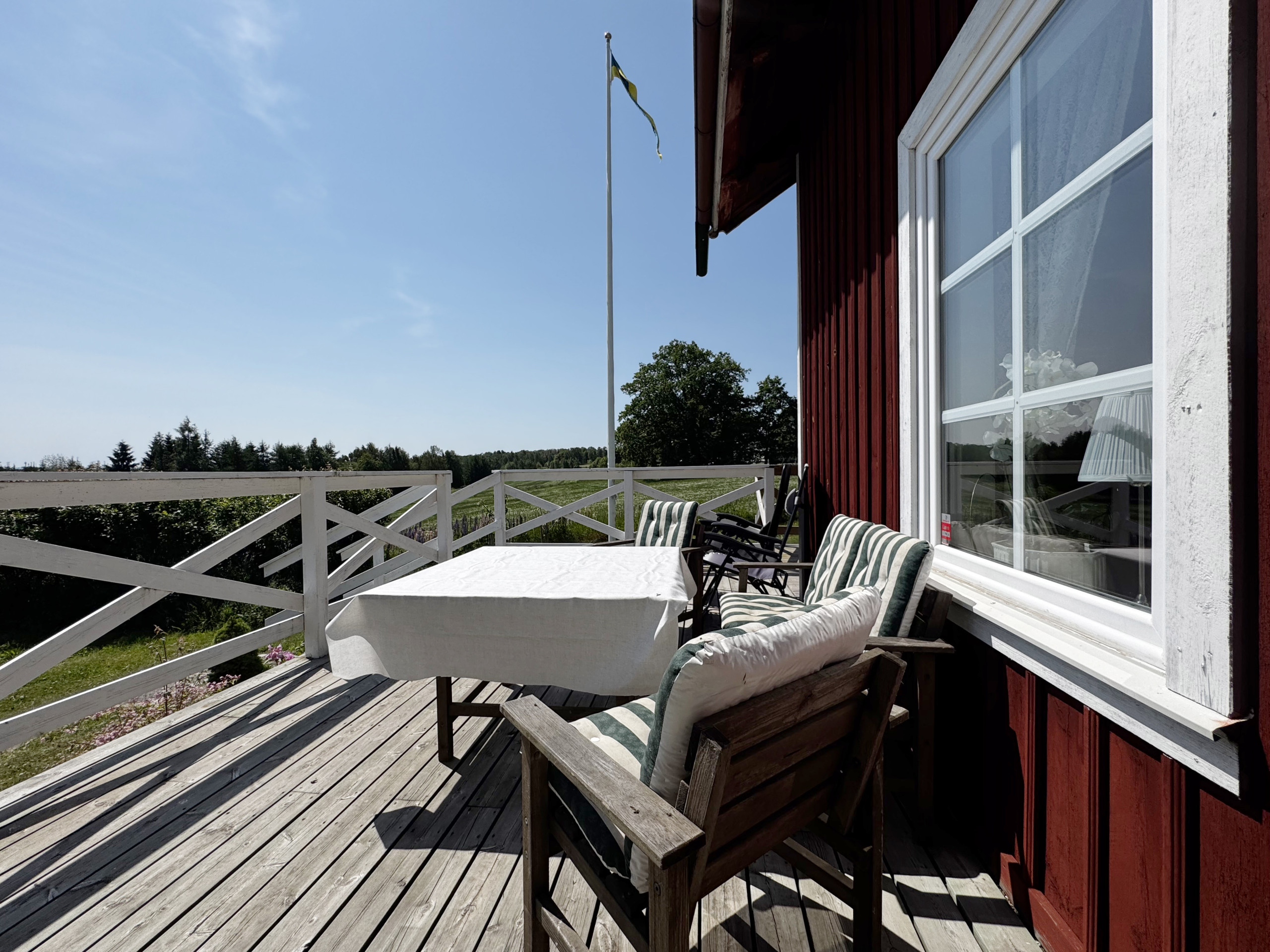 On the upper floor there is a walk-through room with three beds and a cozy bedroom with a double bed and direct access to a balcony with a sweeping view of the beautiful landscape – and in clear weather you can glimpse Lake Vättern in the distance.