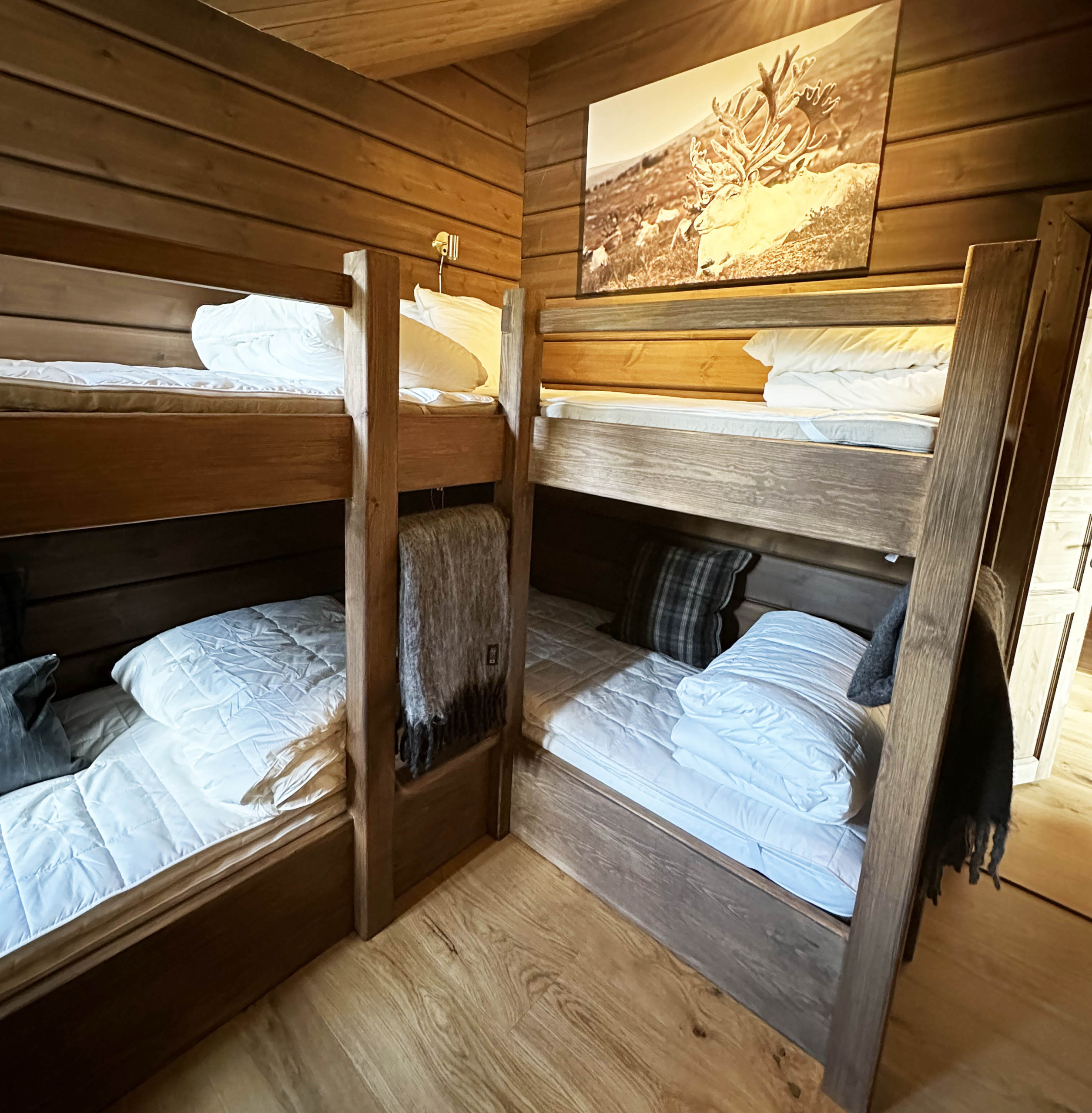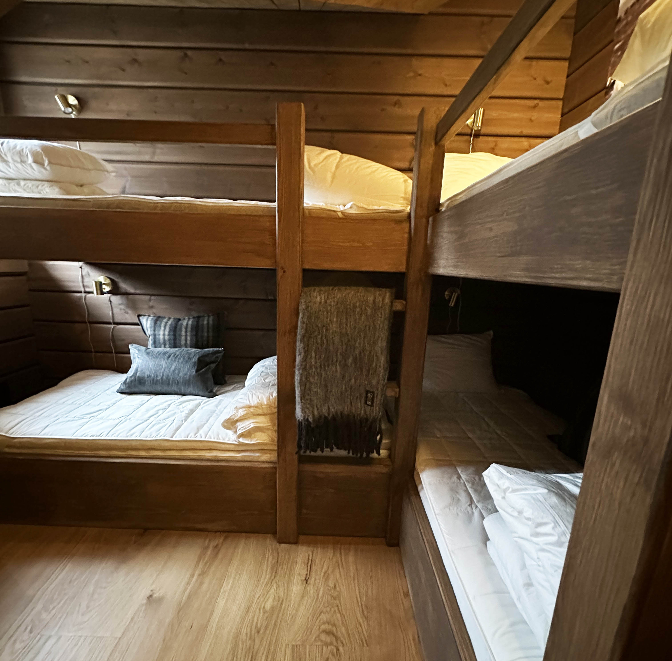The cabin has four bedrooms with a total of 11 beds, double bathrooms, sauna, living room, a big living room on the upper floor and a home office with a view. There is storage for skis and golf bags.