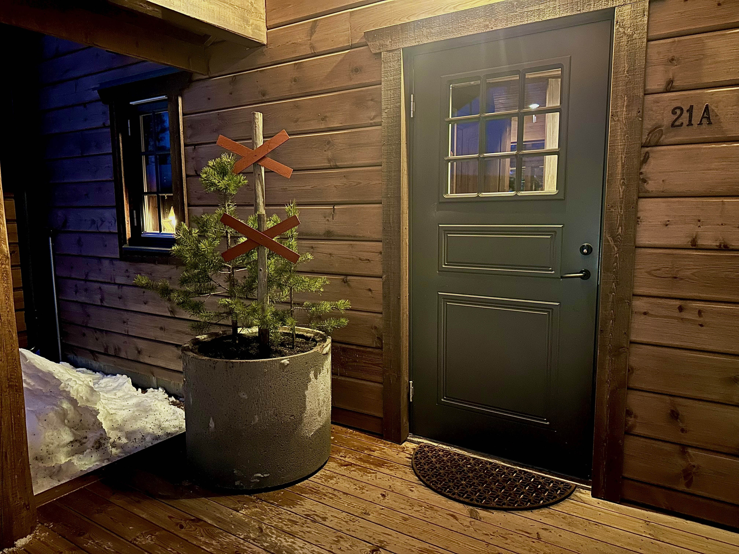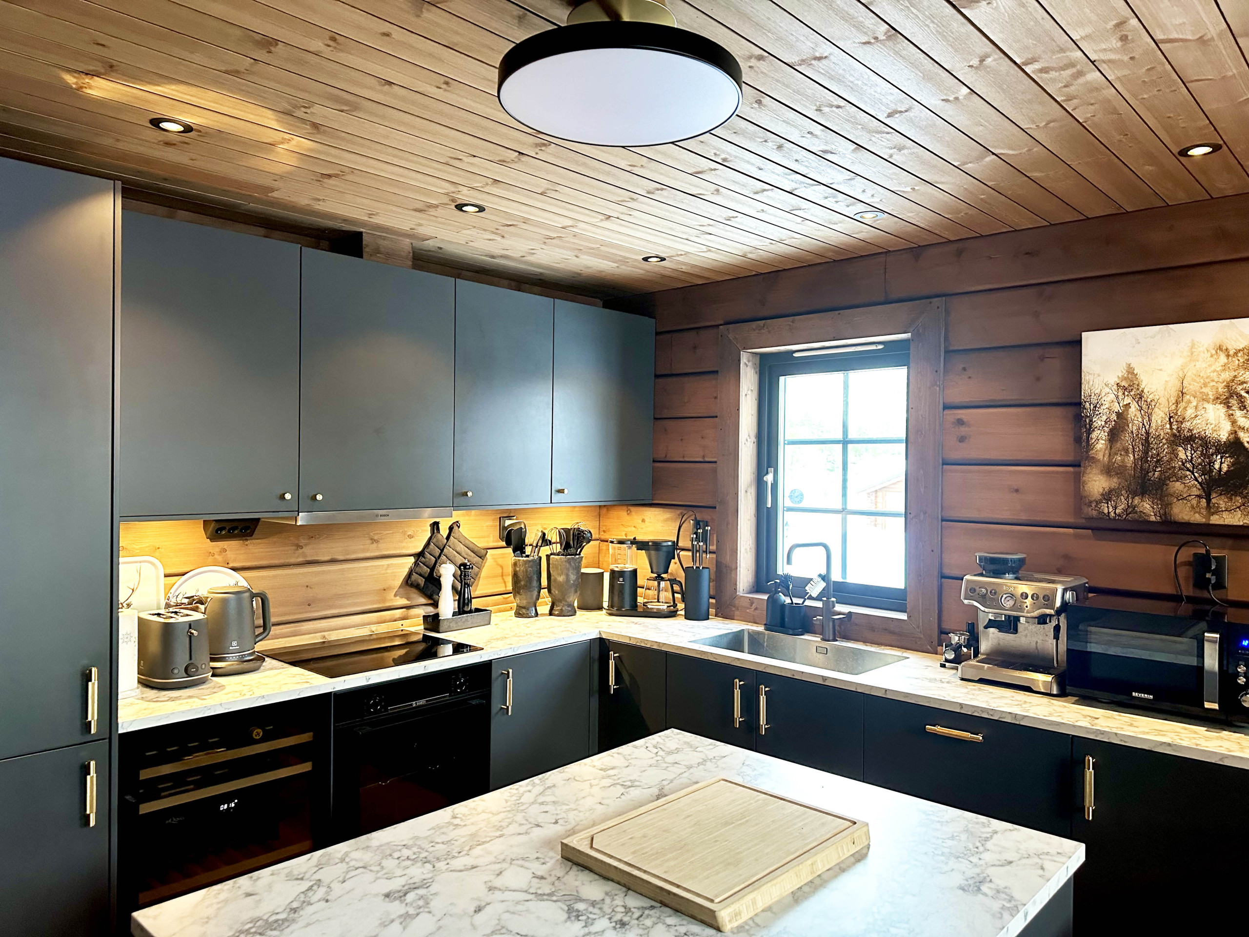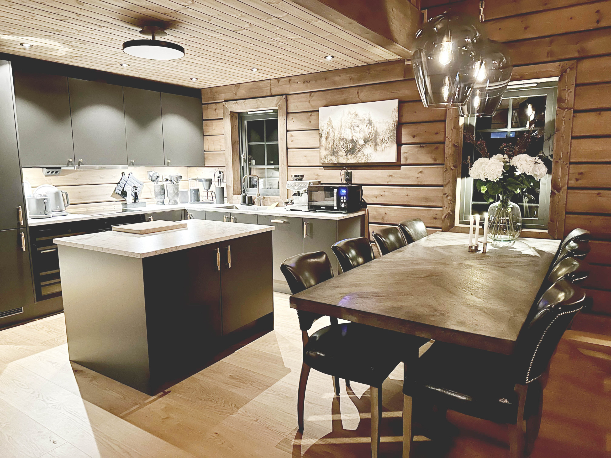 Varglyan is located on the mountain side in a south-west position with extensive views over the golf course and mountain peaks. Here you can enjoy the large living room's sofa in front of the fireplace, with 6-meter ceiling height and panoramic windows. The spacious cabin has a well thought out floor plan. The large social areas are perfect for the large family, group of friends or two or three families that can fit without problems. After dinner, the adults hang out in front of the fire while the children/young adults watch movies and play games upstairs.