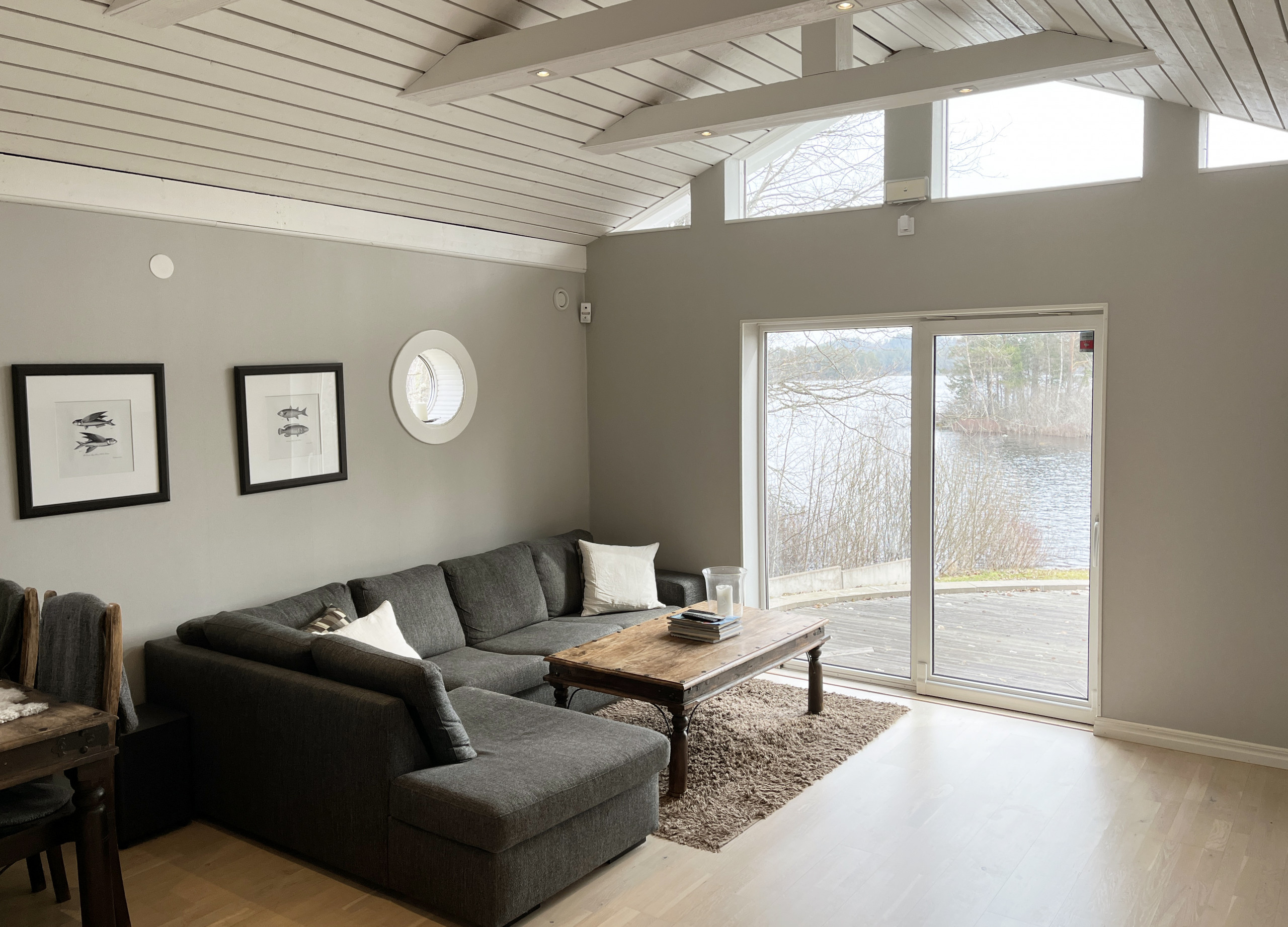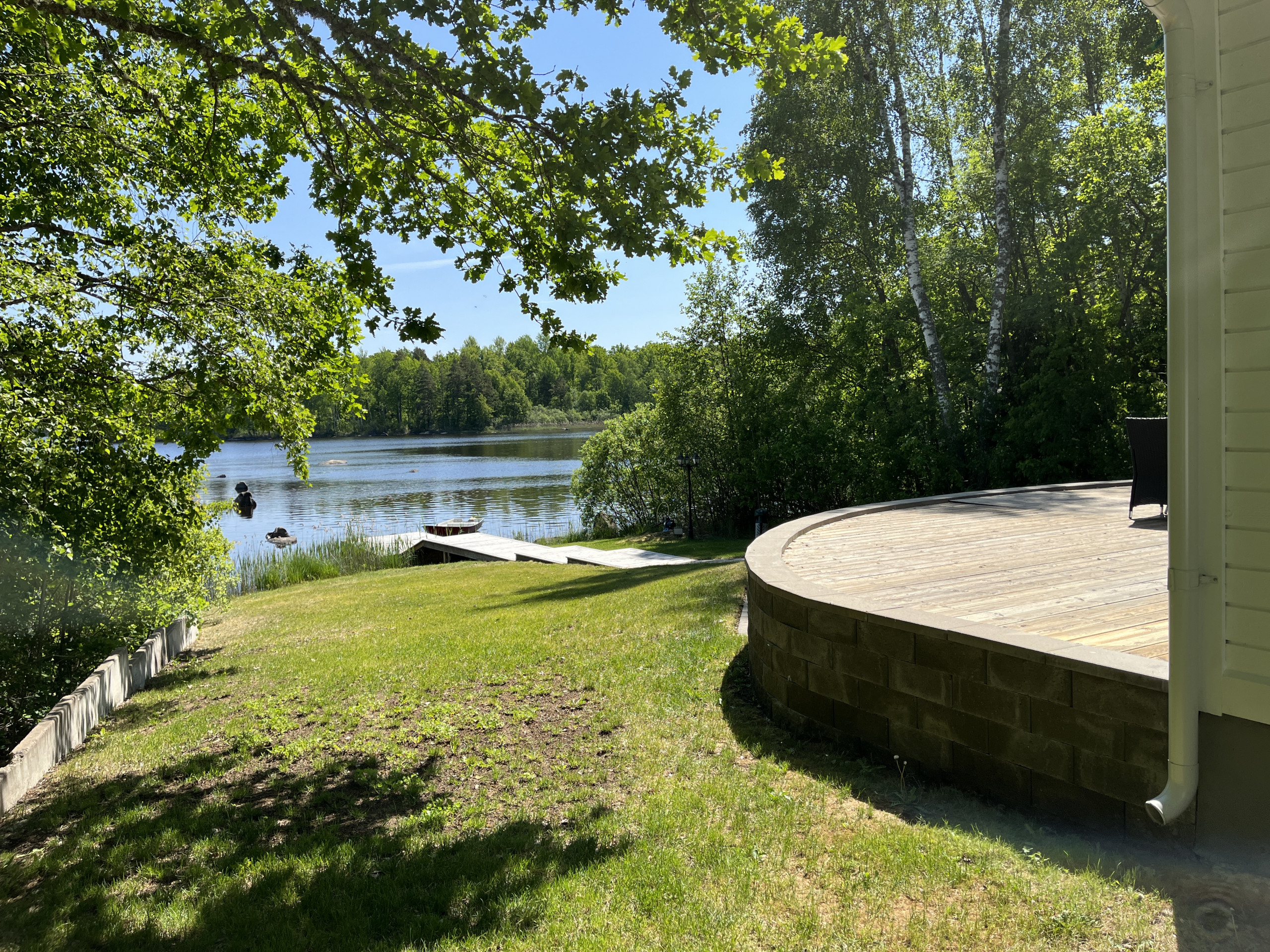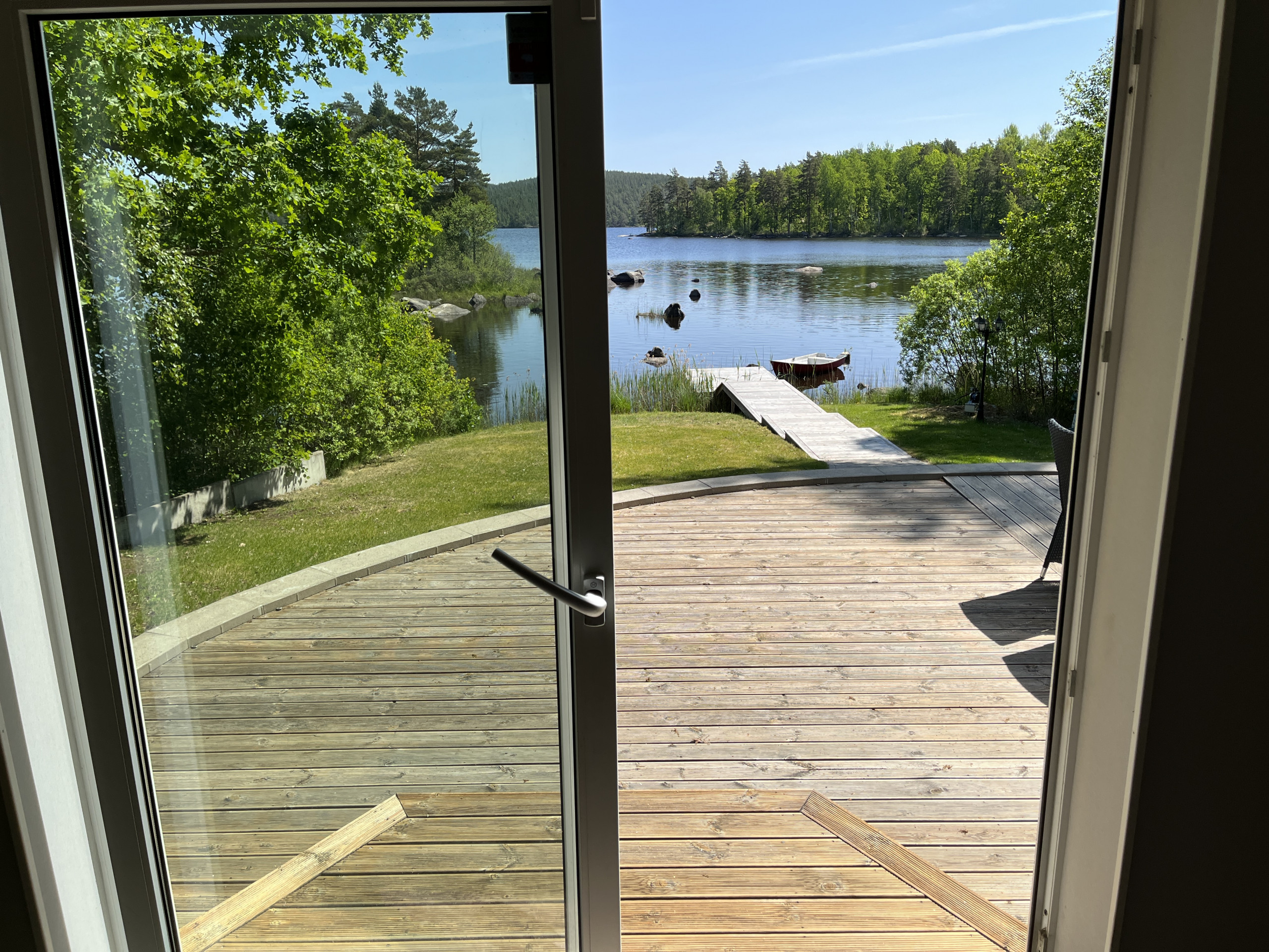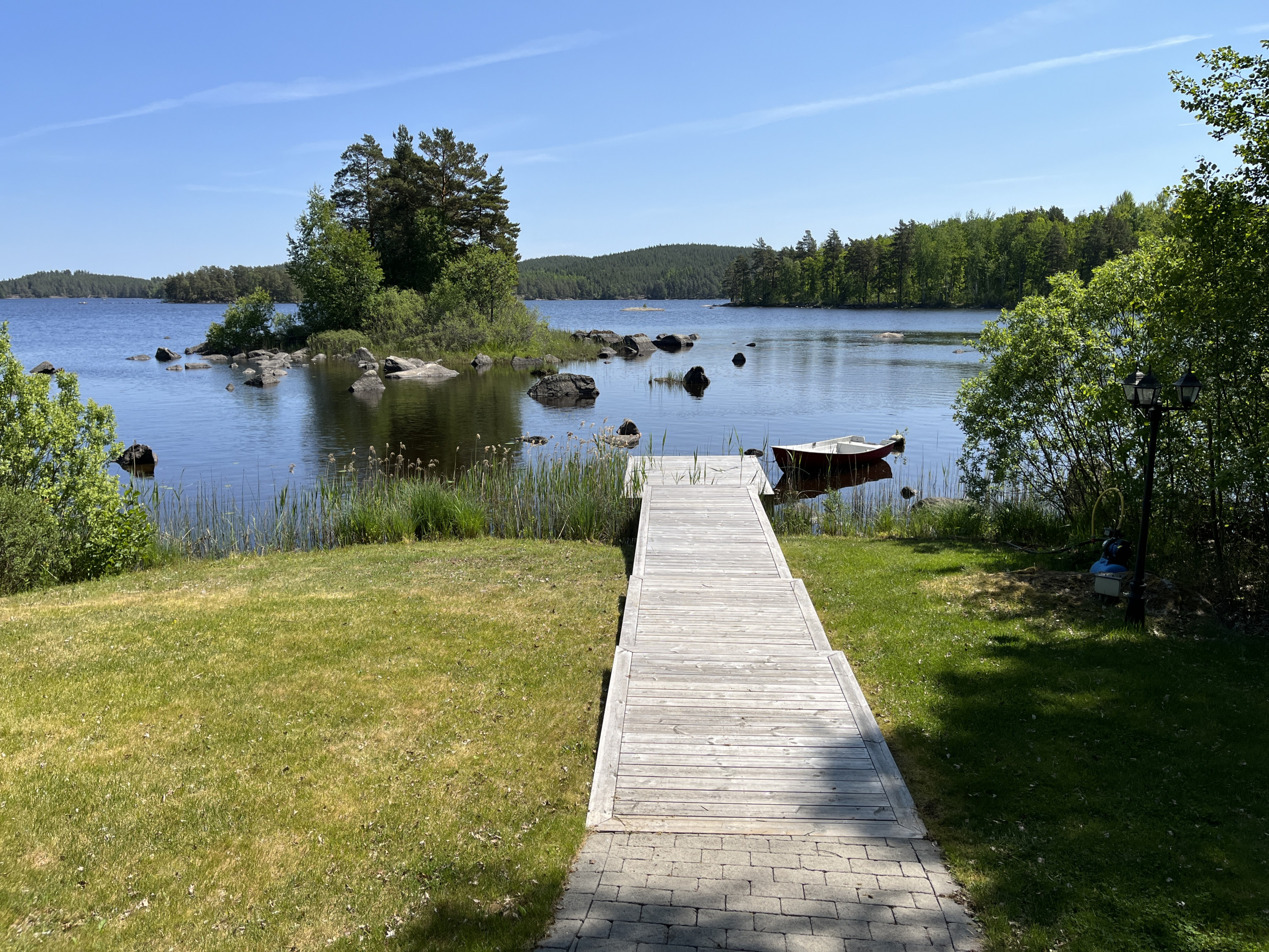 This nice and fresh cottage is located on a plot of land next to the nice lake Flaten in a quiet location. Here you have a nice place for really nice relaxation. Via the veranda you enter a hall where you can hang your clothes and to the left you will find the luxurious fully tiled bathroom which is equipped with both a shower and a toilet. Via the hall you reach the one bedroom which has a bunk bed with a lower bed of 120 cm and an upper bed of 80 cm and from the window you look out over the lake. Next to this bedroom is the practical kitchen, which is equipped with both stove, built-in oven, microwave and fridge/freezer. The living room is furnished with a comfortable sofa, a dining area and a small wood stove that you can light when needed. The roof is open to the ridge and has dimmable lighting to create a cozy atmosphere in the evenings. Via the openable glass door you reach the paved patio outside. In the larger bedroom you will find a double bed. Via the living room you reach a larger insulated glazed conservatory with a panoramic view of the lake. Here you can sit and admire the view of the lake as you sit and eat. This room also has dimmable spotlights in the ceiling. Via the openable glass doors, you come out to the large, paved patio, which is furnished with an outdoor furniture and a grill. Down by the lake, you have access to a rowing boat if you want to take a trip out on the lake to fish (fishing license required).