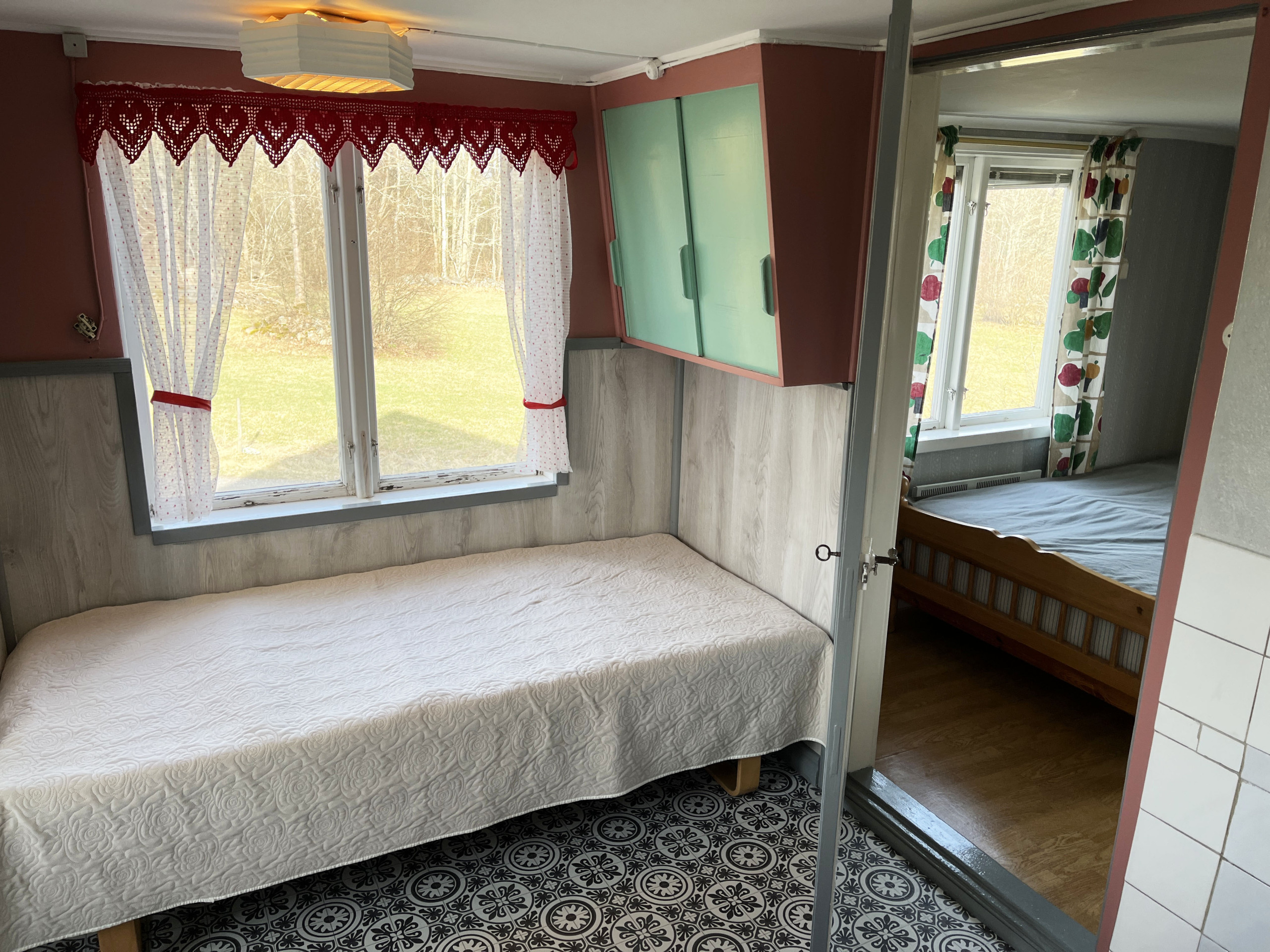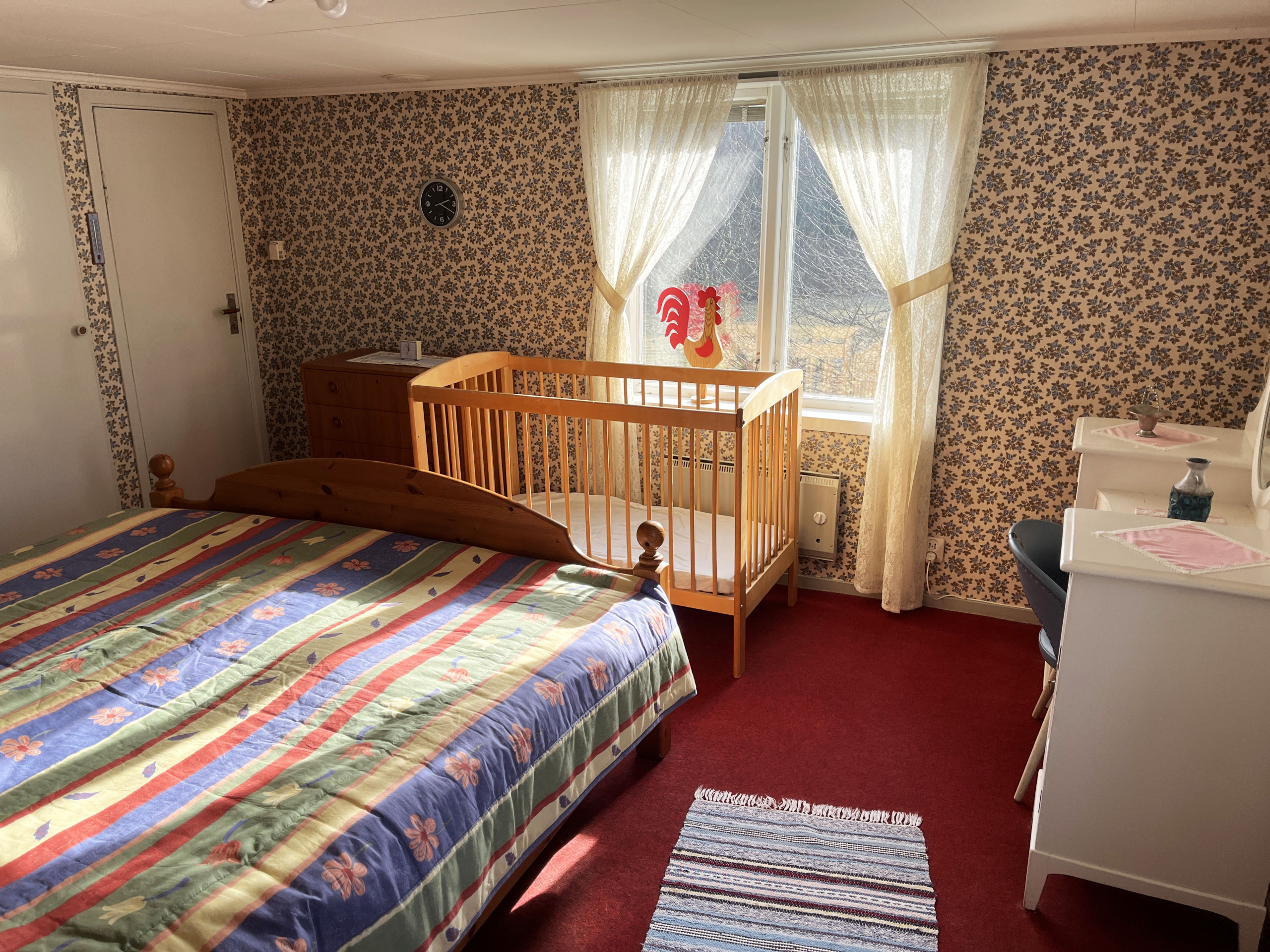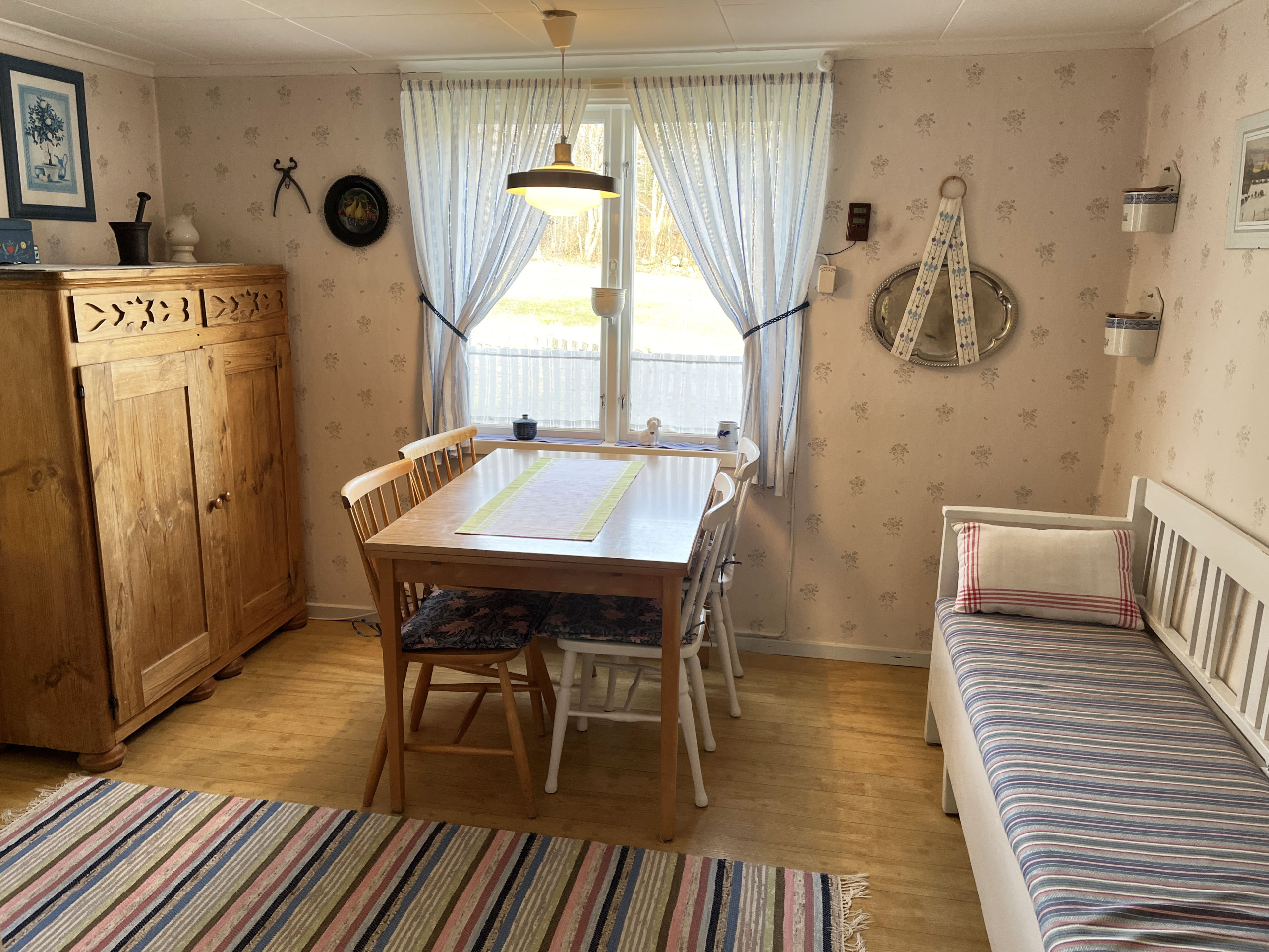 A little nice red cottage outside Virserum with a peaceful environment. When you enter the house, you enter a small hall. You then enter the kitchen with an adjacent dining room. In the living room, you can sit and cozy up in front of the small wood-burning stove. Upstairs you will find four bedrooms where there is a double bed in one of them and a single bed each in the other three. Two of the rooms are walk-through rooms. The bathroom is also located upstairs. The house is located in a nice and beautiful environment with proximity to a nice bathing lake.