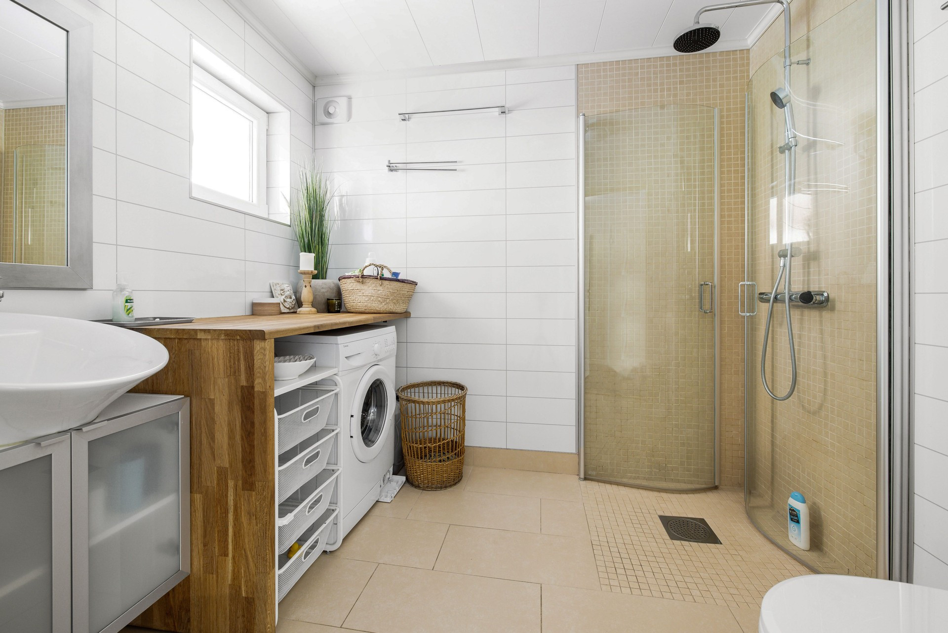 The large kitchen with room for many people features recycled joinery from Lidhult, a joinery in Småland that manufactures solid wooden kitchens. In addition to the induction hob in the modern electric stove, there is the possibility of cooking on the newly installed wood stove. In addition to the fridge and freezer in the kitchen, the basement can be used for cooler storage and the large pantry keeps the temperature cool during the colder seasons.
