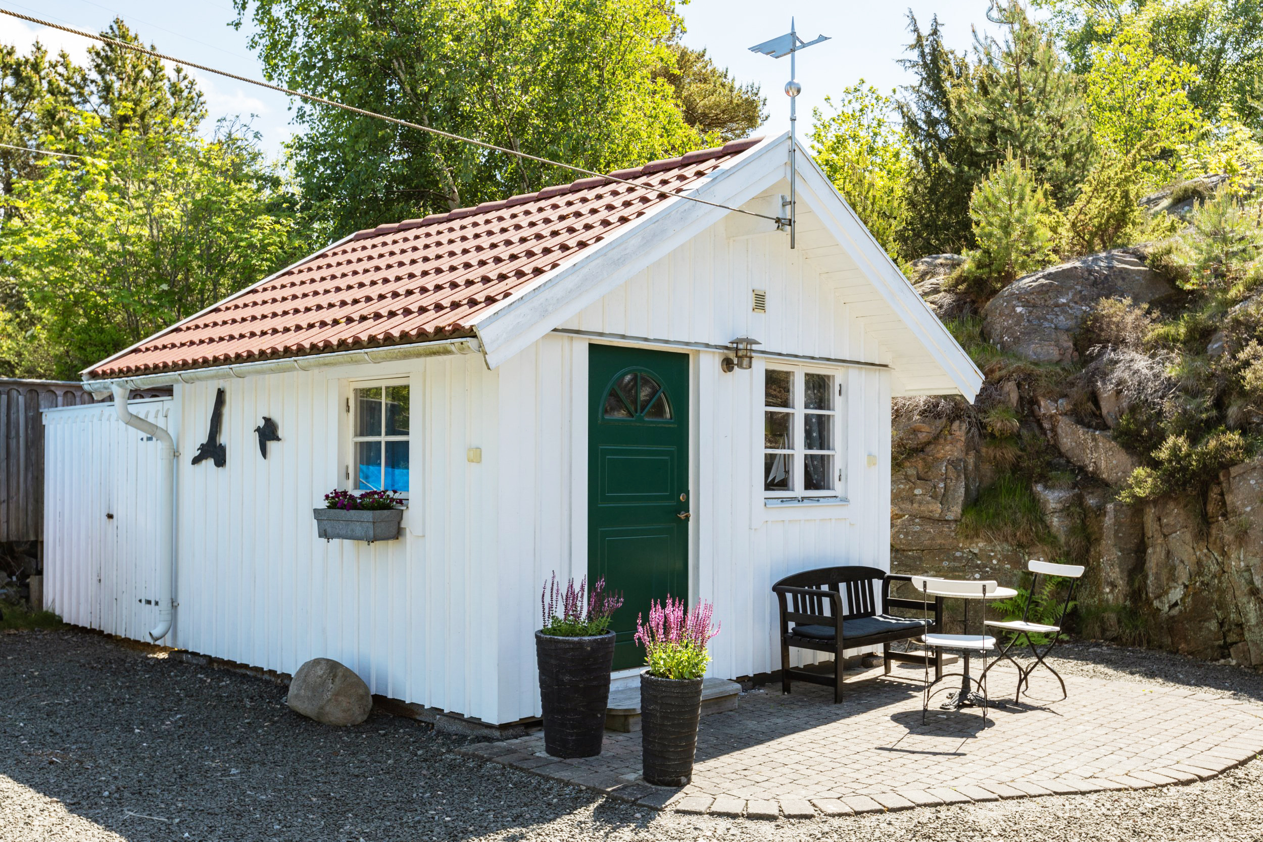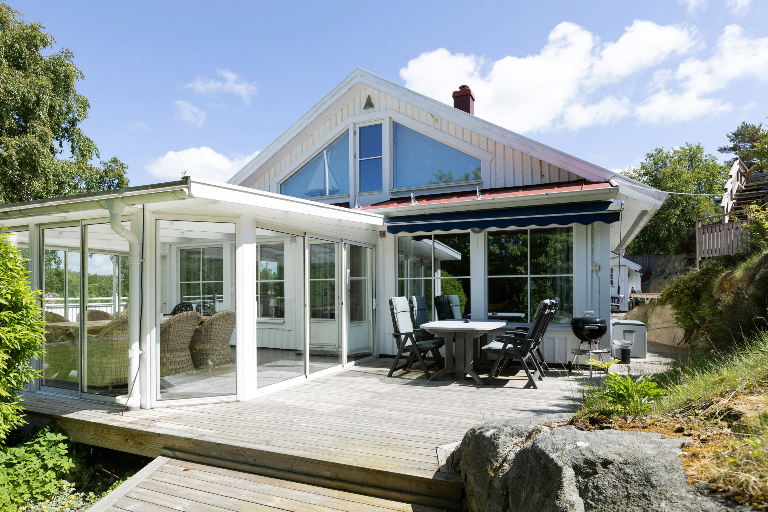 Welcome to this high standard holiday home in southern Bohuslän. The first floor has a modern well-equipped kitchen with large work areas. A large bathroom and next to it a laundry room with washing machine and dryer. Here is the main entrance with direct access to the annex that has two comfortable beds. Next to the kitchen is the bright living room with quality furniture, here there also is a fireplace for nice relaxing evenings. From here you go out into the glazed terrace with a dining area for the whole family. Upstairs is the master bedroom with a luxurious king-size bed and a fantastic view of the cliffs, as well as a living room that has 2-3 beds. In the private garden there is an open terrace, outdoor furniture and barbecue. The house is located at the end of the street in a quiet idyll surrounded by beautiful nature and Bohus granite. On the rocks on the plot, you have a fantastic view of the surroundings with magical sunsets. A short walk takes you down to the bathing area for salty swimming and exciting fishing excursions.