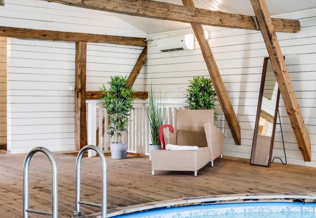 Large and fully equipped kitchen which with the open floor plan extends over to the dining room where the large dining table holds space for all of you to enjoy all meals of the day. You have access to a total of three large bathrooms with shower facilities, two of which are in the pool house. There is also a guest toilet in the main building.
