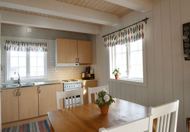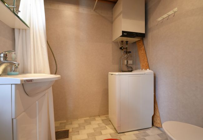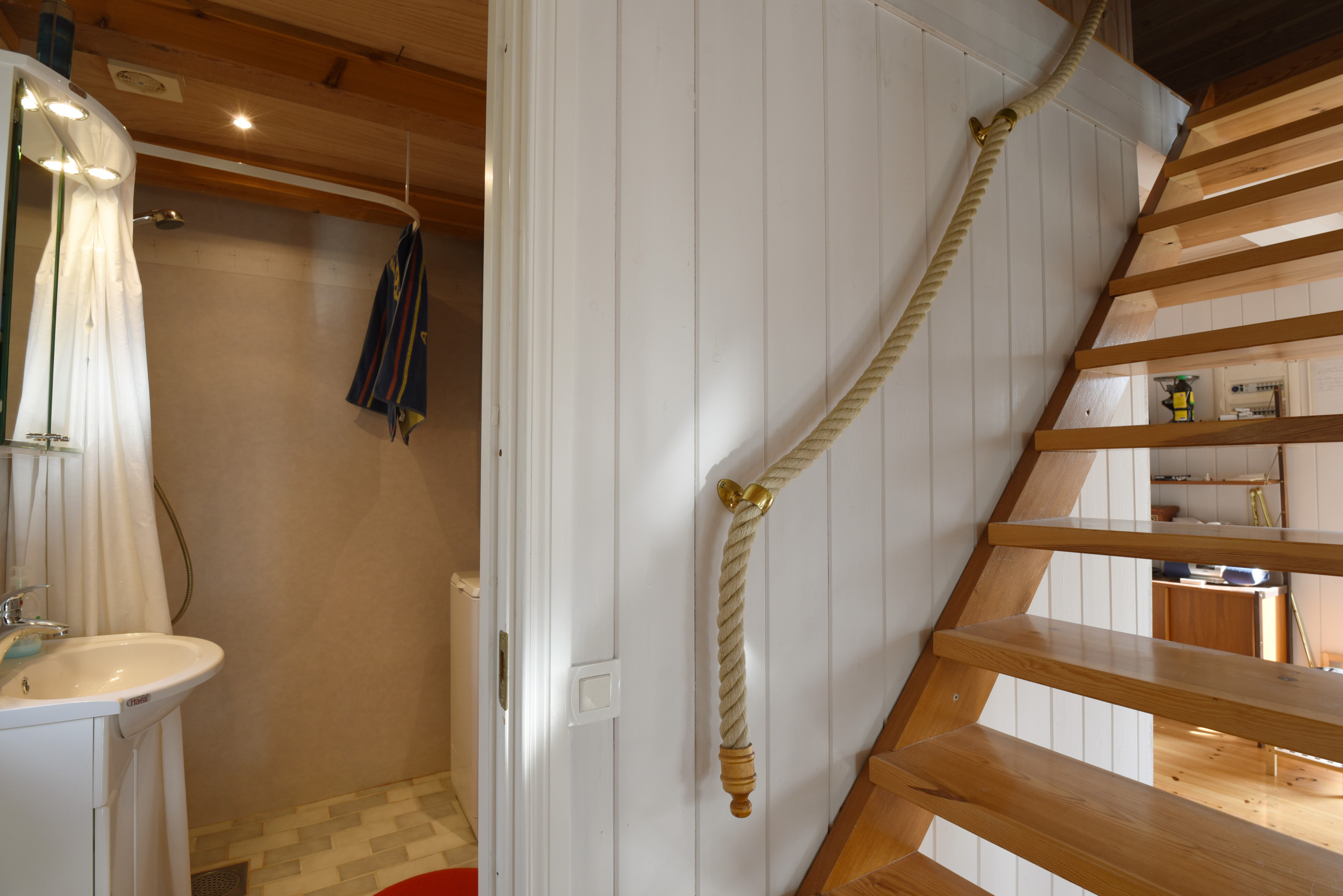 The kitchen and living room have an open floor plan with plenty of light. On the first floor you have one of the bedrooms with a single bed and here there is also a bathroom with a shower. A staircase leads you up to the second floor, where you will find a bedroom with a double bed and a single bed. The next bedroom upstairs has three single beds.