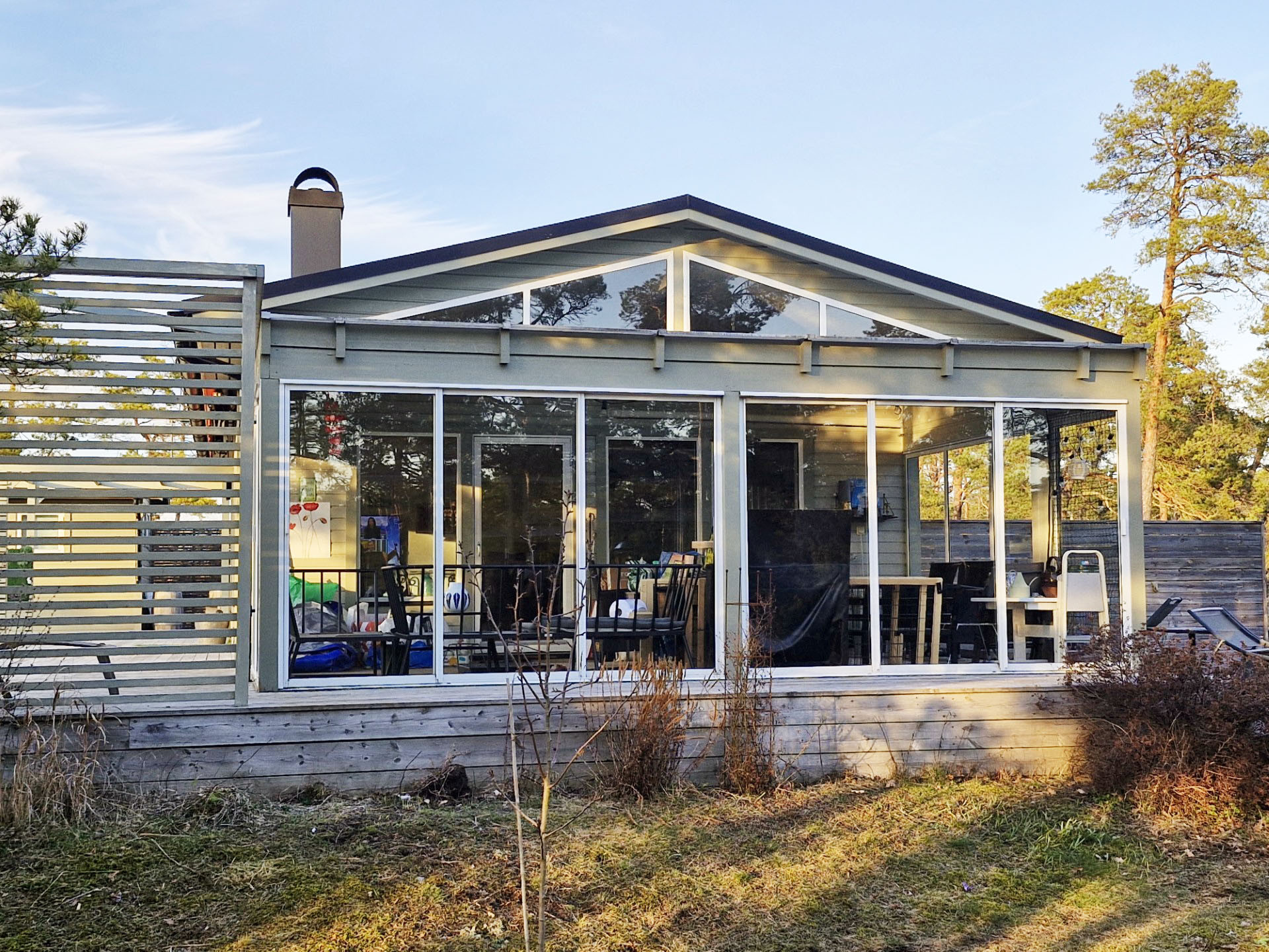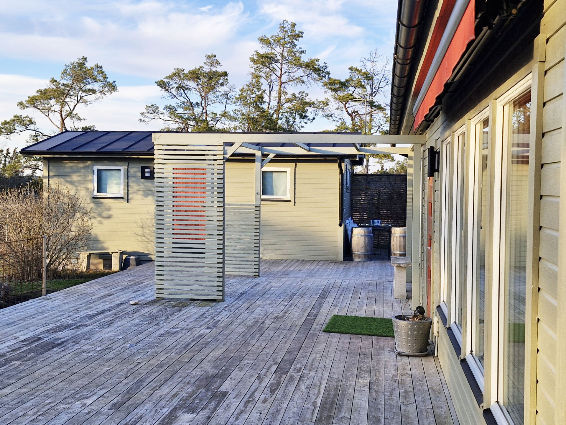 The house features an open-plan layout with a bright living room and kitchen that connect to a glass-enclosed veranda – the perfect spot to enjoy nature in any weather. From the veranda, step out onto the generous 100 sqm wooden terrace, ideal for soaking up the sun on warm days.