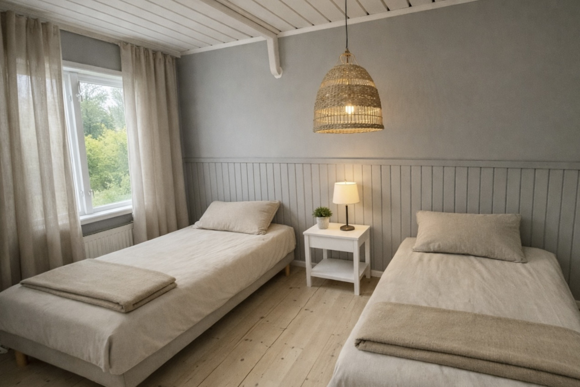 The house offers modern and homely accommodation with a cozy fireplace that creates a warm and inviting atmosphere all year round. There are two bedrooms - one with a double bed and one with two single beds. In addition, there is a separate sleeping area with a curtain and a sofa bed suitable for an adult and a child.